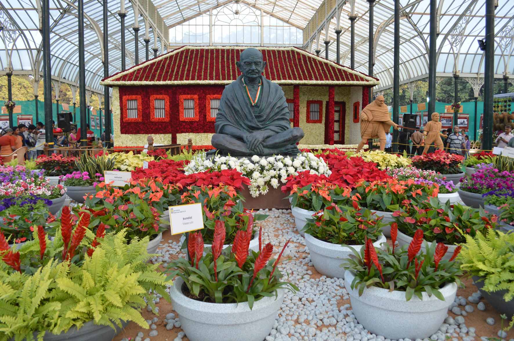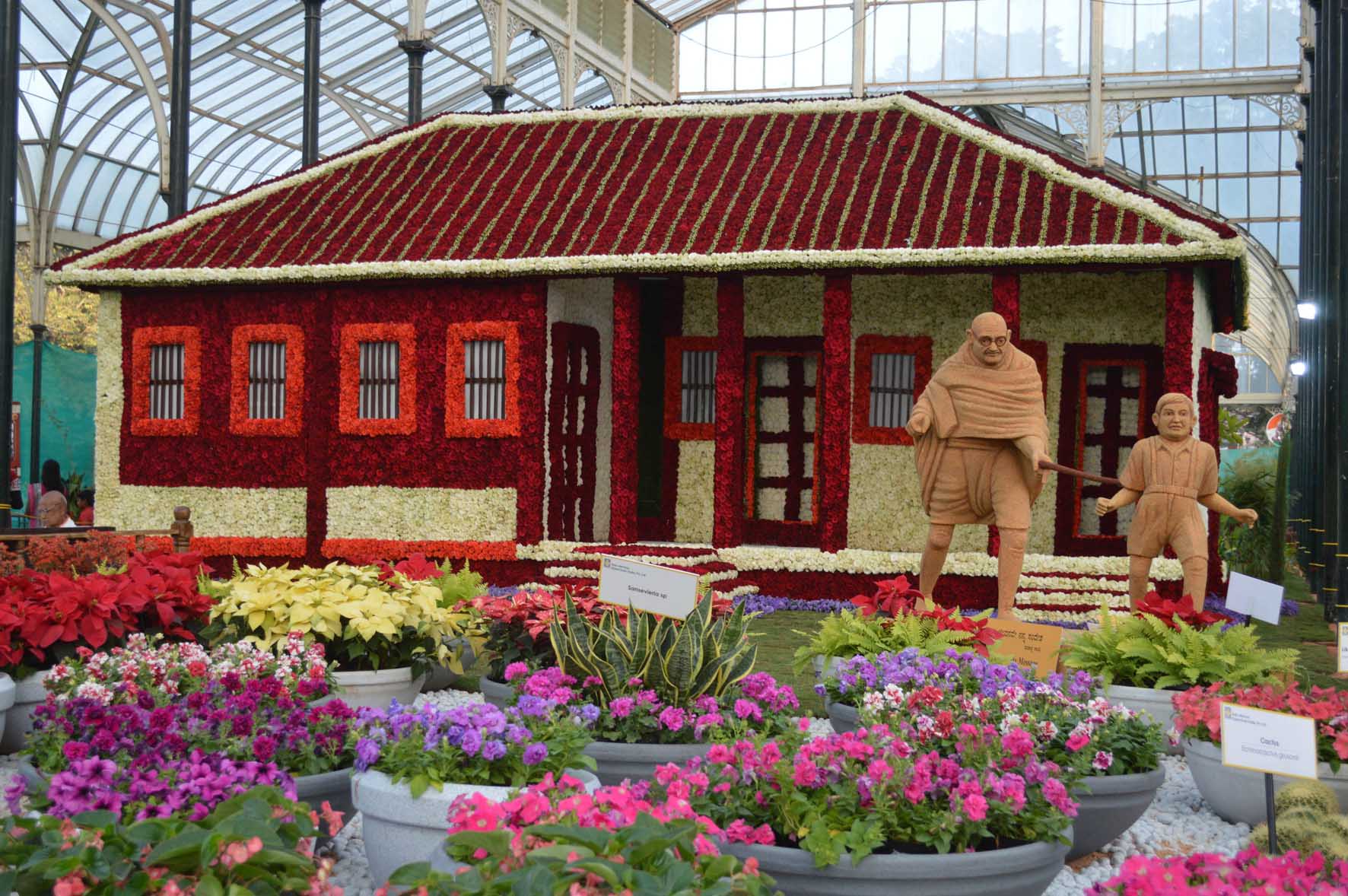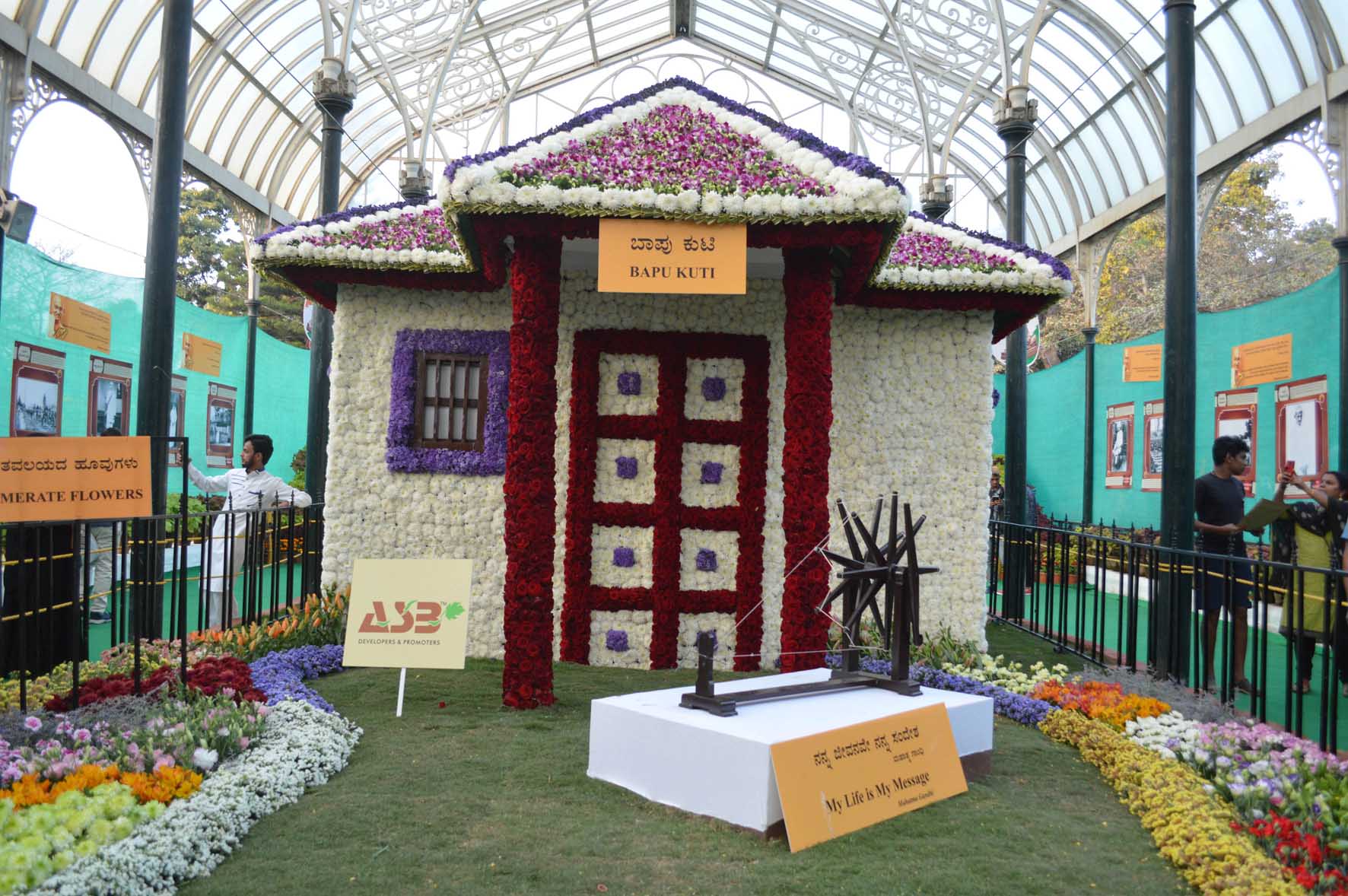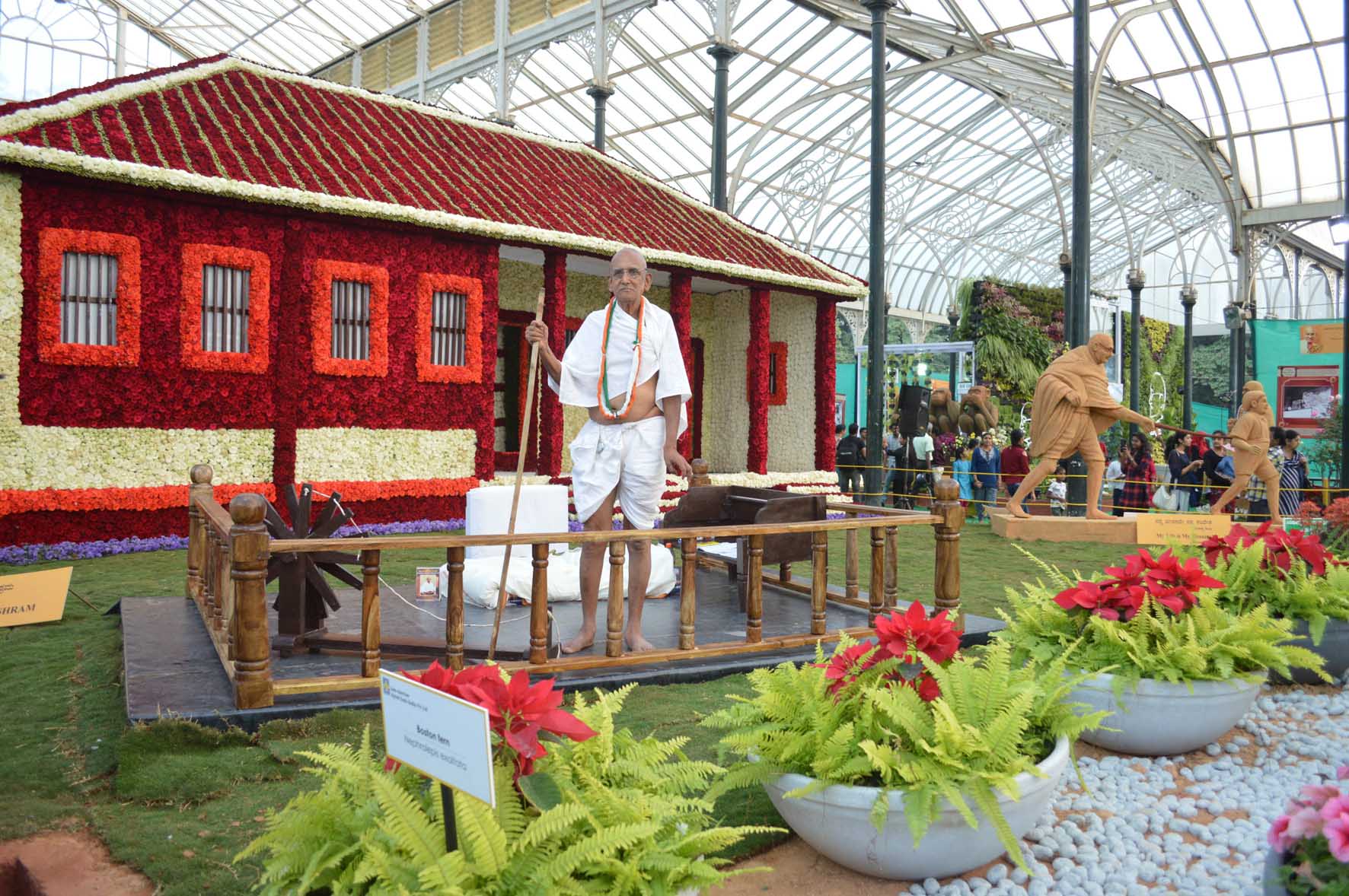 ಕೆಂಪು-ಶ್ವೇತವರ್ಣದ ಸಬರಮತಿ ಆಶ್ರಮ, ಅದರ ಮುಂದೆ ಧ್ಯಾನಸ್ಥರಾಗಿ ಕೂತ ಬಾಪು, ದಂಡಿ ಸತ್ಯಾಗ್ರಹ, ಬಾಪು ಮನೆ, ರಾಜಘಾಟ್ ಸೇರಿದಂತೆ ಗಾಂಧಿಯ ಹುಟ್ಟಿನಿಂದ ಅಂತ್ಯದವರೆಗಿನ ವಿವಿಧ ಚಿತ್ರಣಗಳನ್ನು ಇಲ್ಲಿನ ಗಾಜಿನ ಮನೆಯಲ್ಲಿ ಹೂಗಳ ಮೂಲಕ ಅರಳಿಸಲಾಗಿದ್ದು, ಶುಕ್ರವಾರ ಮುಖ್ಯಮಂತ್ರಿ ಕುಮಾರಸ್ವಾಮಿ ಅದಕ್ಕೆ ಚಾಲನೆ ನೀಡಿ, ಪುಷ್ಪಪ್ರದರ್ಶನ ಕಂಡು ಆಶ್ಚರ್ಯ ವ್ಯಕ್ತಪಡಿಸಿದರು.
