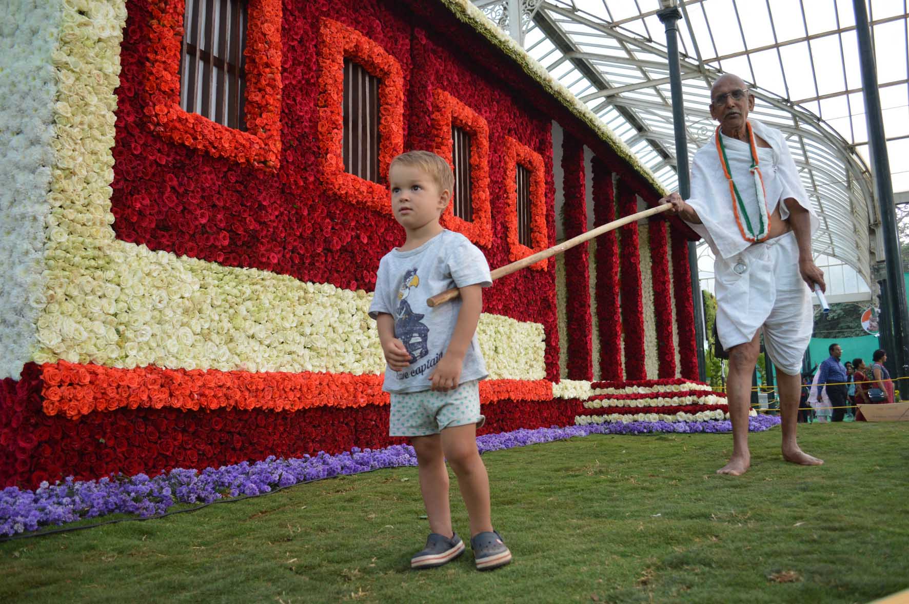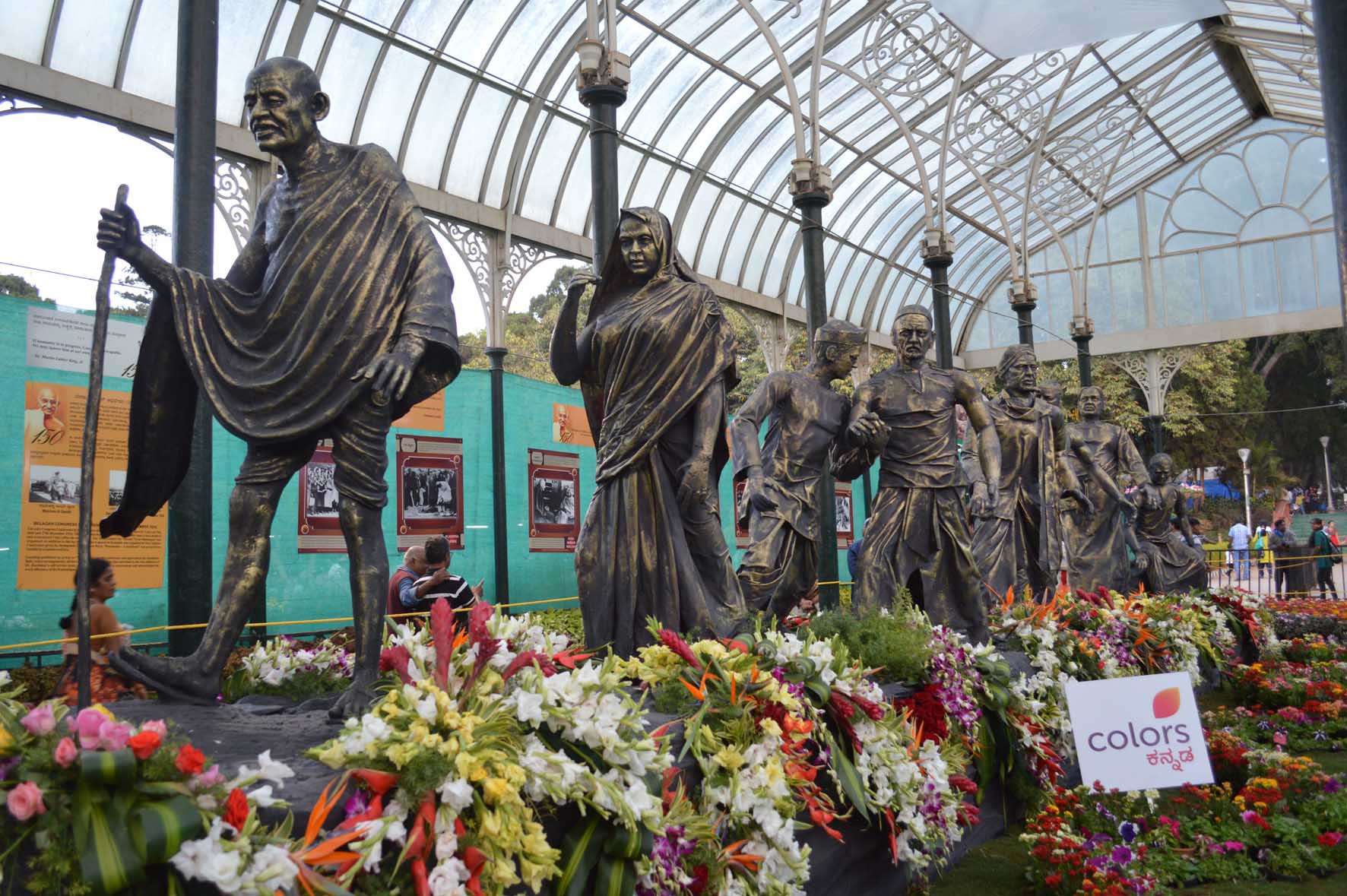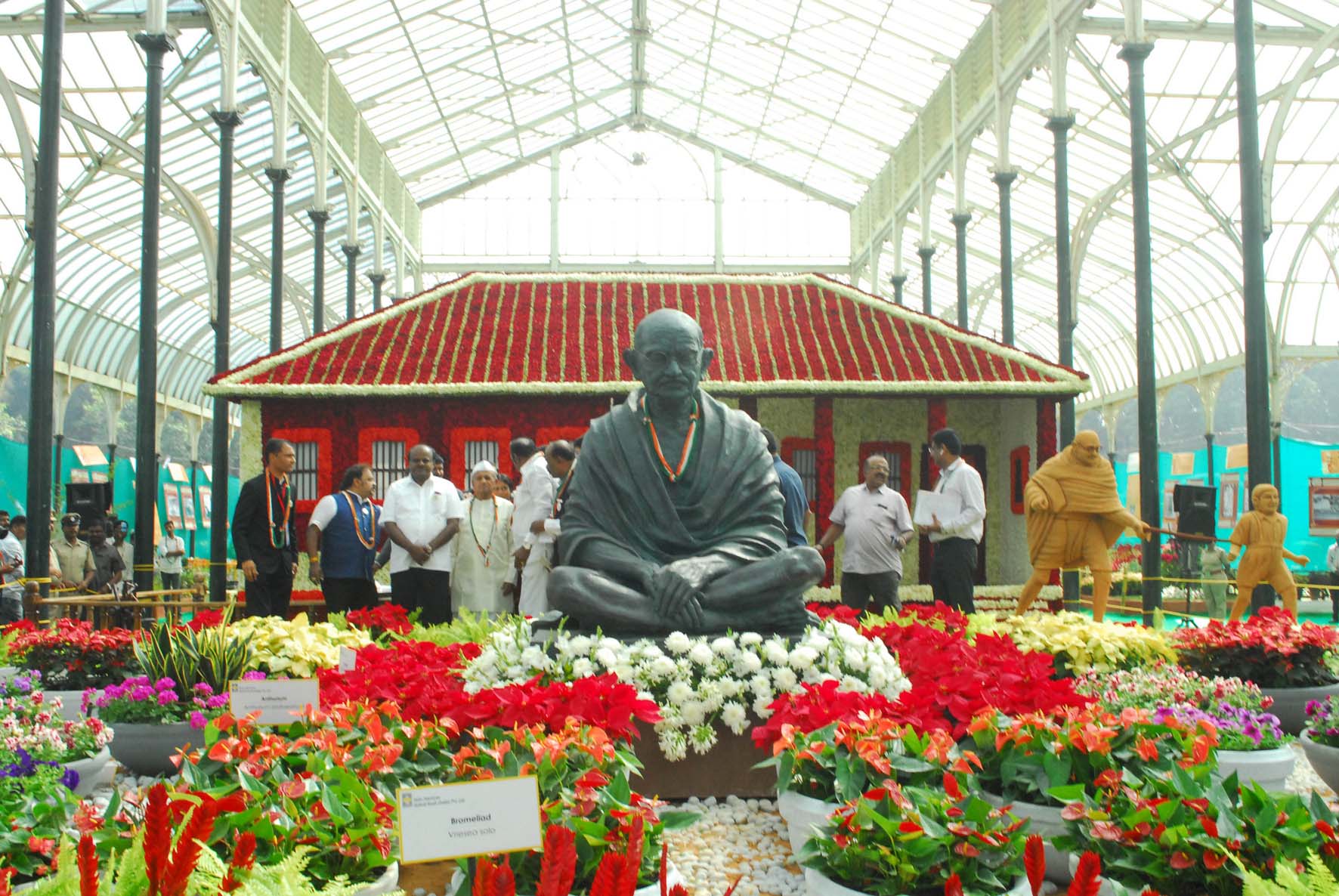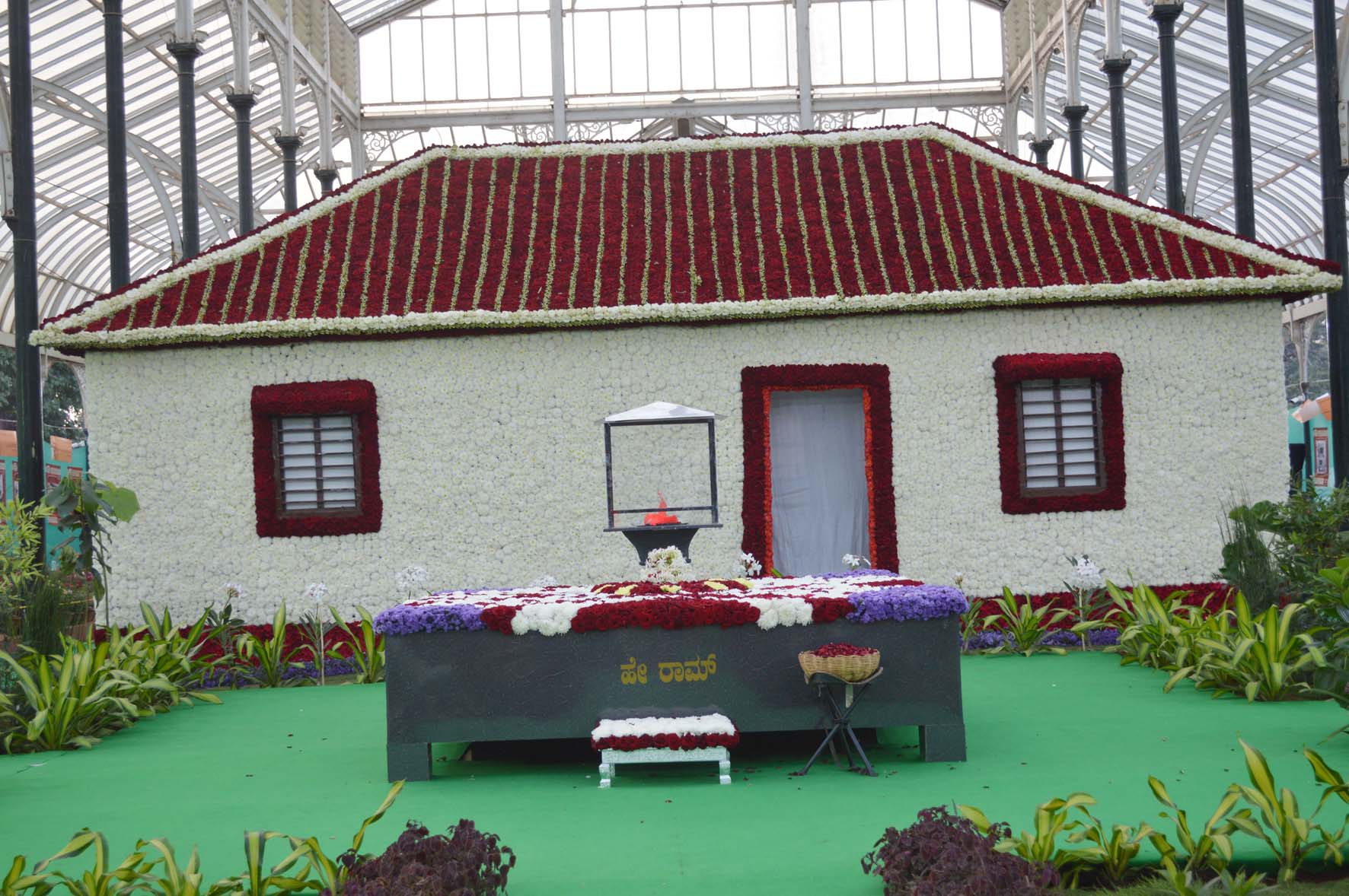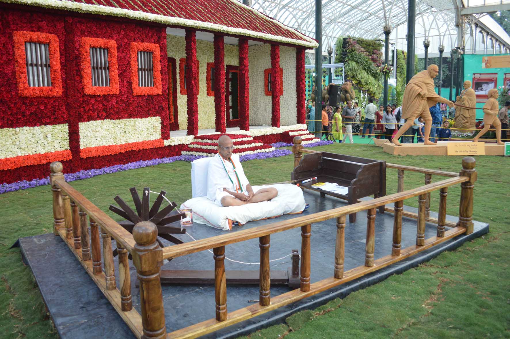 ಕೆಂಪು-ಶ್ವೇತವರ್ಣದ ಸಬರಮತಿ ಆಶ್ರಮ, ಅದರ ಮುಂದೆ ಧ್ಯಾನಸ್ಥರಾಗಿ ಕೂತ ಬಾಪು, ದಂಡಿ ಸತ್ಯಾಗ್ರಹ, ಬಾಪು ಮನೆ, ರಾಜಘಾಟ್ ಸೇರಿದಂತೆ ಗಾಂಧಿಯ ಹುಟ್ಟಿನಿಂದ ಅಂತ್ಯದವರೆಗಿನ ವಿವಿಧ ಚಿತ್ರಣಗಳನ್ನು ಇಲ್ಲಿನ ಗಾಜಿನ ಮನೆಯಲ್ಲಿ ಹೂಗಳ ಮೂಲಕ ಅರಳಿಸಲಾಗಿದ್ದು, ಶುಕ್ರವಾರ ಮುಖ್ಯಮಂತ್ರಿ ಕುಮಾರಸ್ವಾಮಿ ಅದಕ್ಕೆ ಚಾಲನೆ ನೀಡಿ, ಪುಷ್ಪಪ್ರದರ್ಶನ ಕಂಡು ಆಶ್ಚರ್ಯ ವ್ಯಕ್ತಪಡಿಸಿದರು.