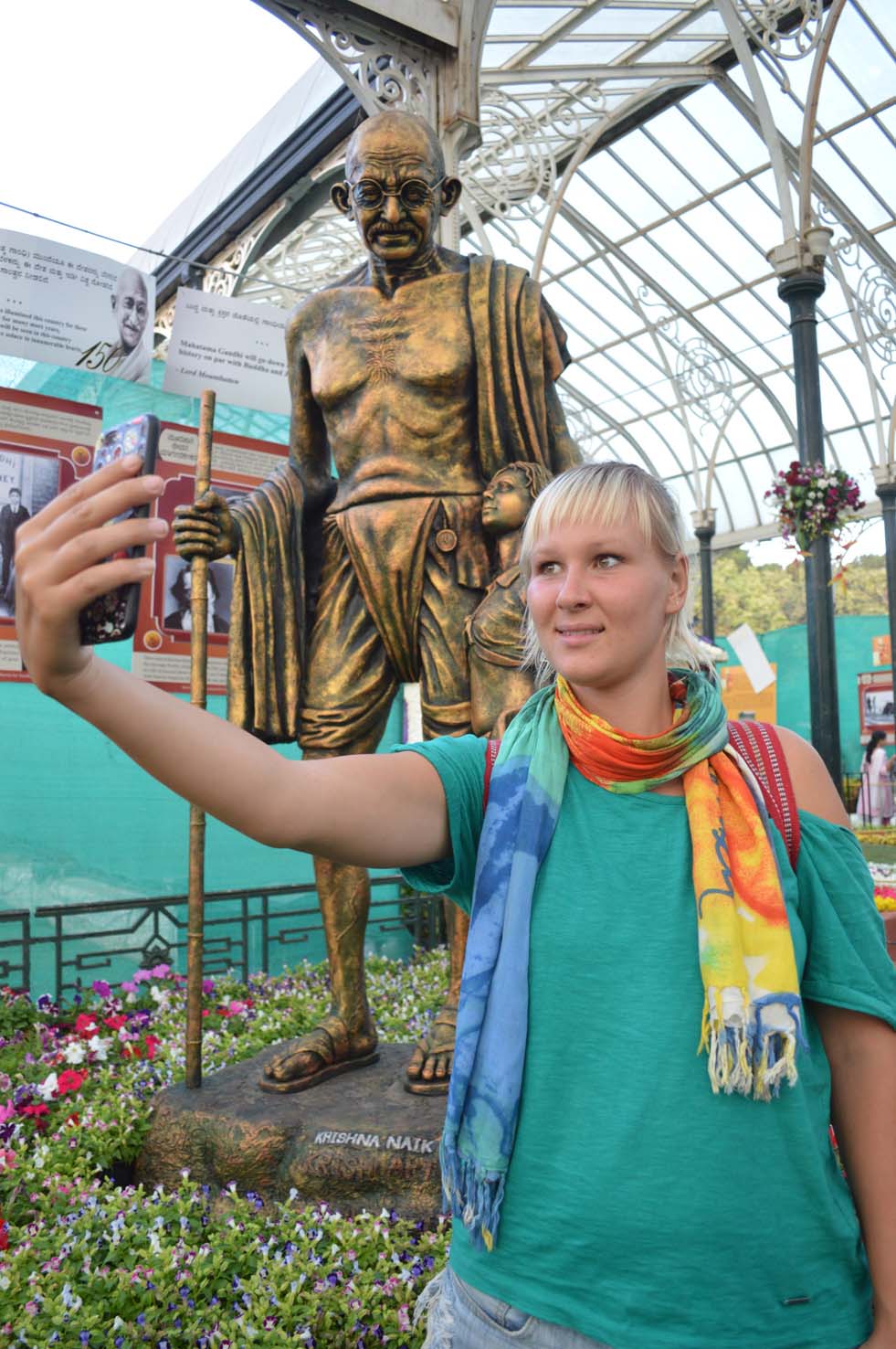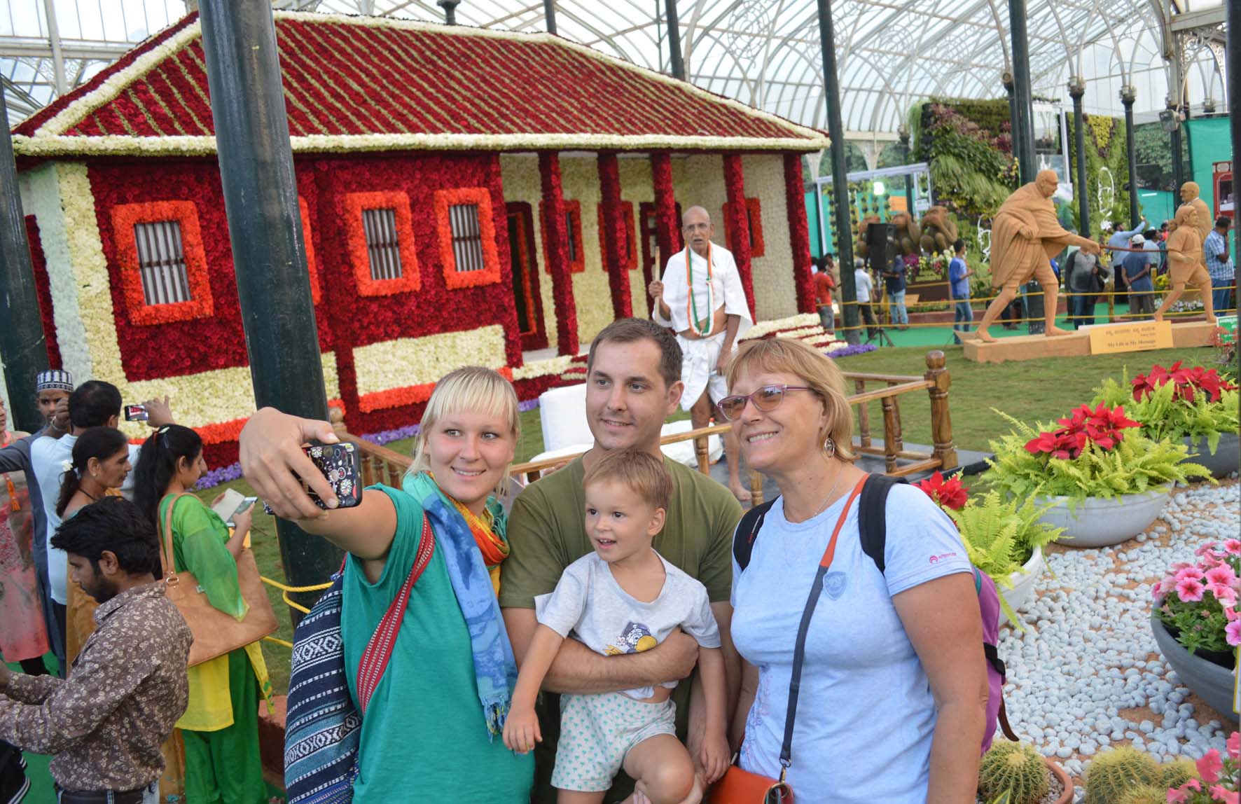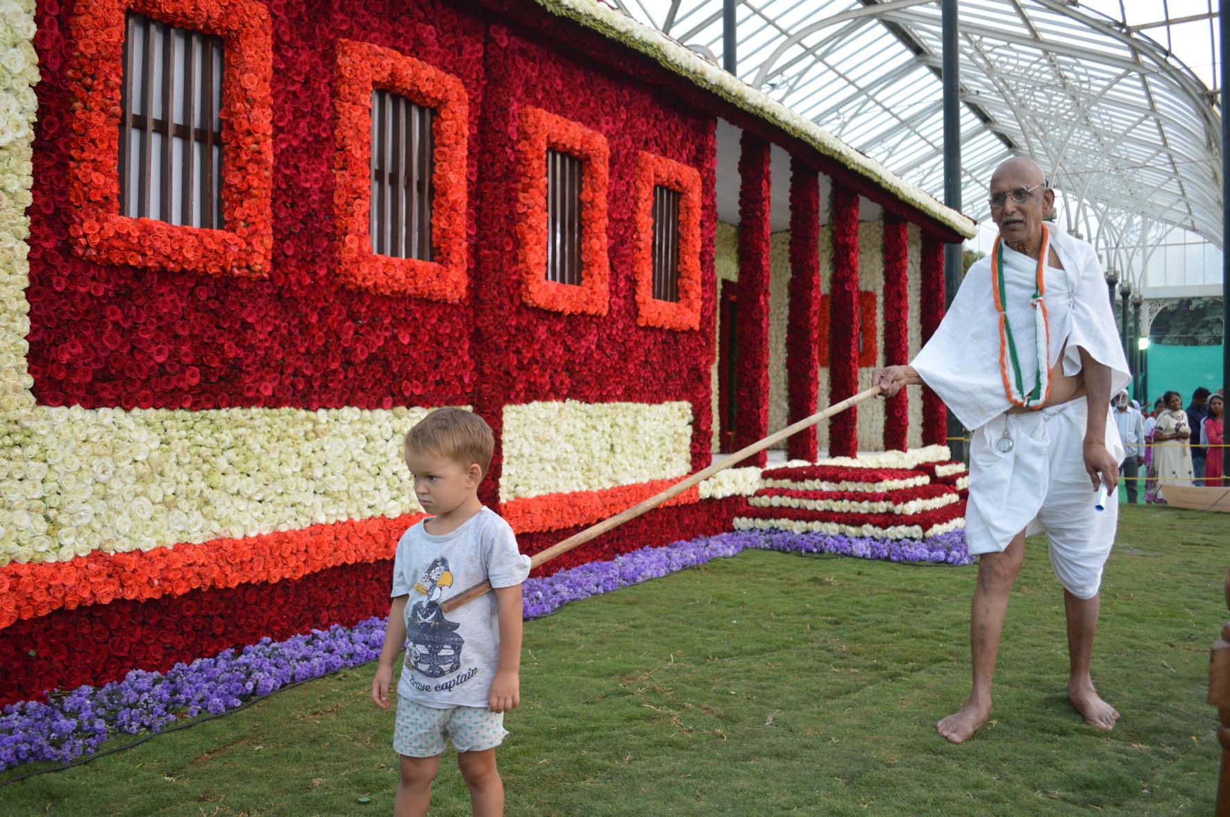 ಲಾಲ್ಬಾಗ್ನ ಫಲಪುಷ್ಪ ಪ್ರದರ್ಶನದ ಎದುರು ಗಾಂಧಿಯನ್ನೇ ಹೋಲುತ್ತಿರುವಂತೆ ವೇಮಗಲ್ನ ಸೋಮಶೇಖರ್ ಎಂಬುವವರು ಇಲ್ಲಿನ ಗಾಜಿನ ಮನೆಯಲ್ಲಿ ನಿರ್ಮಿಸಿರುವ ಸಬರಮತಿ ಆಶ್ರಮದ ಮುಂದೆ ಮರದ ಕುಟೀರದಲ್ಲಿ ಕುಳಿತಿದ್ದಾರೆ. 75 ವರ್ಷದವರಾದ ಅವರು, ಗಾಂಧಿಯಂತೆ ಕನ್ನಡಕ ಧರಿಸಿದ್ದು, ಬಿಳಿ ಪಂಚೆ, ಶಾಲು ಹೊದ್ದು, ಕೈಯಲ್ಲೊಂದು ಕೋಲು ಹಿಡಿದಿದ್ದಾರೆ. ಅವರು ಎಲ್ಲರ ಗಮನ ಸೆಳೆಯುತ್ತಿದ್ದು, ಅವರ ಜತೆಗೆ ನಿಂತು ಸೆಲ್ಫಿ ಕ್ಲಿಕ್ಕಿಸಿಕೊಳ್ಳುತ್ತಿದ್ದ ದೃಶ್ಯ ಕಂಡು ಬಂತು.