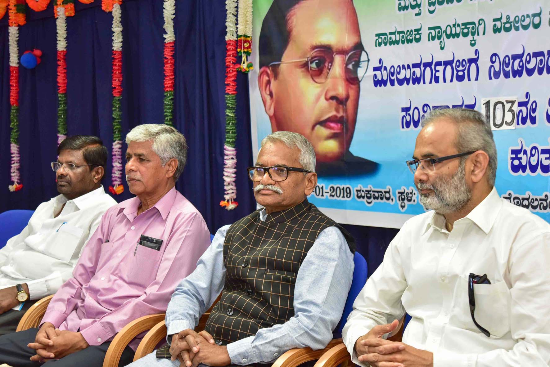 ದಲಿತ ಸಂಘರ್ಷ ಸಮಿತಿ ವತಿಯಿಂದ ನಗರದ ಜೈಭೀಮ್ ಭವನದಲ್ಲಿ ಆಯೋಜಿಸಿದ್ದ ಮೇಲ್ಜಾತಿಗಳಿಗೆ ಶೇ.10 ಮೀಸಲಾತಿ ಸಂಬಂಧಿತ ಸಂವಿಧಾನದ 103ನೇ ತಿದ್ದುಪಡಿ ಕಾಯ್ದೆ ಕುರಿತು ಚರ್ಚೆಯಲ್ಲಿ ಪಾಲ್ಗೊಂಡು ಅವರು ಮಾತನಾಡಿದರು.