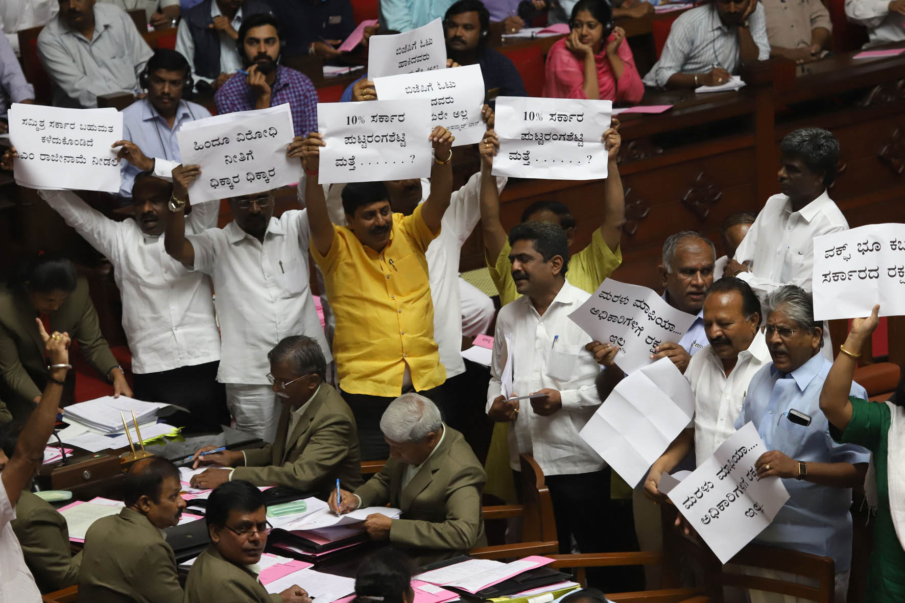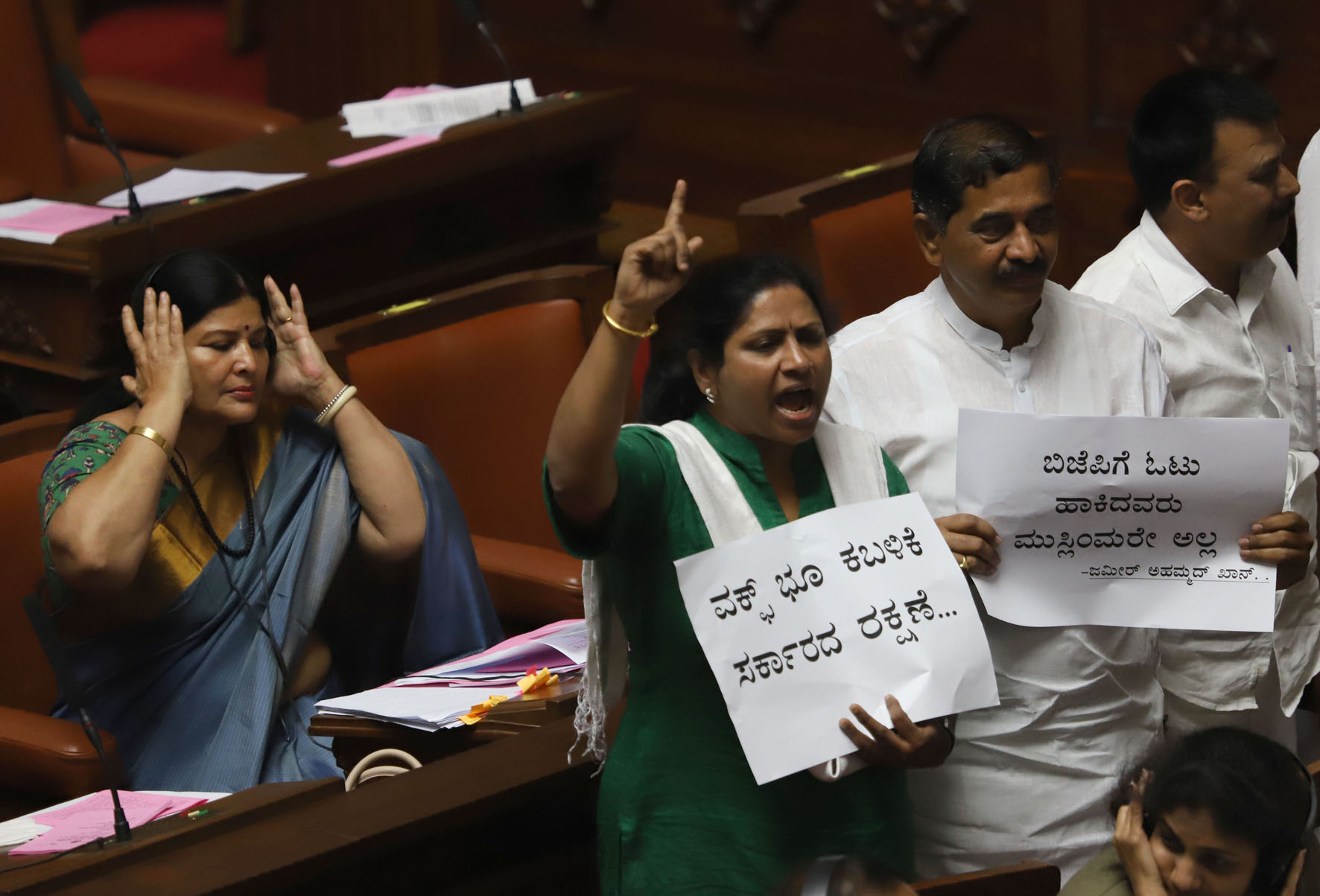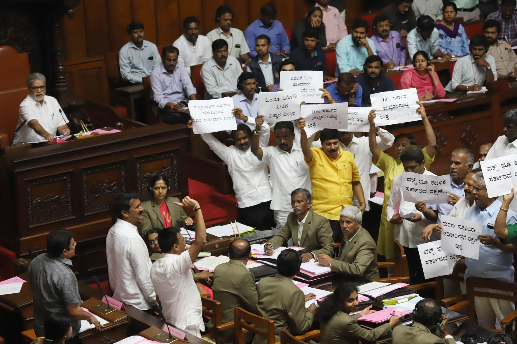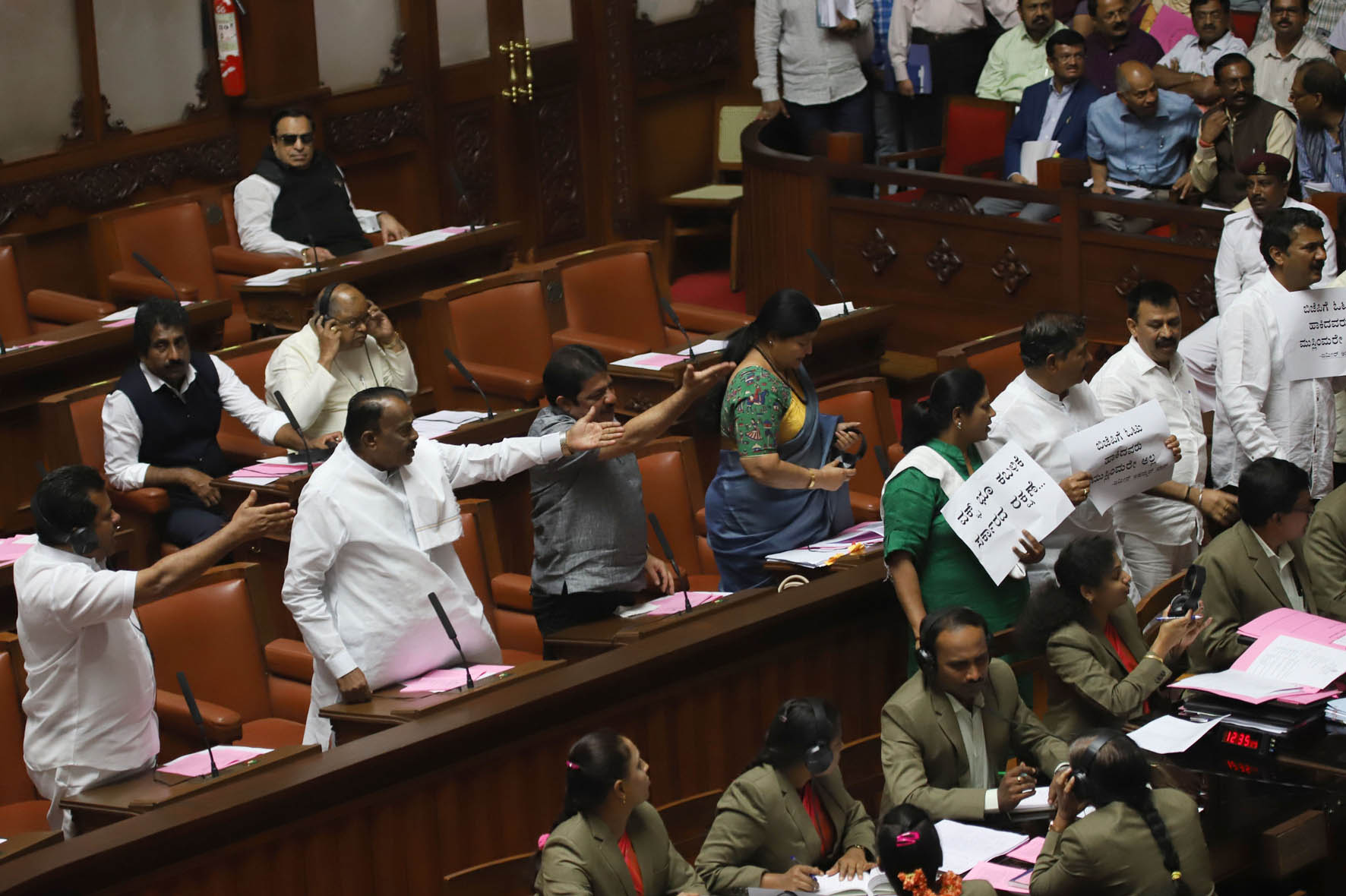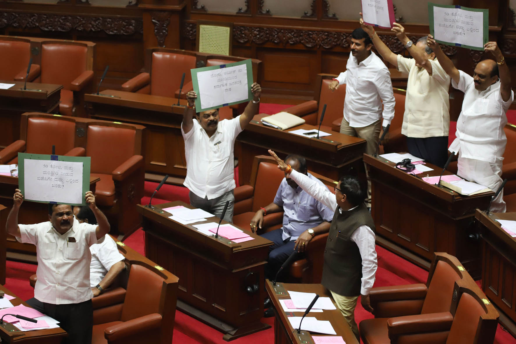 ಸಚಿವರಾದ ಝಮೀರ್ ಅಹ್ಮದ್, ಜಯಮಾಲಾ ಮತ್ತು ವೆಂಕಟರಮಣಪ್ಪ ಸೇರಿದಂತೆ ಮತ್ತಿತರರು ಬಿಜೆಪಿ ನಡೆಯನ್ನು ವಿರೋಧಿಸಿದರು. ಪುನಃ ಸದನದಲ್ಲಿ ಗದ್ದಲ, ಕೋಲಾಹಲ, ಆರೋಪ, ಪ್ರತ್ಯಾರೋಪ ನಡೆಯಿತು. ಸದಸ್ಯರು ಕಲಾಪ ನಡೆಯಲು ಅವಕಾಶ ನೀಡಬೇಕೆಂದು ಸಭಾಪತಿ ಮಾಡಿಕೊಂಡ ಮನವಿ ಪ್ರಯೋಜನವಾಗಲಿಲ್ಲ. ಈ ವೇಳೆ ಬಿಜೆಪಿ ಸದಸ್ಯರು ಸರಕಾರದ ವಿರುದ್ಧ ಧಿಕ್ಕಾರದ ಘೋಷಣೆಗಳನ್ನು ಕೂಗಿದರೆ, ಇದಕ್ಕೆ ಪ್ರತಿಯಾಗಿ ಕಾಂಗ್ರೆಸ್ ಸದಸ್ಯರೂ ಬಿಜೆಪಿ ವಿರುದ್ಧ ಘೋಷಣೆಗಳನ್ನು ಕೂಗಿದರು.