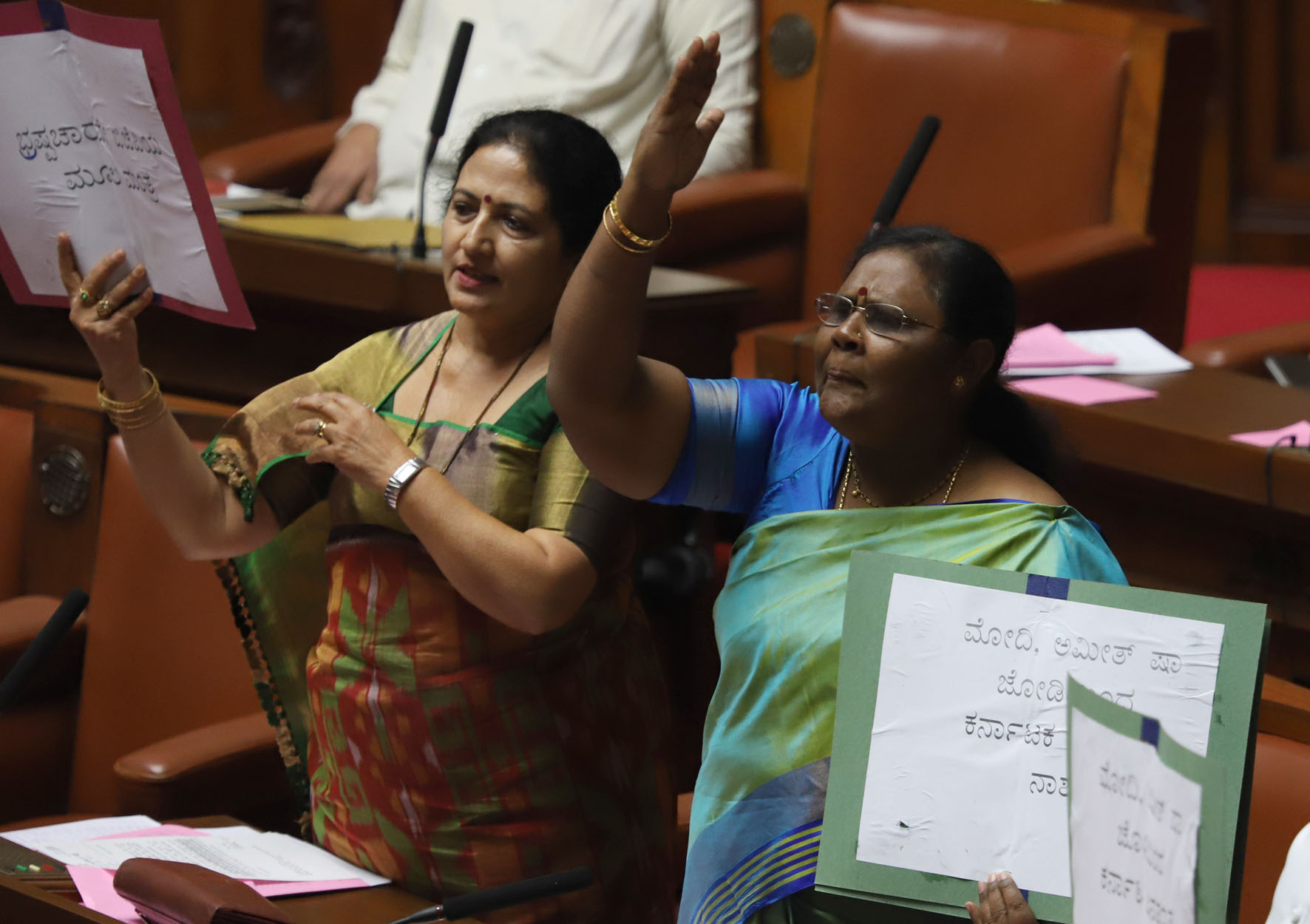 ಬಳಿಕ ಬಿಜೆಪಿ ಸದಸ್ಯರು ಕೈಯಲ್ಲಿ ಭಿತ್ತಿಪತ್ರಗಳನ್ನು ಹಿಡಿದು ಸರಕಾರದ ವಿರುದ್ಧ ಘೋಷಣೆಗಳನ್ನು ಕೂಗುತ್ತಾ ಸದನದ ಬಾವಿಗಿಳಿದರು. ಈ ಹಂತದಲ್ಲಿ ಕಲಾಪವನ್ನು ಕೆಲ ಕಾಲ ಮುಂದೂಡಲಾಯಿತು. ಮತ್ತೆ ಕಲಾಪ ಆರಂಭವಾಗುತ್ತಿದ್ದಂತೆಯೇ ಬಿಜೆಪಿ ಸದಸ್ಯರು ಸಚಿವ ಝಮೀರ್ ಅಹ್ಮದ್ ಅವರು ಬಿಜೆಪಿಗೆ ಓಟು ಹಾಕಿದವರು ಮುಸ್ಲಿಮರೇ ಅಲ್ಲ ಎಂದು ಹೇಳಿಕೆ ನೀಡಿರುವ ಭಿತ್ತಿ ಪತ್ರ, ವಕ್ಫ್ ಆಸ್ತಿ ಕಬಳಿಕೆ ಎಂಬ ಭಿತ್ತಿಪತ್ರವನ್ನು ಕೈಯಲ್ಲಿ ಹಿಡಿದು ಸದನದ ಬಾವಿಗೆ ಇಳಿದು ಸರಕಾರದ ವಿರುದ್ಧ ಘೋಷಣೆಗಳನ್ನು ಕೂಗಿದರು. ಈ ಹಂತದಲ್ಲಿ ಸಭಾಪತಿಗಳು ನಾಳೆ(ಶುಕ್ರವಾರ)ಗೆ ಕಲಾಪವನ್ನು ಮುಂದೂಡಿದರು.