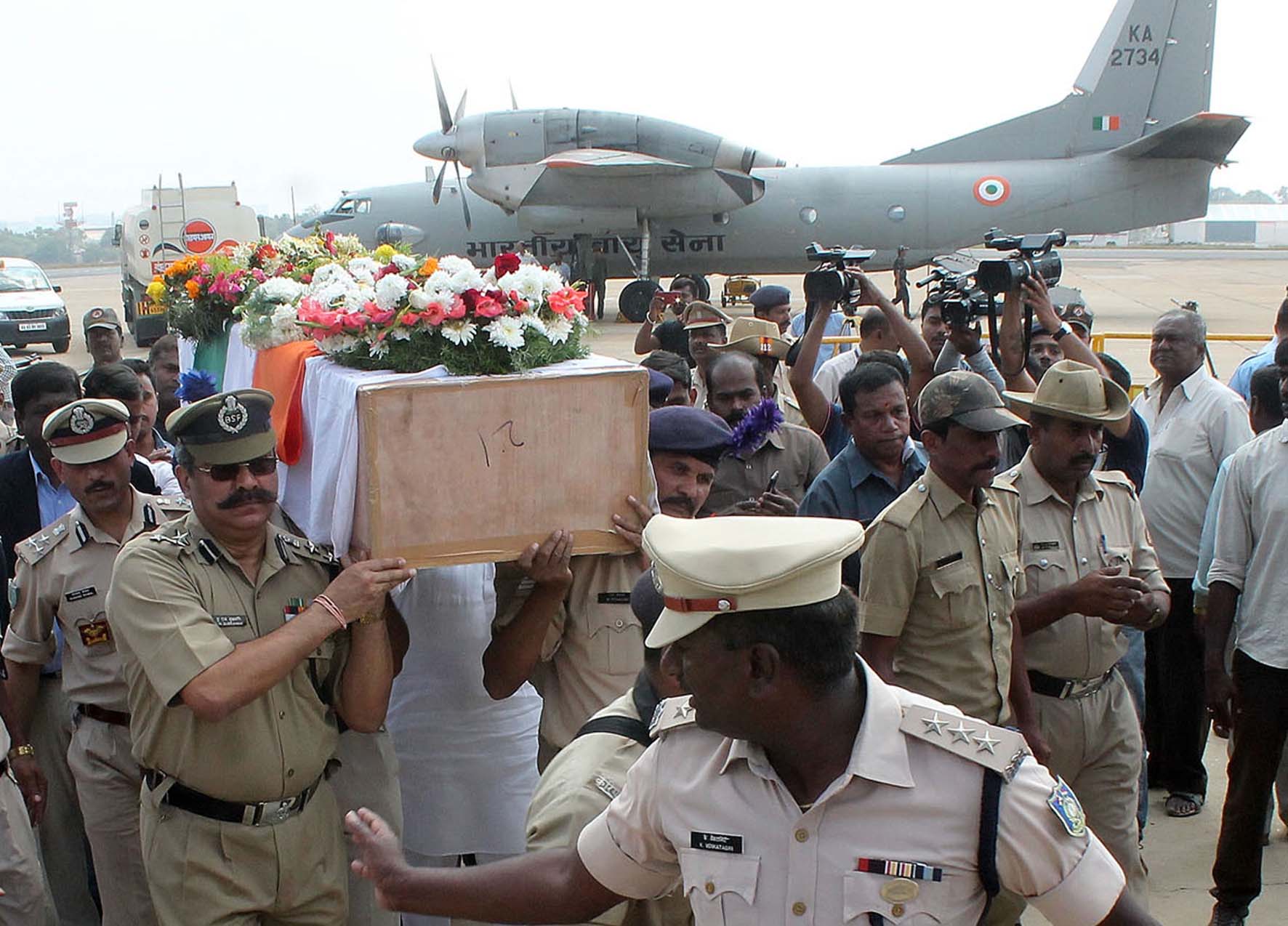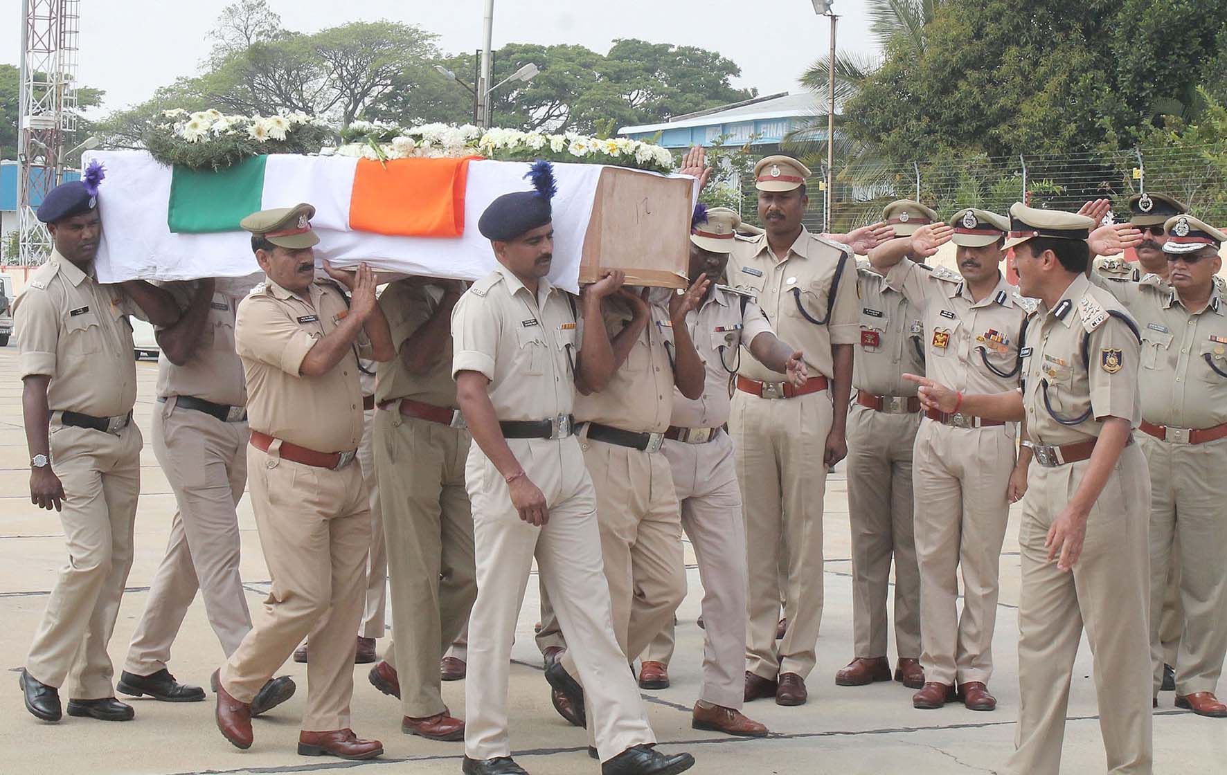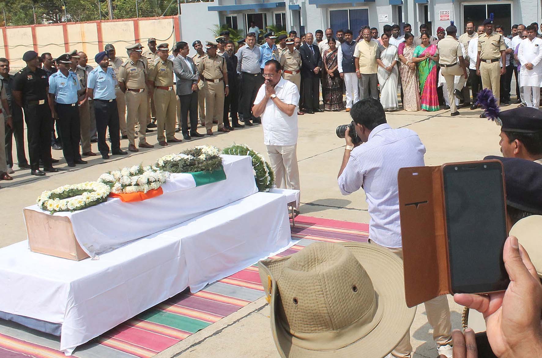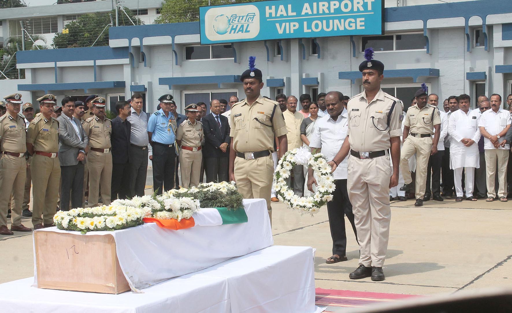 ಗೌರವ ಸಲ್ಲಿಕೆ: ಎಚ್ಎಎಲ್ ವಿಮಾನ ನಿಲ್ದಾಣದಲ್ಲಿ ಹತಾತ್ಮ ಯೋಧನ ಪಾರ್ಥಿವ ಶರೀರಕ್ಕೆ ಮುಖ್ಯಮಂತ್ರಿ ಎಚ್.ಡಿ.ಕುಮಾಸ್ವಾಮಿ, ಗೃಹ ಸಚಿವ ಎಂ.ಬಿ. ಪಾಟೀಲ್, ಕೇಂದ್ರ ಸಚಿವ ಡಿ.ವಿ.ಸದಾನಂದಗೌಡ, ಸಂಸದೆ ಶೋಭಾ ಕರಂದ್ಲಾಜೆ, ಮೇಯರ್ ಗಂಗಾಂಬಿಕೆ ಸೇರಿದಂತೆ ಗಣ್ಯರು ಪುಷ್ಪಗುಚ್ಚವಿರಿಸಿ ನಮನ ಸಲ್ಲಿಸಿದರು.