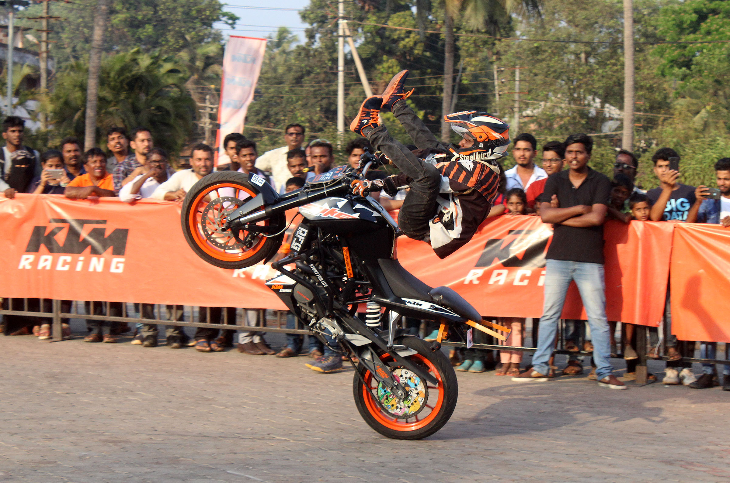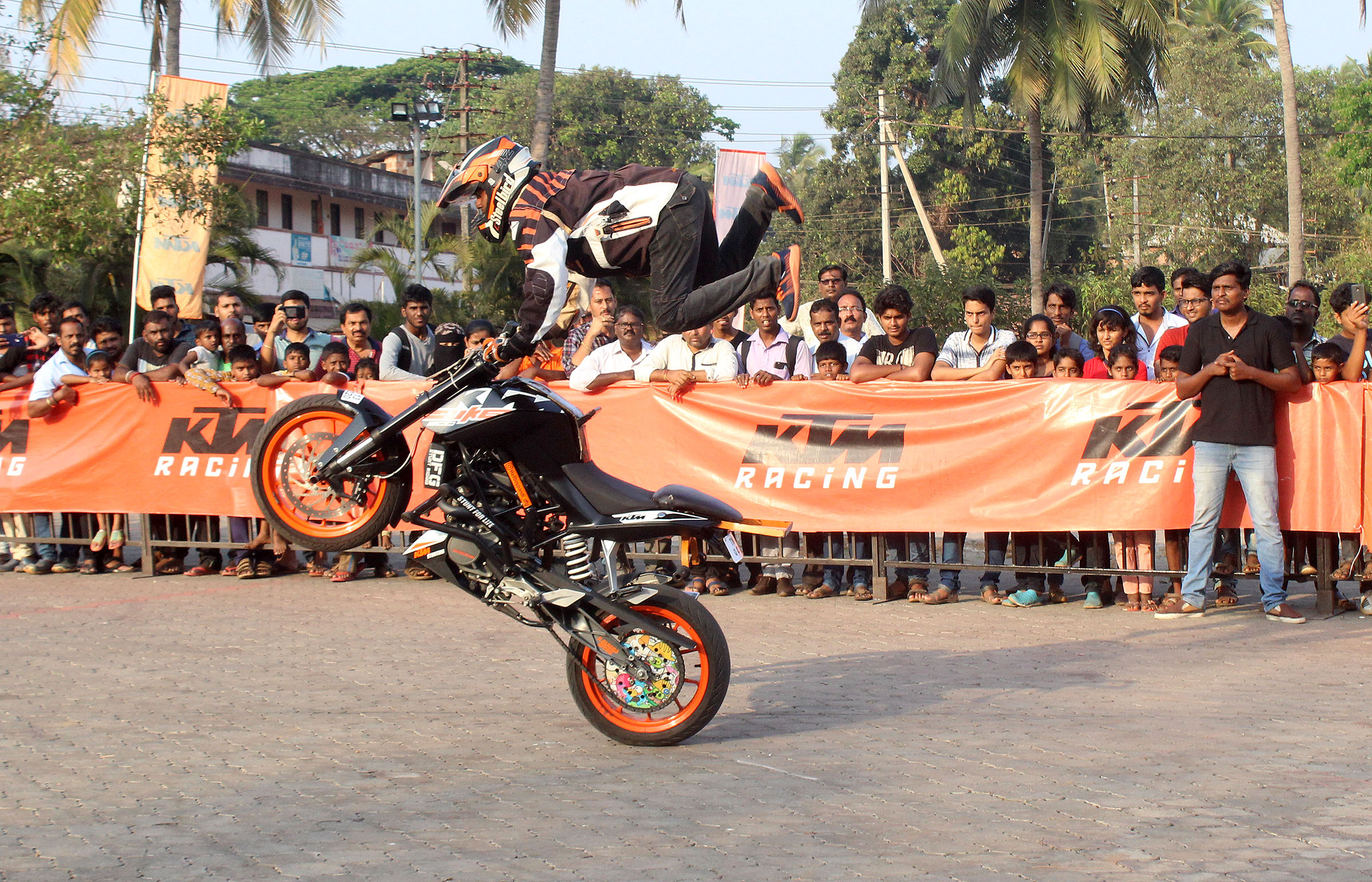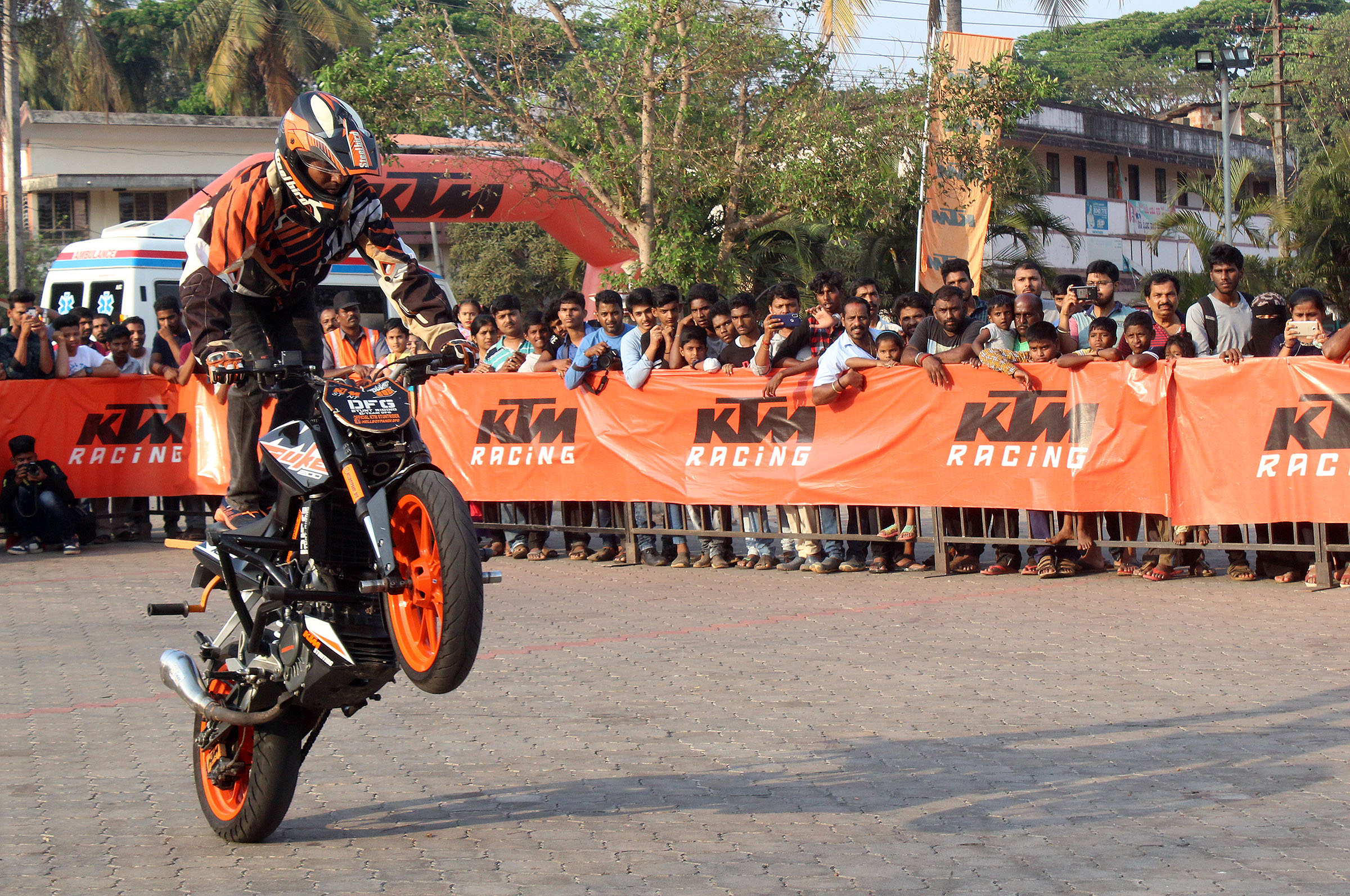 ಚೆನ್ನೈಯ ಡಿಎಫ್ಜಿ ಸ್ಟಂಟ್ ತಂಡದ ವೃತ್ತಿಪರ ಸಾಹಸಿ ಬೈಕ್ ಸವಾರರಾದ ಪಾಂಡ್ಯ ಹಾಗೂ ಆ್ಯಂಡ್ರೊ ಕೆಟಿಎಂ ಡ್ಯೂಕ್ ಬೈಕ್ಗಳಲ್ಲಿ ಮೈನವಿರೇಳಿಸುವಂತೆ 39 ಬಗೆಯ ಬೈಕ್ ಸಾಹಸ ಮತ್ತು ಟ್ರಿಕ್ಗಳನ್ನು ಪ್ರದರ್ಶಿಸಿದರು. ಈ ಸಾಹಸ ಪ್ರದರ್ಶನಕ್ಕೆ ನೂರಾರು ಜನರು ಸಾಕ್ಷಿಯಾದರು.
