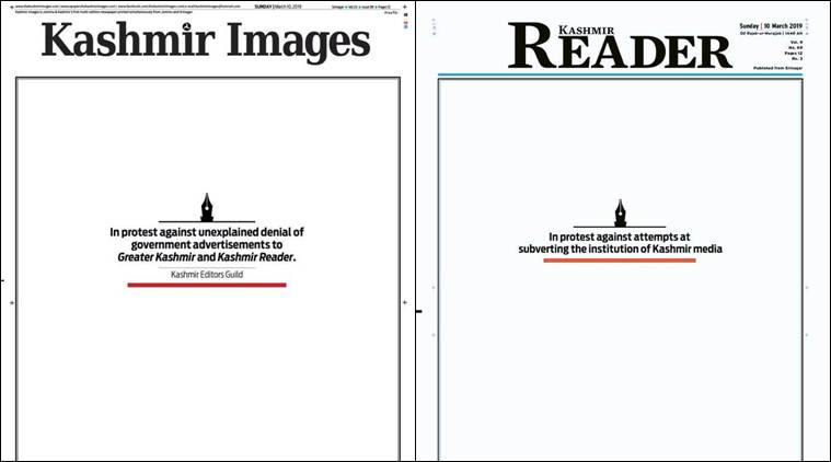 "ಗ್ರೇಟರ್ ಕಾಶ್ಮೀರ್’ ಮತ್ತು ‘ಕಾಶ್ಮೀರ್ ರೀಡರ್’ ಪತ್ರಿಕೆಗಳಿಗೆ ಸಕಾರಣವಿಲ್ಲದೇ ಜಾಹೀರಾತು ನಿರಾಕರಿಸಿರುವುದನ್ನು ಖಂಡಿಸಿ ಪ್ರತಿಭಟನೆ" ಎಂದು ಬರಹ ಪ್ರಕಟಿಸಿ ಮುಖಪುಟವನ್ನು ಖಾಲಿ ಬಿಡಲಾಗಿದೆ.