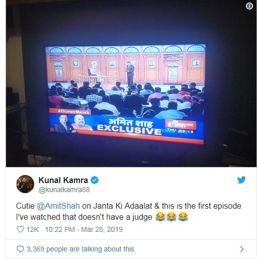 ಖ್ಯಾತ ಕಾಮಿಡಿಯನ್ ಕುನಾಲ್ ಕಾಮ್ರಾ ಈ ಕಾರ್ಯಕ್ರಮದ ಸ್ಕ್ರೀನ್ ಶಾಟ್ ಟ್ವಿಟರ್ ನಲ್ಲಿ ಪೋಸ್ಟ್ ಮಾಡಿ ಟಿವಿ ಕಾರ್ಯಕ್ರಮದ ನ್ಯಾಯಾಧೀಶರೂ ಬಿಜೆಪಿ ಅಧ್ಯಕ್ಷರ ಬಗ್ಗೆ ಭಯ ಹೊಂದಿದ್ದಾರೆಂದು ಪರೋಕ್ಷವಾಗಿ ಹೇಳುವ ಯತ್ನ ನಡೆಸಿದ್ದಾರೆ.