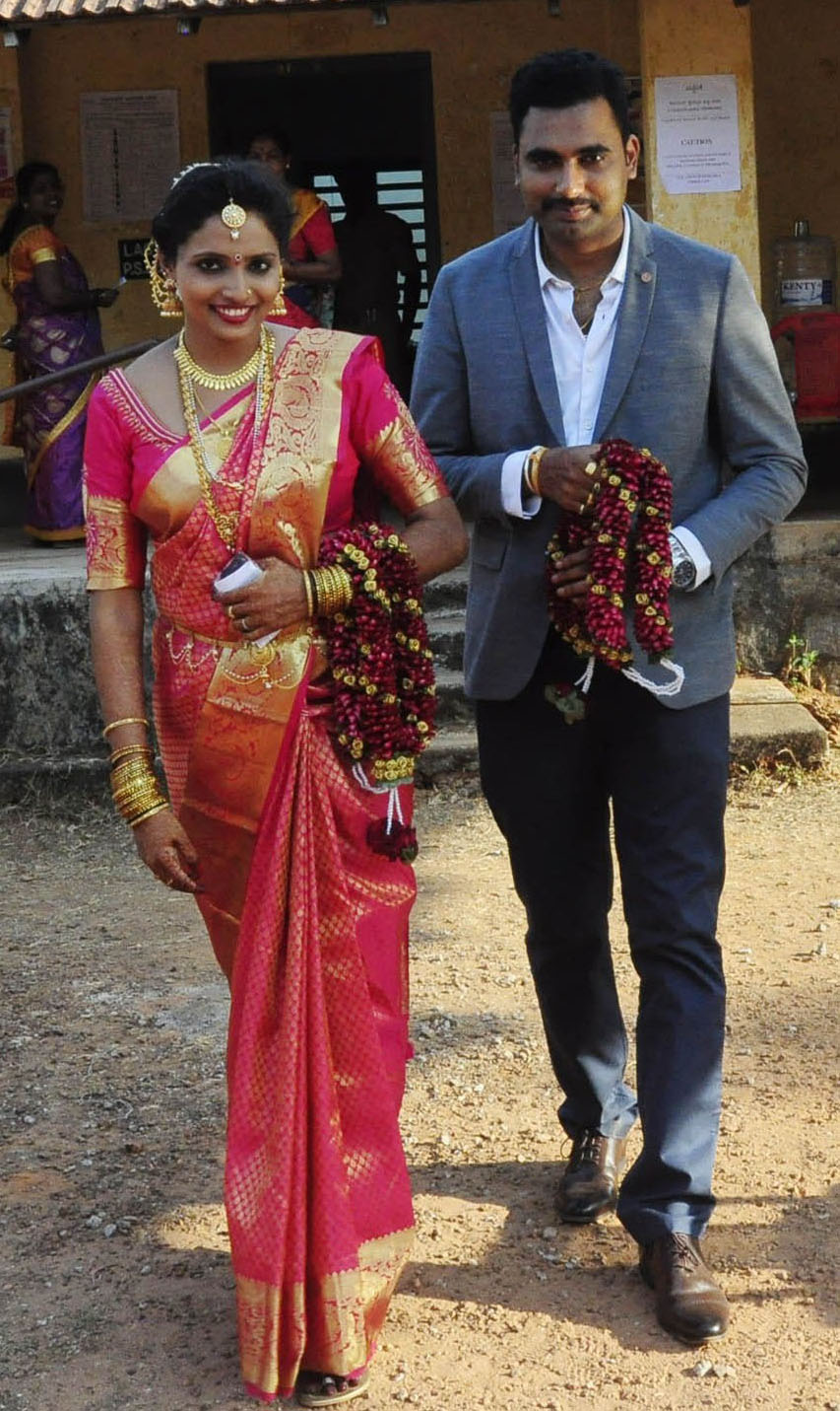 ಉಡುಪಿ ಮಾರ್ಪಳ್ಳಿಯ ಶ್ರೀನಿವಾಸ ಶೆಟ್ಟಿಗಾರ್ ಅವರ ಪುತ್ರಿ ಶ್ವೇತಾ ಉಡುಪಿ ಖಾಸಗಿ ಹೊಟೇಲಿನಲ್ಲಿ ನಡೆದ ವಿವಾಹ ಕಾರ್ಯಕ್ರಮದ ಬಳಿಕ ತನ್ನ ಪತಿ ಬೆಂಗಳೂರಿನ ಶಶಿಕುಮಾರ್ ಜೊತೆ ಕಾಪು ವಿಧಾನಸಭಾ ಕ್ಷೇತ್ರ ವ್ಯಾಪ್ತಿಯ ಕೊರಂಗ್ರಪಾಡಿ ಕೆಮ್ತೂರು ಮತಗಟ್ಟೆಗೆ ಆಗಮಿಸಿ ಮತ ಚಲಾಯಿಸಿದರು.