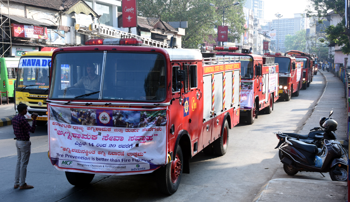 ಮಂಗಳೂರು, ಎ.20: ಅಗ್ನಿಶಾಮಕ ಸೇವಾ ಸಪ್ತಾಹದ ಅಂಗವಾಗಿ ನಗರದ ಅಂಬೇಡ್ಕರ್ ವೃತ್ತದಿಂದ ಪಾಂಡೇಶ್ವರದ ಅಗ್ನಿಶಾಮಕ ಠಾಣೆಯ ಆವರಣದ ತನಕ ಶನಿವಾರ ರ್ಯಾಲಿ ನಡೆಯಿತು. ಜಿಲ್ಲಾ ಅಗ್ನಿಶಾಮಕ ನಿವೃತ್ತ ಅಧಿಕಾರಿ ಕೆ.ಉಮೇಶ ಹಸಿರು ನಿಶಾನೆ ತೋರಿಸಿ ರ್ಯಾಲಿಗೆ ಚಾಲನೆ ನೀಡಿದರು. 18 ವಿವಿಧ ರೀತಿಯ ಅಗ್ನಿಶಾಮಕ ವಾಹನಗಳು ರ್ಯಾಲಿಯಲ್ಲಿ ಭಾಗವಹಿಸಿದ್ದವು.