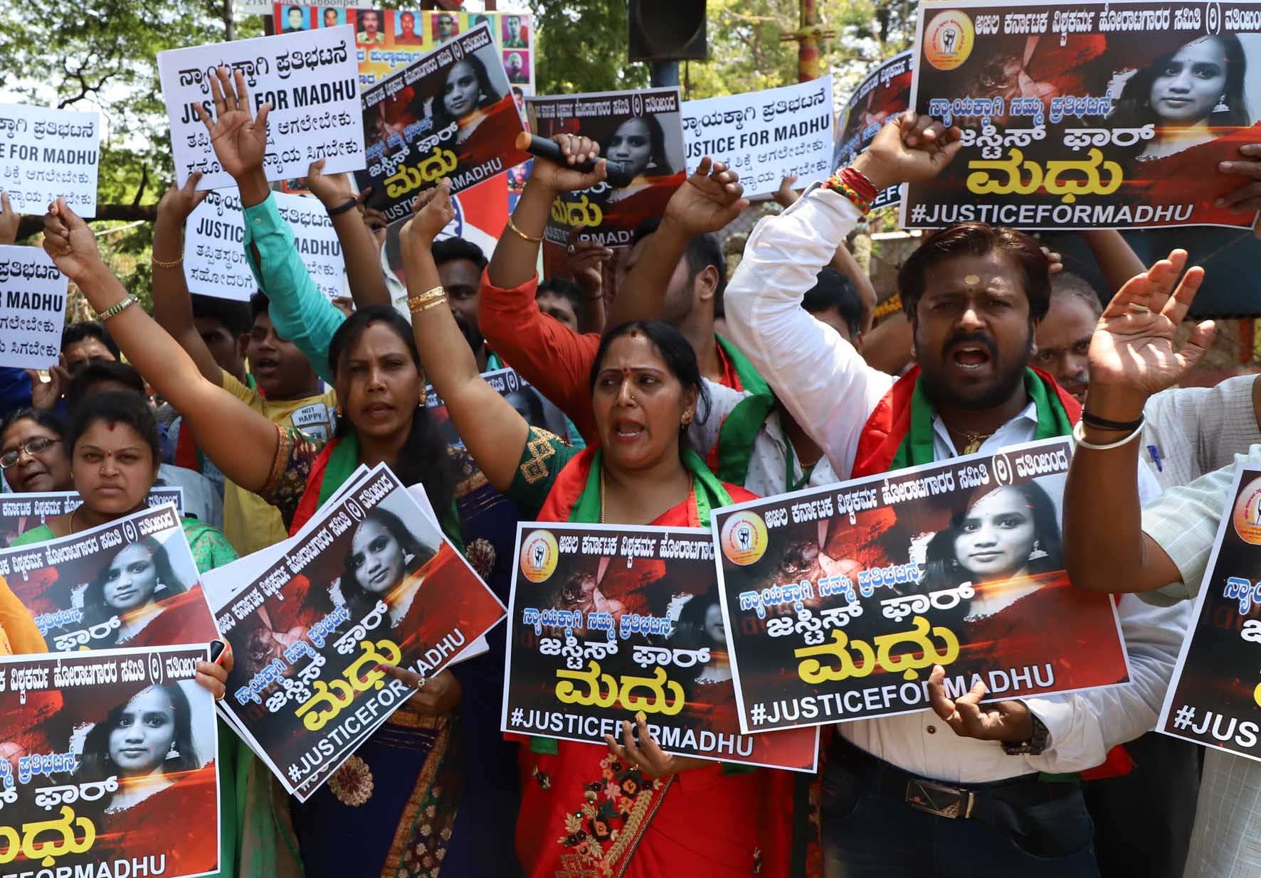 ಬುಧವಾರ ನಗರದ ಮೈಸೂರು ಬ್ಯಾಂಕ್ ವೃತ್ತದ ಬಳಿ ಅಖಿಲ ಕರ್ನಾಟಕ ವಿಶ್ವಕರ್ಮ ಹೋರಾಟಗಾರರ ಸಮಿತಿ ನೇತೃತ್ವದಲ್ಲಿ ಜಮಾಯಿಸಿದ, ಪ್ರತಿಭಟನಾಕಾರರು, ಮಧು ಸಾವಿಗೆ ನ್ಯಾಯ ಒದಗಿಸುವ ಕೆಲಸವನ್ನು ಮುಖ್ಯಮಂತ್ರಿ ಎಚ್.ಡಿ.ಕುಮಾರಸ್ವಾಮಿ ಮಾಡಬೇಕು ಎಂದು ಒತ್ತಾಯಿಸಿದರು.