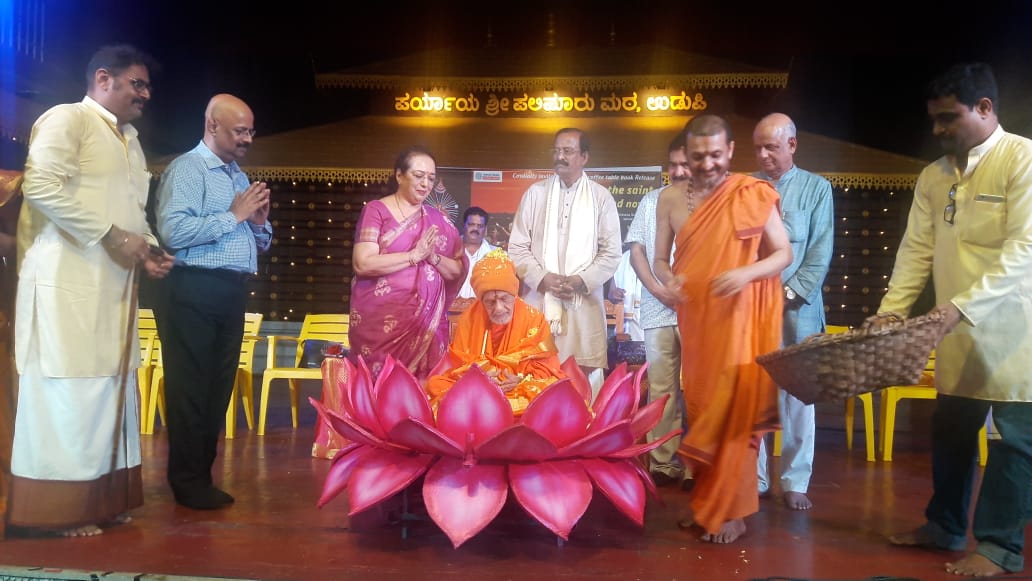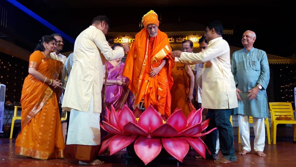ಪೇಜಾವರ ಸ್ವಾಮೀಜಿಯನ್ನು ಕಮಲದ ಪಲ್ಲಕ್ಕಿಯಲ್ಲಿ ಕೂರಿಸಿ ಪಲಿಮಾರು ಶ್ರೀವಿದ್ಯಾಧೀಶತೀರ್ಥ ಸ್ವಾಮೀಜಿ ಸಹಿತ ಮುಖ್ಯ ಅತಿಥಿಗಳಾದ ಪ್ರೊ.ಮಲ್ಲೇಪುರಂ ಜಿ.ವೆಂಕಟೇಶ್, ಡಾ.ಸಂದ್ಯಾ ಪೈ, ಡಾ.ಎಚ್.ಎಸ್.ಬಲ್ಲಾಳ್, ಡಾ.ಎಂ. ಮೋಹನ್ ಆಳ್ವ, ವಿನೋದ್ ಕುಮಾರ್ ಹೂವುಗಳನ್ನು ಸುರಿಯುವ ಮೂಲಕ ಪುಷ್ಪಾರ್ಚಣೆ ಮಾಡಲಾಯಿತು.