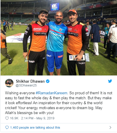 ವಿಶಾಖಪಟ್ಟಣದಲ್ಲಿ ನಡೆದ ಎಲಿಮಿನೇಟರ್ ಪಂದ್ಯದಲ್ಲಿ ರಶೀದ್ ಖಾನ್ ಮತ್ತು ಮುಹಮ್ಮದ್ ನಬೀ ಉಪವಾಸದೊಂದಿಗೆ ಆಡಿದ್ದರು. ಧವನ್ ಈ ಪಂದ್ಯದಲ್ಲಿ ಡೆಲ್ಲಿ ತಂಡದ ಖಾತೆಗೆ 16 ಎಸೆತಗಳಲ್ಲಿ 17 ರನ್ಗಳ ಕೊಡುಗೆ ನೀಡಿದ್ದರು. ರಶೀದ್ ಮತ್ತು ನಬೀ ಐಪಿಎಲ್ನಲ್ಲಿ ಉತ್ತಮ ಪ್ರದರ್ಶನ ನೀಡಿದ್ದಾರೆ. ನಬಿ ಕಳೆದ ಪಂದ್ಯದಲ್ಲಿ 13 ಎಸೆತಗಳಲ್ಲಿ 3 ಬೌಂಡರಿ ಮತ್ತು 1 ಸಿಕ್ಸರ್ ಇರುವ 20 ರನ್ ಗಳಿಸಿ ತಂಡಕ್ಕೆ ಸ್ಪರ್ಧಾತ್ಮಕ ಮೊತ್ತ ದಾಖಲಿಸಲು ನೆರವಾಗಿದ್ದರು.