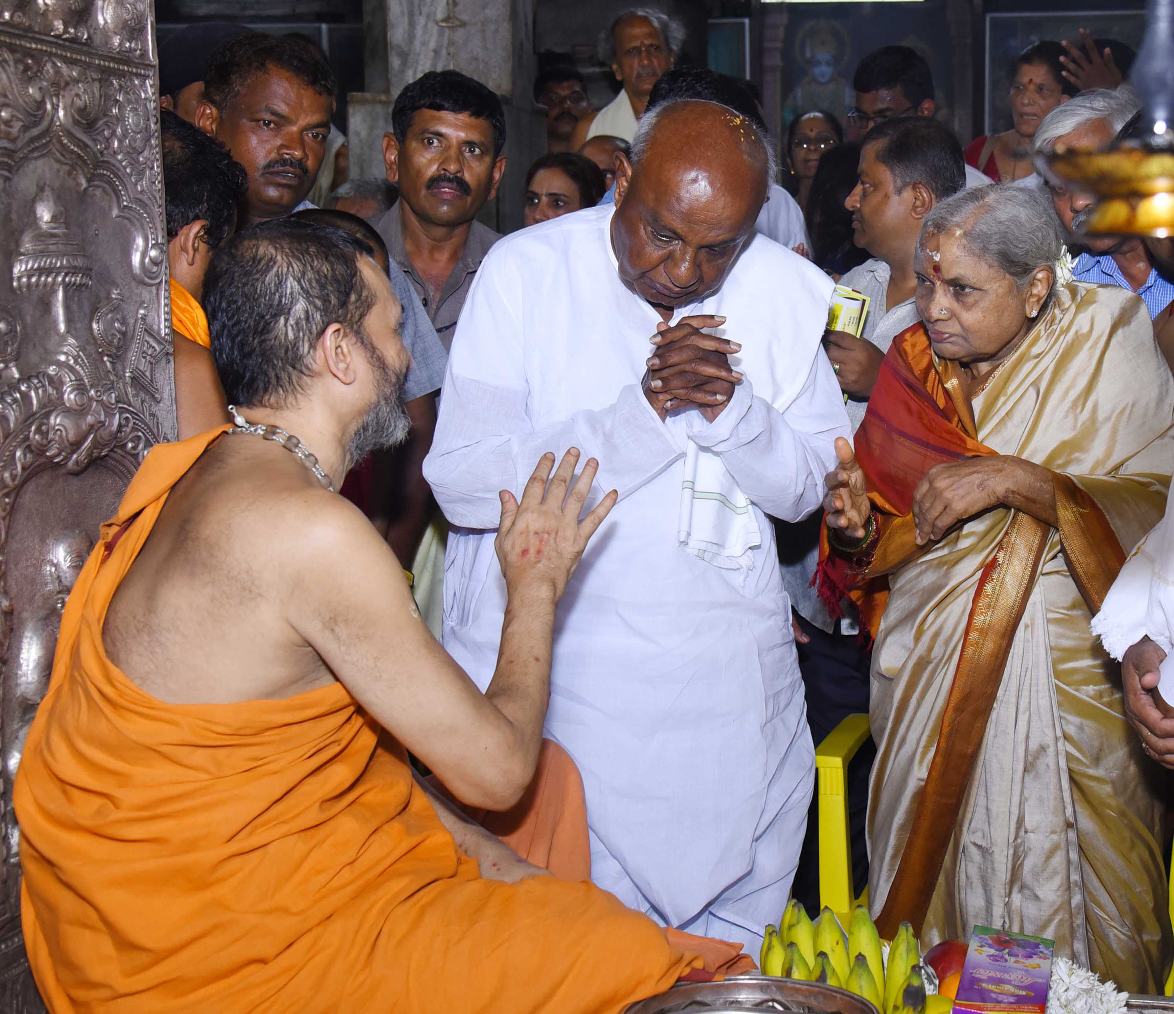 ಪತ್ನಿ ಚೆನ್ನಮ್ಮ ಜೊತೆ ನವಗ್ರಹ ಕಿಂಡಿಯ ಮೂಲಕ ಶ್ರೀಕೃಷ್ಣ ದೇವರ ದರ್ಶನ ಪಡೆದ ದೇವೇಗೌಡರು, ಮಠದ ಸುವರ್ಣ ಗೋಪುರ ಯೋಜನೆ ಯನ್ನು ವೀಕ್ಷಿಸಿದರು. ಬಳಿಕ ಅವರು ಪರ್ಯಾಯ ಪಲಿಮಾರು ಮಠಾಧೀಶ ಶ್ರೀವಿದ್ಯಾ ಧೀಶ ತೀರ್ಥ ಸ್ವಾಮೀಜಿ ಅವರಿಂದ ಅನುಗ್ರಹ ಮಂತ್ರಾಕ್ಷತೆ ಪಡೆದು ಶ್ರೀಕೃಷ್ಣ ಪ್ರಸಾದ ಸ್ವೀಕರಿಸಿದರು.