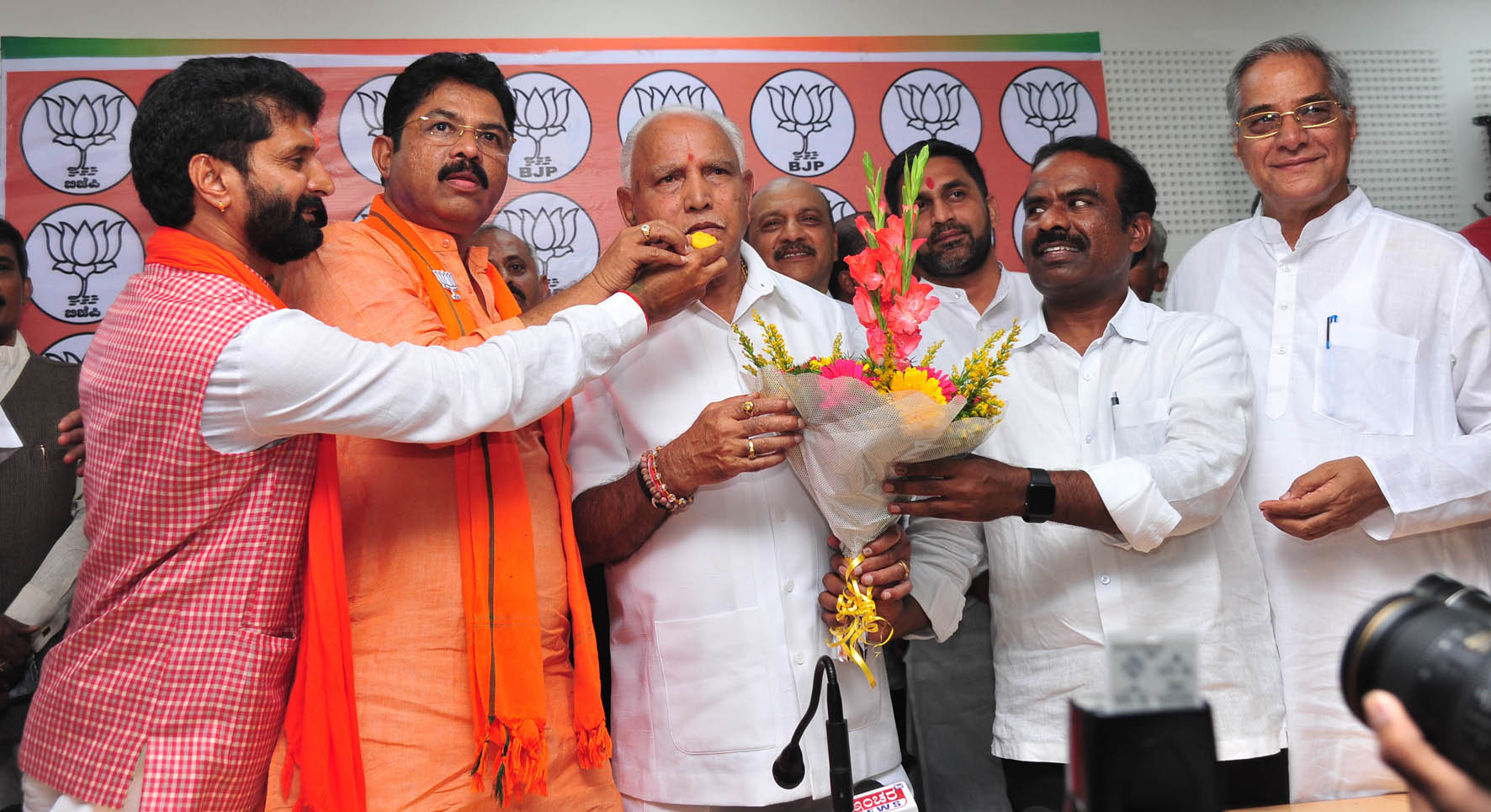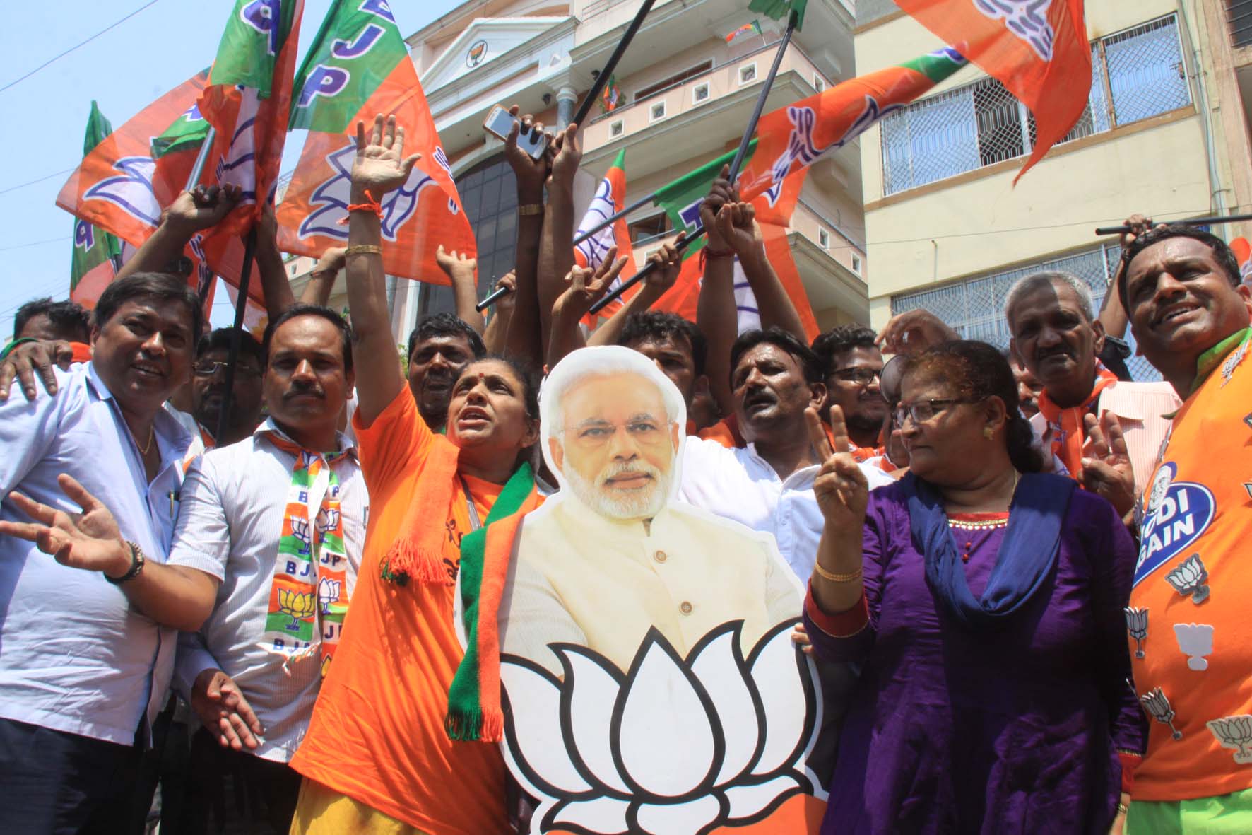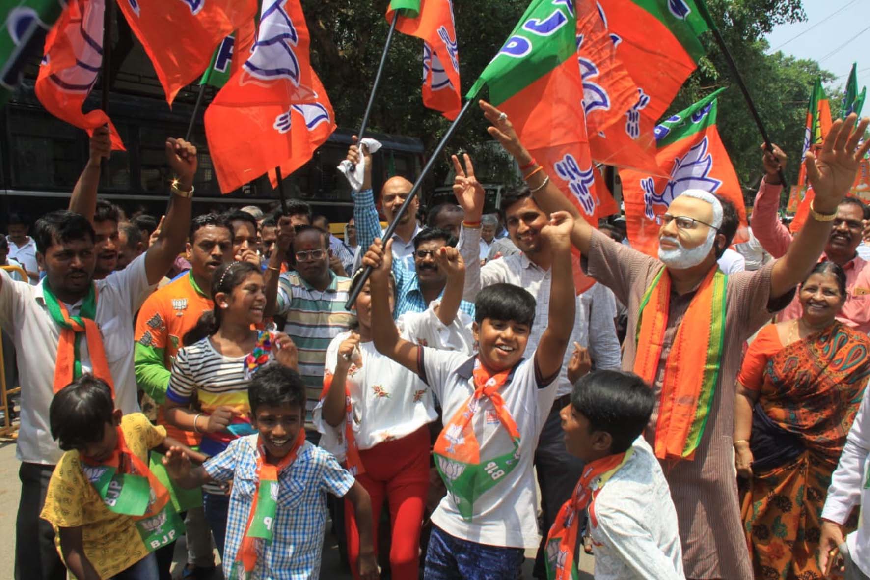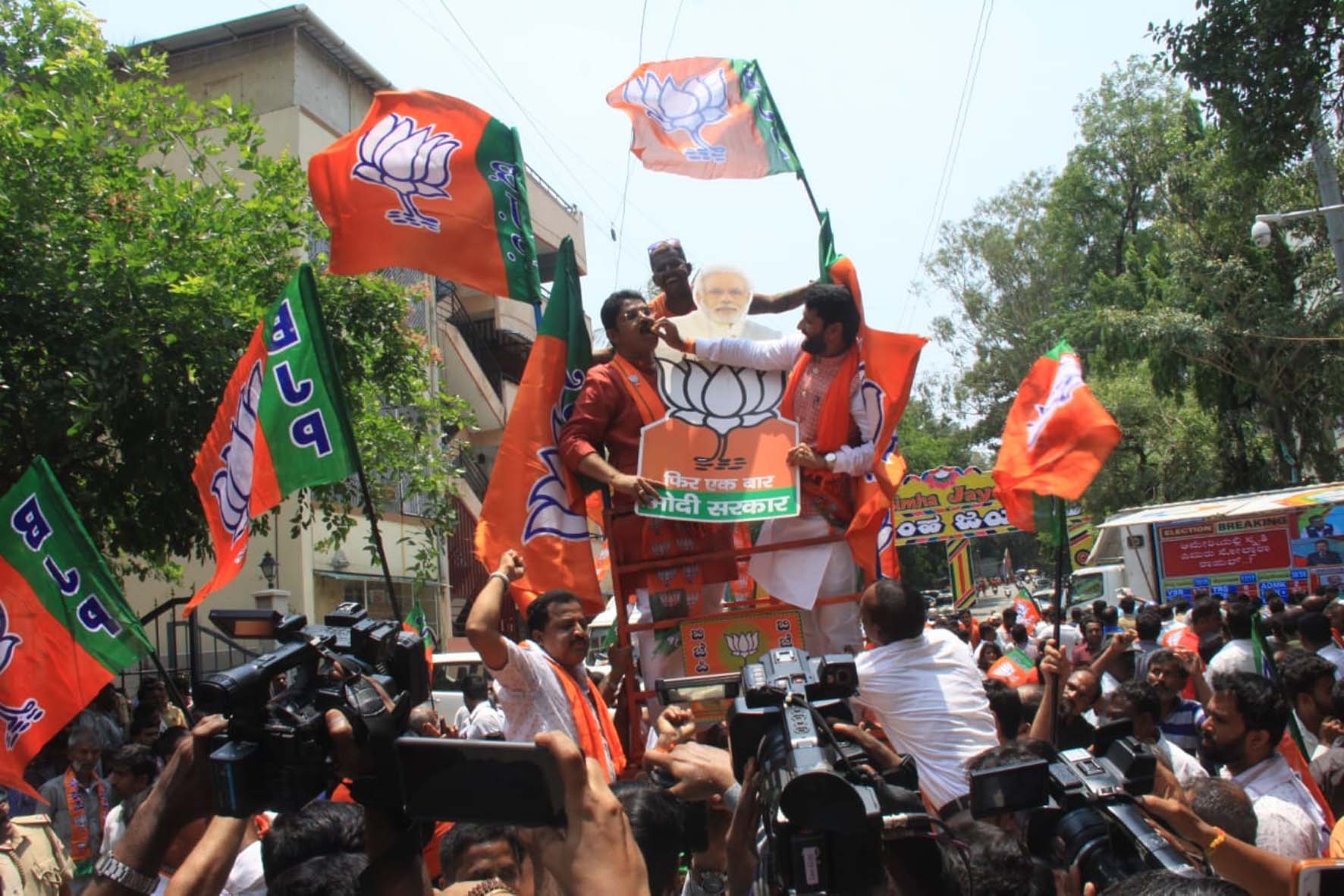 ಬೆಂಗಳೂರು, ಮೇ 23: ರಾಜ್ಯದಲ್ಲಿ ಬಿಜೆಪಿ ಮೇಲುಗೈ ಸಾಧಿಸುತ್ತಿದ್ದಂತೆ ಹಲವೆಡೆ ಬಿಜೆಪಿ ಕಾರ್ಯಕರ್ತರು, ಬೆಂಬಲಿಗರು ಪಕ್ಷದ ಬಾವುಟ ಹಿಡಿದು, ಪಕ್ಷದ ಕಚೇರಿ ಎದುರು ಕುಣಿದು ಕುಪ್ಪಳಿಸಿ ಸಂಭ್ರಮಿಸಿದರು. ಪಟಾಕಿ ಸಿಡಿಸಿ, ಸಿಹಿ ಹಂಚುವುದರ ಮೂಲಕ ವಿಜಯೋತ್ಸವ ಆಚರಿಸಿದರು.