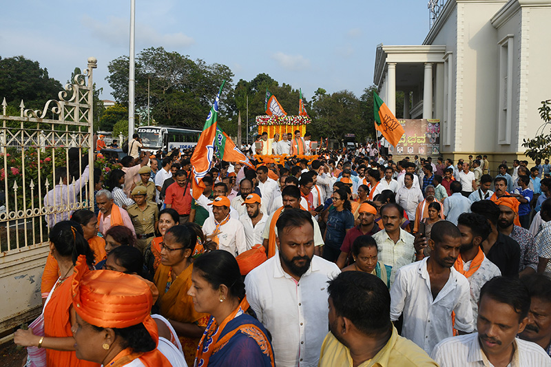ನಗರದ ಕುದ್ಮುಲ್ ರಂಗರಾವ್ ಪುರಭವನದಿಂದ ಆರಂಭಗೊಂಡ ವಿಜಯೋತ್ಸವ ಮೆರವಣಿಗೆ ಕ್ಲಾಕ್ ಟವರ್, ಜಿಎಚ್ಎಸ್ ರಸ್ತೆ, ಟೆಂಪಲ್ ಸ್ಕ್ವೇರ್, ರಥಬೀದಿ, ನ್ಯೂಚಿತ್ರಾ, ಅಳಕೆ, ದುರ್ಗಾ ಮಹಲ್, ಬಳ್ಳಾಲ್ಬಾಗ್, ಎಂಜಿ ರಸ್ತೆ, ಪಿವಿಎಸ್ ವೃತ್ತ ಮೂಲಕ ಸಾಗಿ ಬಿಜೆಪಿ ಜಿಲ್ಲಾ ಕಚೇರಿ ಬಳಿ ಸಮಾಪನಗೊಂಡಿತು. ಹಾದಿಯುದ್ದಕ್ಕೂ ಸಾವಿರಾರು ಕಾರ್ಯಕರ್ತರು ಮೆರವಣಿಗೆಯಲ್ಲಿ ಸಾಗಿಬಂದು ಸಂಭ್ರಮಿಸಿದರು.