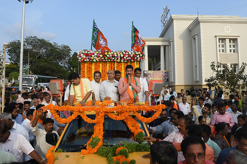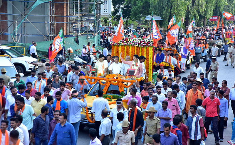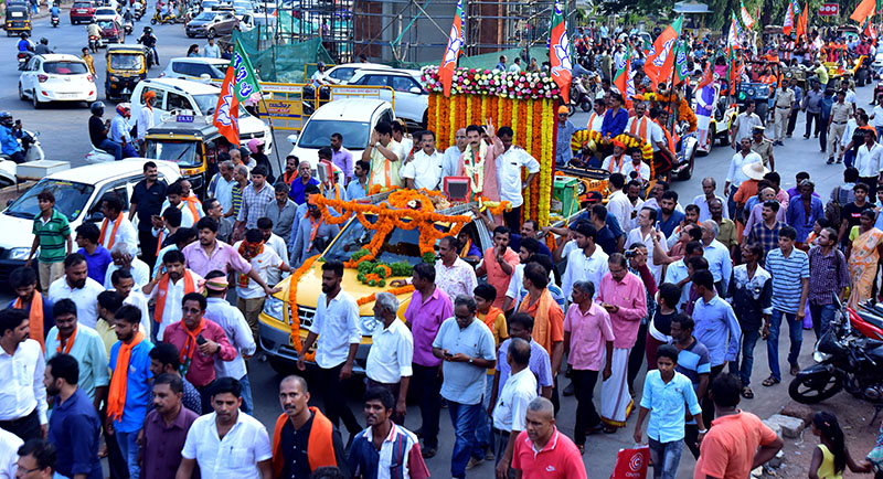 ಸಂಸದ ನಳಿನ್ ಮತ್ತು ಬಿಜೆಪಿ ಮುಖಂಡರು ತೆರೆದ ವಾಹನದಲ್ಲಿ ಸಾಗಿದರು. ಕೆಲವೆಡೆ ಸಂಸದರು ರಸ್ತೆಯಲ್ಲಿ ಕಾರ್ಯಕರ್ತರ ಜತೆಗೂಡಿ ಹೆಜ್ಜೆ ಹಾಕಿದರು. ಹಿರಿಯ ಕಾರ್ಯಕರ್ತರಿಗೆ ನಮಿಸಿದರು. ಮೆರವಣಿಗೆ ಸಾಗಿಬಂದ ಹಾದಿಯುದ್ದಕ್ಕೂ ಕಾರ್ಯಕರ್ತರು ಪಟಾಕಿ ಸಿಡಿಸಿ ಖುಷಿಪಟ್ಟರು. ಮೆರವಣಿಗೆಯಲ್ಲಿ ಮೋದಿ ವೇಷಧಾರಿಗಳು ಗಮನ ಸೆಳೆದರು.