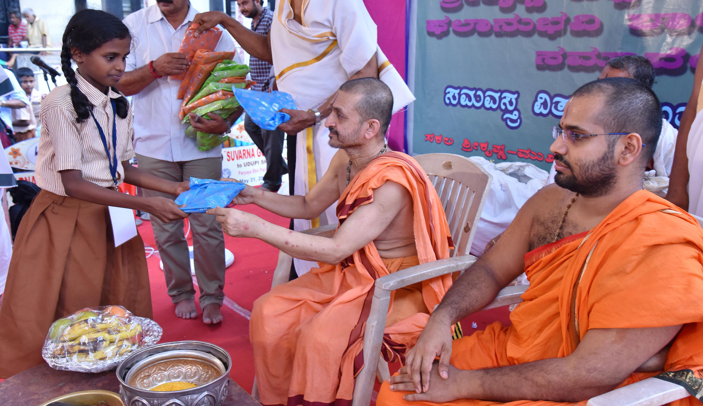 ಉಡುಪಿ, ಜೂ.3: ಉಡುಪಿ ಶ್ರೀಕೃಷ್ಣಮಠ ಪರ್ಯಾಯ ಪಲಿಮಾರು ಮಠದ ಆಶ್ರಯದಲ್ಲಿ ಶ್ರೀಕೃಷ್ಣ ಸುವರ್ಣಗೋಪುರ ಸಮರ್ಪಣೆ ಹಾಗೂ ಬ್ರಹ್ಮಕಲಶಾಭಿಷೇಕ ಮಹೋತ್ಸವದ ಅಂಗವಾಗಿ ಶ್ರೀಕೃಷ್ಣ ಚಿಣ್ಣರ ಸಂತರ್ಪಣೆ ಫಲಾನುಭವಿ ಶಾಲಾ ಮಕ್ಕಳ ಸಮಾವೇಶವನ್ನು ಮಠದ ರಥಬೀದಿಯಲ್ಲಿ ಸೋಮವಾರ ಆಯೋಜಿಸಲಾಗಿತ್ತು.