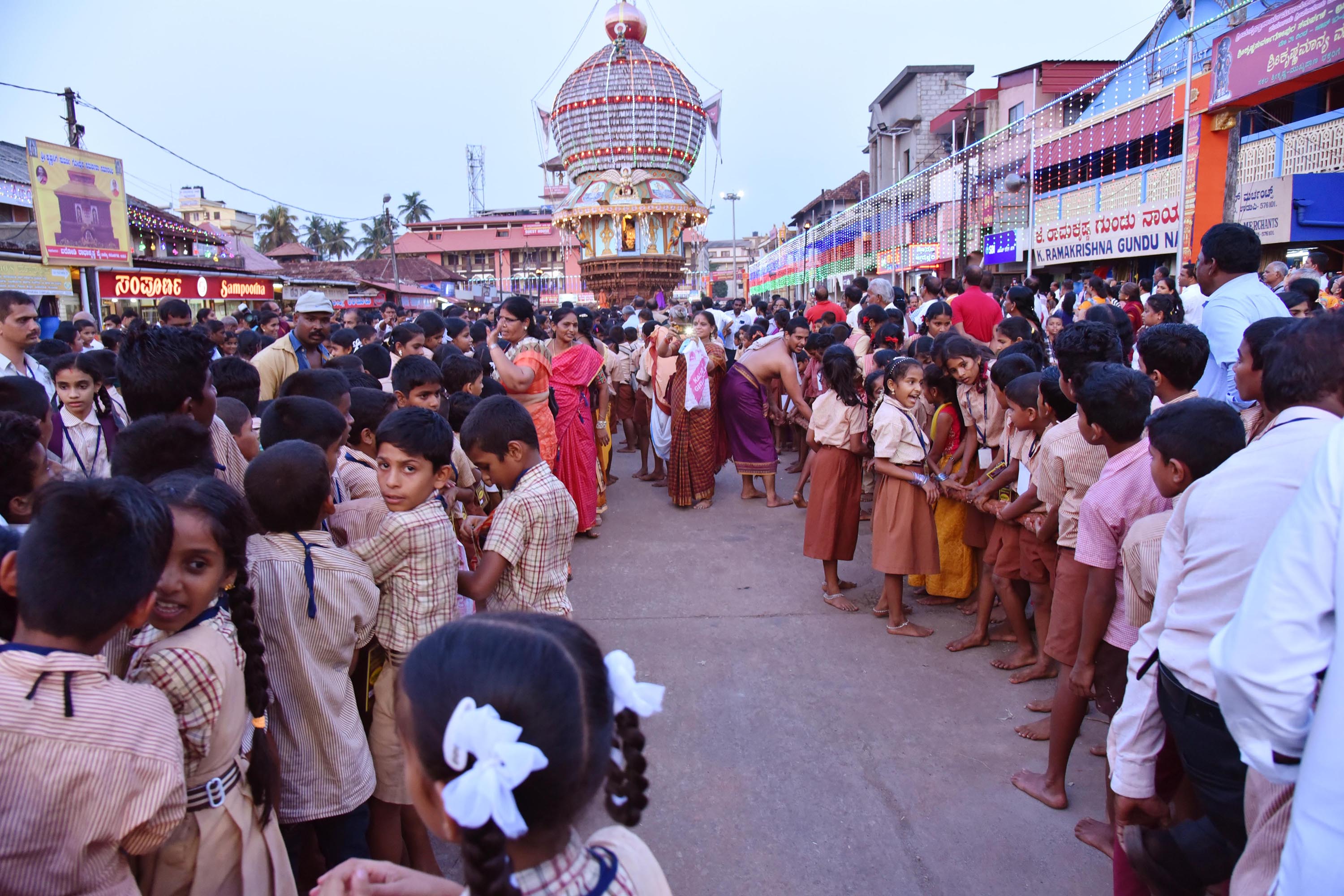 ಮಕ್ಕಳಿಂದ ರಥೋತ್ಸವ: ಕಾರ್ಯಕ್ರಮದ ಕೊನೆಯಲ್ಲಿ ಚಿಣ್ಣರ ಸಂತರ್ಪಣೆಯ ಫಲಾನುಭವಿ ಪುಟ್ಟಾಣಿಗಳು ಶ್ರೀಕೃಷ್ಣ ಮಠದ ರಥಬೀದಿಯಲ್ಲಿ ನಡೆದ ಬ್ರಹ್ಮರಥೋತ್ಸವದಲ್ಲಿ ಅಷ್ಟಮಠಾಧೀಶರೊಂದಿಗೆ ಸೇರಿ ಬ್ರಹ್ಮರಥವನ್ನು ಎಳೆದರು.