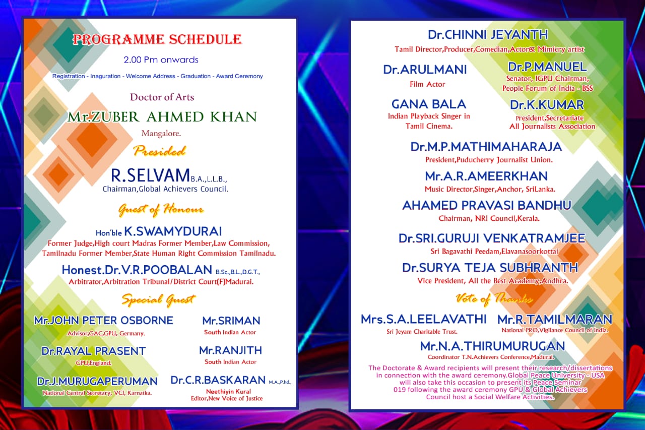 ಸಮಾರಂಭದಲ್ಲಿ ಮದ್ರಾಸ್ ಹೈಕೋರ್ಟ್ ನ ನಿವೃತ್ತ ನ್ಯಾಯಮೂರ್ತಿ ಶ್ರೀ ಕೆ ಸ್ವಾಮಿ ದೊರೈ, ಜರ್ಮನಿಯ ಗ್ಲೋಬಲ್ ಪೀಸ್ ಯೂನಿವರ್ಸಿಟಿ ಯ ಸಲಹೆಗಾರರಾದ ಜಾನ್ ಪೀಟರ್ ಜಸ್ ಬರ್ಗ್, ಇಂಗ್ಲೆಂಡ್ ಜಿಪಿಯುನ ಡಾ. ರಾಯಲ್ ಪ್ರೆಸೆನ್ಟ್, ದಕ್ಷಿಣ ಭಾರತದ ಖ್ಯಾತ ನಟರಾದ ಮಾನ್ ರಂಜಿತ್ ಮುಂತಾದ ಗಣ್ಯರು ಉಪಸ್ಥಿತರಿದ್ದರು. ಸಮಾರಂಭದಲ್ಲಿ ವಿವಿಧ ಕ್ಷೇತ್ರದ ಗಣ್ಯರನ್ನು ಗೌರವಿಸಲಾಯಿತು.