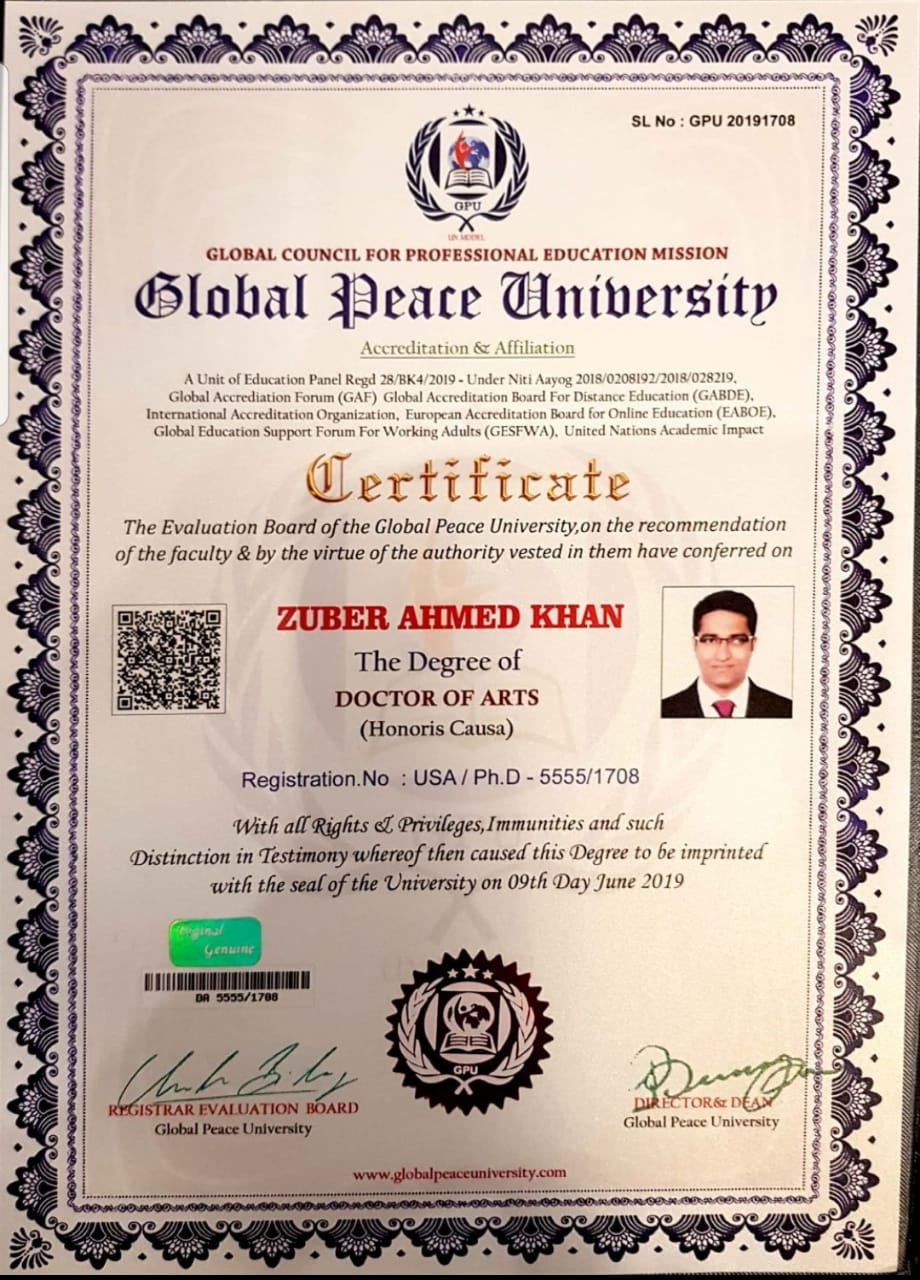 ಮಂಗಳೂರು: ಕಲಾವಿದ ಝುಬೇರ್ ಖಾನ್ ಕುಡ್ಲ ಅವರಿಗೆ ಪಾಂಡಿಚೇರಿಯ ಗ್ಲೋಬಲ್ ಪೀಸ್ ಯೂನಿವರ್ಸಿಟಿಯು ಗೌರವ ಡಾಕ್ಟರೇಟ್ ಪದವಿ ನೀಡಿ ಗೌರವಿಸಿದೆ.