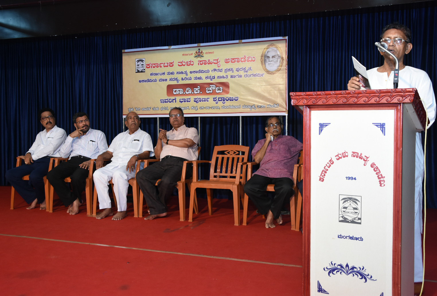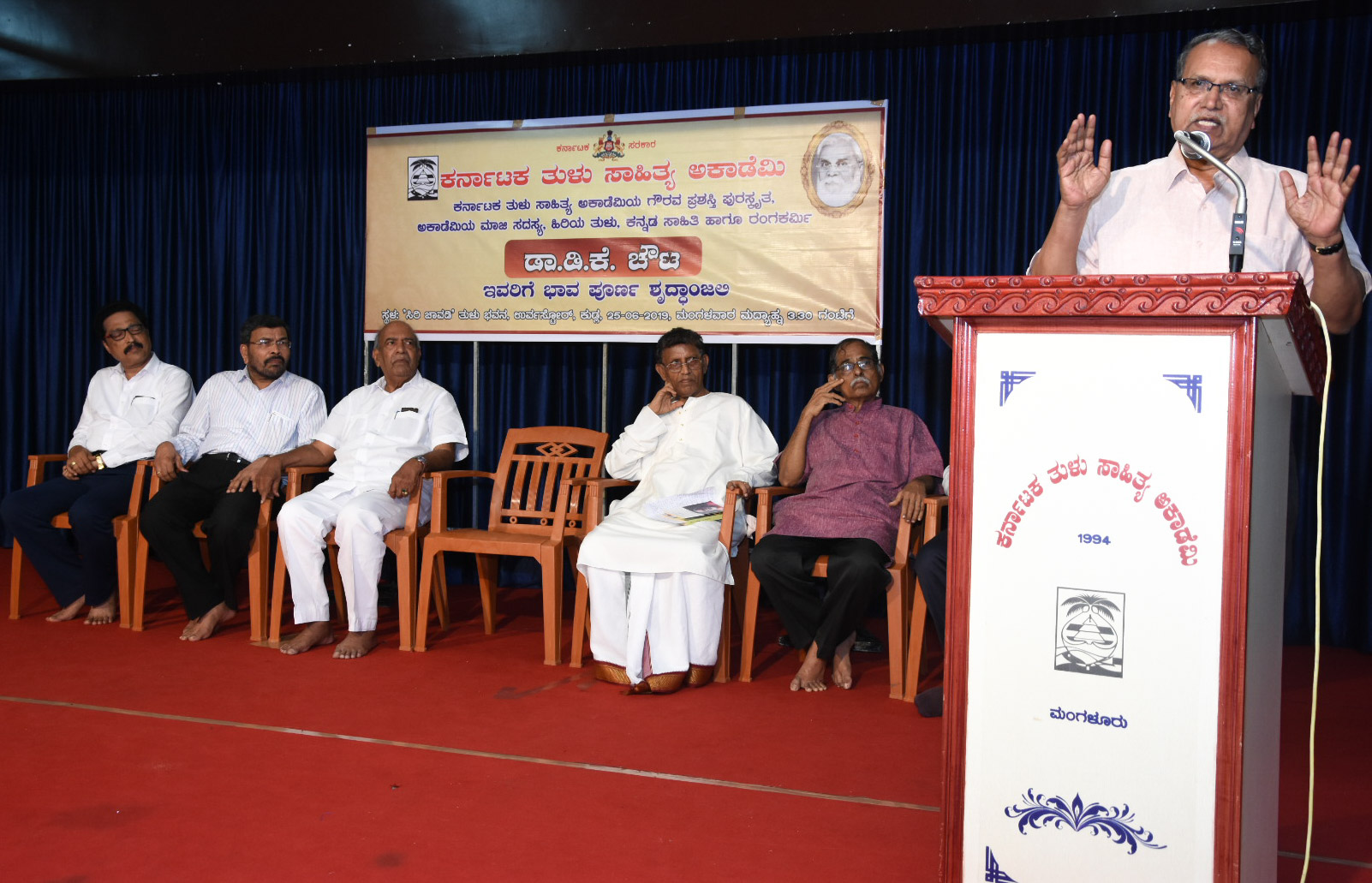 ತುಳು ಸಾಹಿತ್ಯ ಅಕಾಡಮಿಯ ವತಿಯಿಂದ ನಗರದ ತುಳು ಭವನದ ಸಿರಿ ಚಾವಡಿಯಲ್ಲಿ ಸಾಹಿತಿ, ರಂಗಕರ್ಮಿ ಡಿ.ಕೆ.ಚೌಟರಿಗೆ ಮಂಗಳವಾರ ನಡೆದ ಶ್ರದ್ದಾಂಜಲಿ ಸಭೆಯಲ್ಲಿ ಅವರು ಮಾತನಾಡಿದರು.