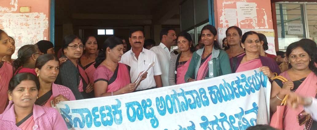 ಮೂಡಿಗೆರೆ: ಅಂಗನವಾಡಿ ಕೇಂದ್ರಗಳಲ್ಲಿ ಎಲ್ಕೆಜಿ, ಯುಕೆಜಿ ಪ್ರಾರಂಭಿಸಲು ಒತ್ತಾಯಿಸಿ ಧರಣಿ