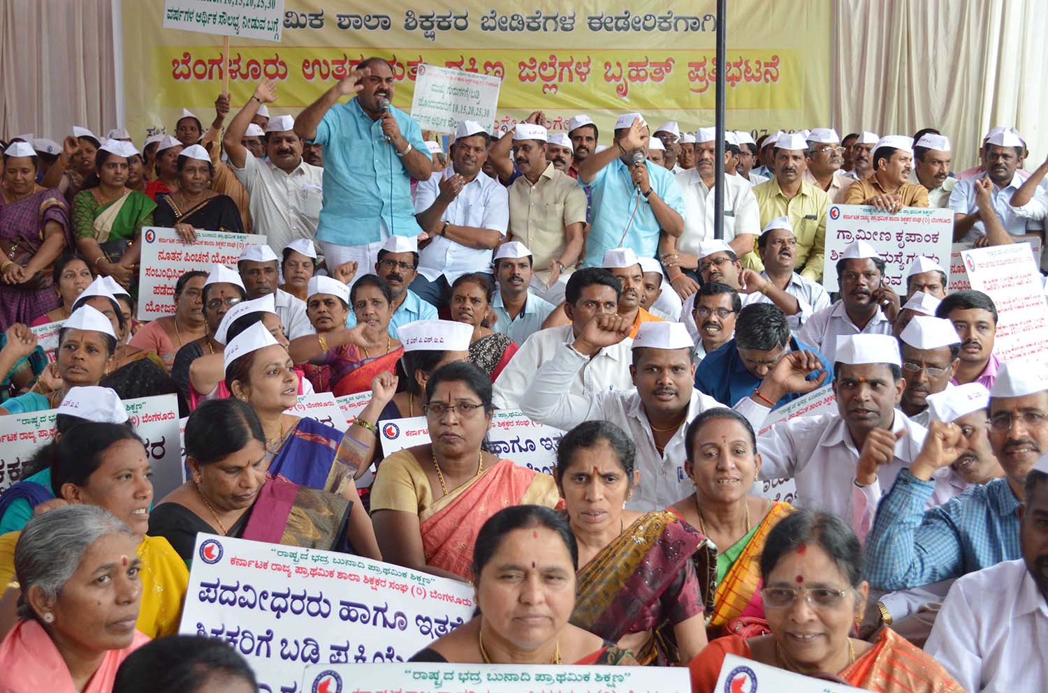 ಮಂಗಳವಾರ ನಗರದ ಮೌರ್ಯ ವೃತ್ತದ ಗಾಂಧಿ ಪ್ರತಿಮೆ ಮುಂಭಾಗ ಜಮಾಯಿಸಿದ ರಾಜ್ಯ ಪ್ರಾಥಮಿಕ ಶಾಲಾ ಶಿಕ್ಷಕರ ಸಂಘದ ನೂರಾರು ಸದಸ್ಯರು, ಪ್ರಾಥಮಿಕ ಶಾಲೆಗಳಲ್ಲಿ ಕರ್ತವ್ಯ ನಿರ್ವಹಿಸುತ್ತಿರುವ ಶಿಕ್ಷಕರನ್ನು ಪದವಿ ಪೂರ್ಣಗೊಳಿಸಿರುವ ಶಿಕ್ಷಕರರೆಂದು ಪರಿಗಣಿಸಿಬೇಕು. ವೇತನ ನಿಗದಿಗೊಳಿಸುವುದು ಸೇರಿದಂತೆ ಇನ್ನಿತರ ಬೇಡಿಕೆಗಳನ್ನು ಈಡೇರಿಸುವಂತೆ ಆಗ್ರಹಿಸಿದರು