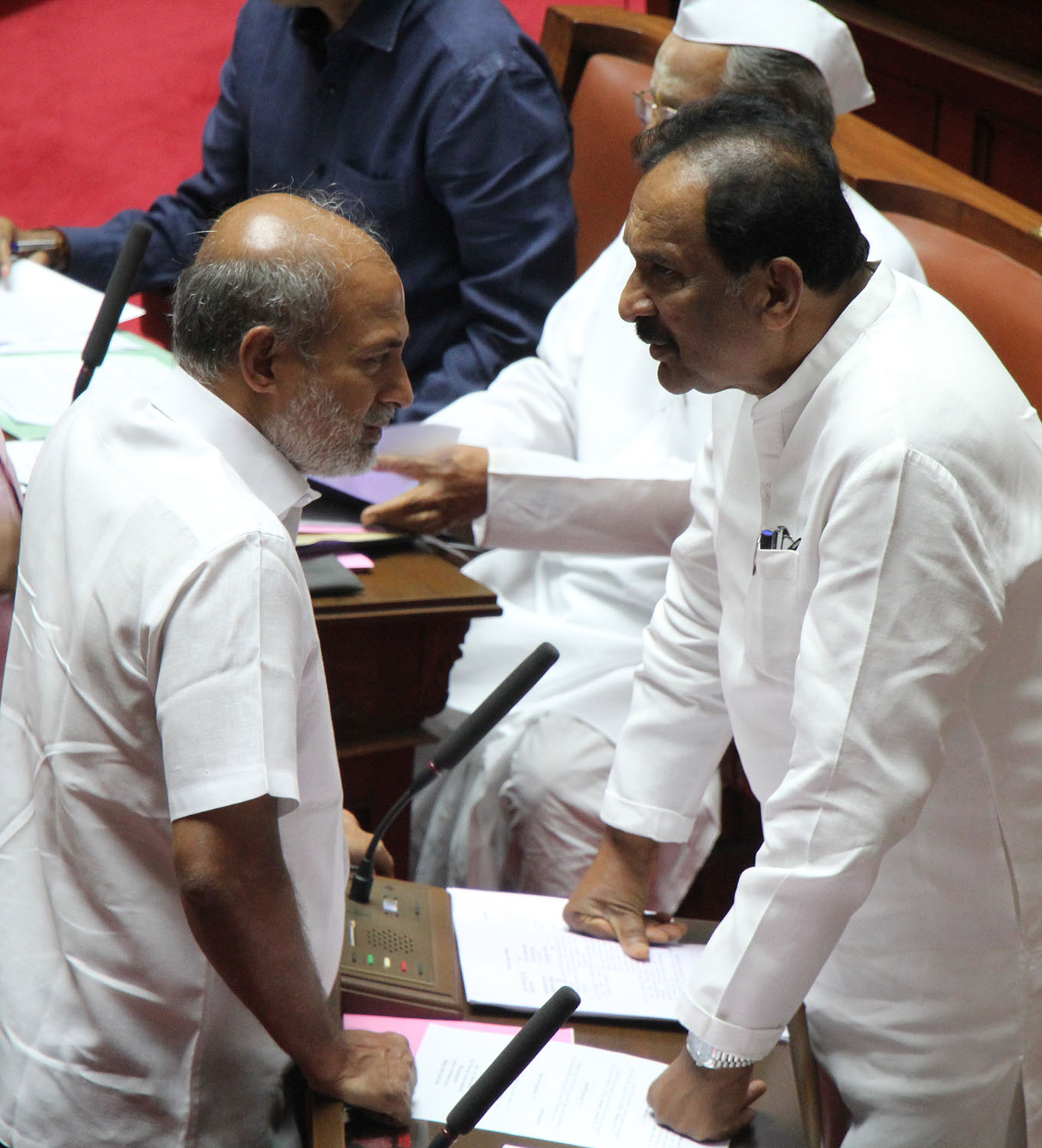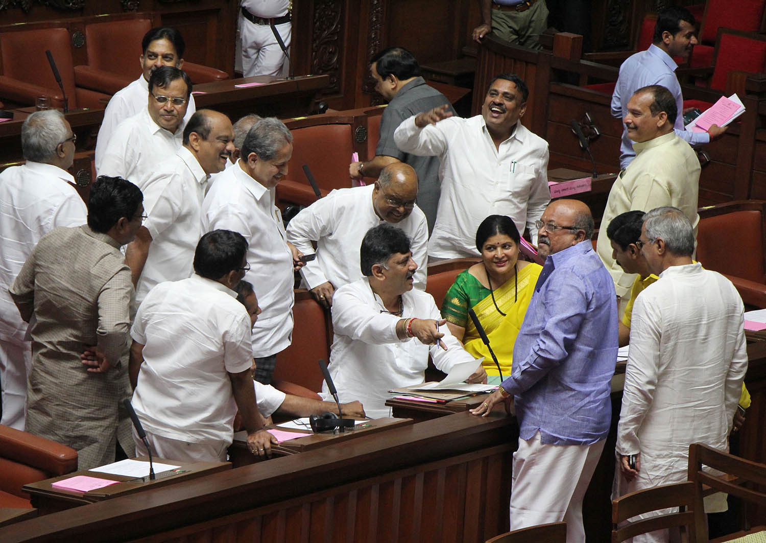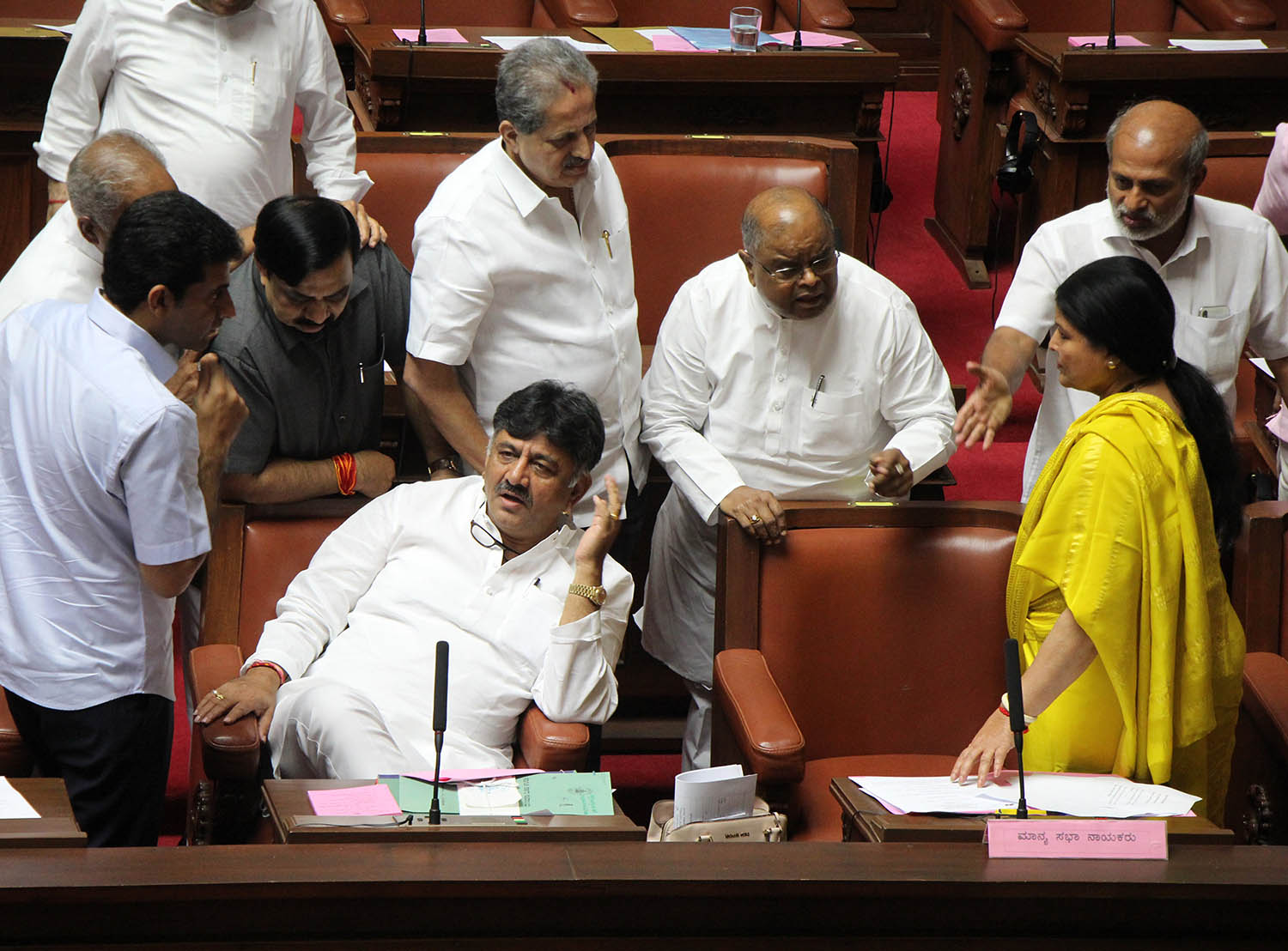 ಈ ಸಂದರ್ಭದಲ್ಲಿ ಎದ್ದುನಿಂತ ಸಚಿವ ಡಿ.ಕೆ. ಶಿವಕುಮಾರ್, ನಾನೇ ಸರಕಾರ. ಇಲ್ಲಿಯೇ ಇದೆ ಸರಕಾರ ಎಂದು ತಮ್ಮ ಸಾಲಿನಲ್ಲಿ ಕುಳಿತ ಸಚಿವರನ್ನು ತೋರಿಸಿದರು. ವಿಧಾನ ಪರಿಷತ್ ಸಭಾ ನಾಯಕಿ ಹಾಗೂ ಸಚಿವೆ ಜಯಮಾಲಾ ಮಾತನಾಡಿ, ರಾಜ್ಯದ ಸಮಸ್ಯೆಗಳ ಬಗ್ಗೆ ಚರ್ಚಿಸಲು ಅವಕಾಶ ಮಾಡಿಕೊಡಬೇಕು ಎಂದು ಮನವಿ ಮಾಡಿದರು. ಸಚಿವ ಸಾ.ರಾ. ಮಹೇಶ್ ಅವರು ಮಾತನಾಡಿ, ಗುರುವಾರ ವಿಶ್ವಾಸ ಮತಯಾಚನೆಗೆ ದಿನ ನಿಗದಿಯಾಗಿದೆ. ಆದರೂ ಈಗಲೇ ಸಿಎಂ ಅವರು ತಮ್ಮ ಸ್ಥಾನಕ್ಕೆ ರಾಜೀನಾಮೆ ನೀಡಬೇಕು ಎಂದು ಪಟ್ಟು ಹಿಡಿಯುವುದು ಸರಿಯಲ್ಲ. ಅಲ್ಲದೆ, ವಿಶ್ವಾಸ ಮತಯಾಚನೆಯನ್ನು ಬೀದಿ ಬದಿಯಲ್ಲಿ ಯಾಚಿಸಲು ಬರುವುದಿಲ್ಲ ಎಂದು ತಿರುಗೇಟು ನೀಡಿದರು. ಮಧ್ಯಪ್ರವೇಶಿಸಿದ ಉಪ ಸಭಾಪತಿಗಳು 15 ನಿಮಿಷಗಳ ಕಾಲ ಕಲಾಪ ಮುಂದೂಡಿದರು. ಪುನರಾರಂಭವಾಗುತ್ತಿದ್ದಂತೆ ಮತ್ತೆ ಆರೋಪ-ಪ್ರತ್ಯಾರೋಪಗಳು ಮತ್ತೆ ಶುರುವಾದವು. ಇವುಗಳ ನಡುವೆಯೇ ಪ್ರಶ್ನೋತ್ತರ ಮಂಡನೆ ಆಯಿತು. ಬಳಿಕ ಸಭೆಯನ್ನು ಜುಲೈ 18ಕ್ಕೆ ಮುಂದೂಡಲಾಯಿತು.