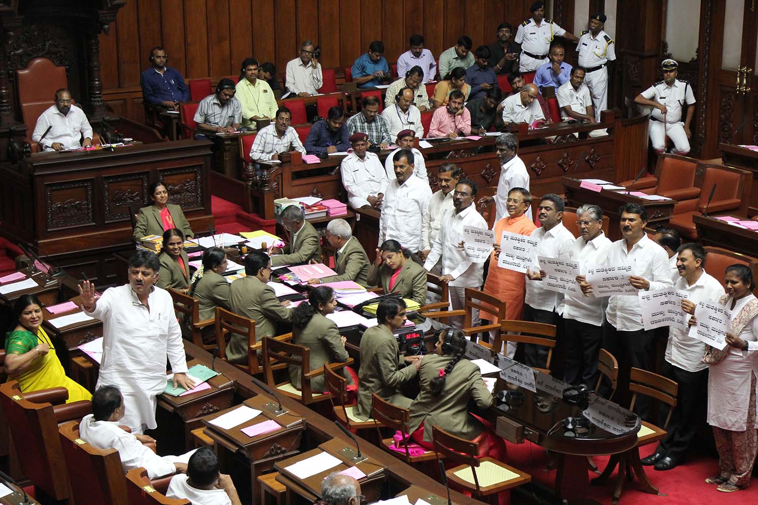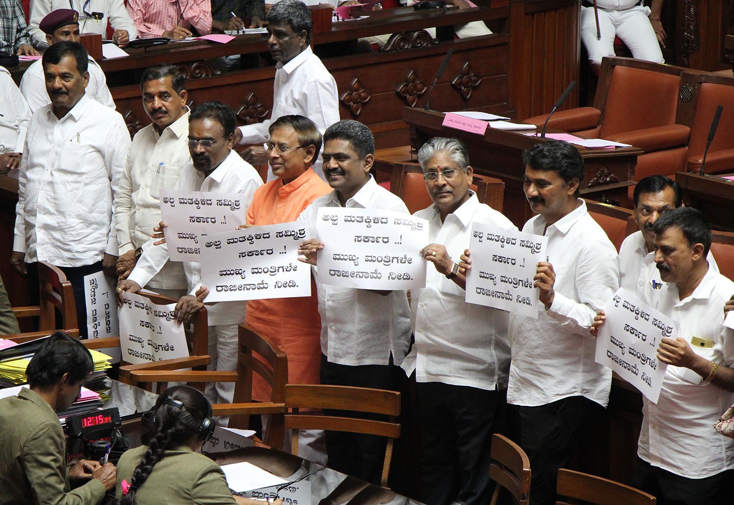 ಕಲಾಪ ಶುರುವಾಗುತ್ತಿದ್ದಂತೆ ಮುಖ್ಯಮಂತ್ರಿಗಳ ರಾಜೀನಾಮೆಗೆ ಒತ್ತಾಯಿಸಿ ಫಲಕಗಳನ್ನು ಹಿಡಿದು ಪ್ರತಿಪಕ್ಷದ ಸದಸ್ಯರು ಬಾವಿಗಿಳಿದರು. ಆಗ ಉಪ ಸಭಾಪತಿಗಳು ಬಾವಿಯಿಂದ ಹೊರಬನ್ನಿ ಮಾತನಾಡಲು ಅವಕಾಶ ಮಾಡಿಕೊಡಲಾಗುವುದು ಎಂದು ಹೇಳಿದರು. ಆದರೆ ಪಟ್ಟುಸಡಿಲಿಸದ ಬಿಜೆಪಿ ಸದಸ್ಯರು, ಕೊಡಿ ಕೊಡಿ ರಾಜೀನಾಮೆ ಕೊಡಿ ಎಂದು ಘೋಷಣೆ ಕೂಗಿದರು. ಇದರಿಂದ ಕೆರಳಿದ ಕಾಂಗ್ರೆಸ್ ಸದಸ್ಯರು, ನಿಲ್ಲಿಸಿ ನಿಲ್ಲಿಸಿ ಕುದುರೆ ವ್ಯಾಪಾರ ನಿಲ್ಲಿಸಿ ಎಂದು ತಿರುಗೇಟು ನೀಡಿದರು. ಈ ಮಧ್ಯೆ ಪ್ರತಿಪಕ್ಷದ ನಾಯಕ ಕೋಟ ಶ್ರೀನಿವಾಸ ಪೂಜಾರಿ ಮಾತನಾಡಿ, ಸಚಿವರೆಲ್ಲರೂ ತಮ್ಮದೆ ಕಾರಣ ನೀಡಿ ರಾಜೀನಾಮೆ ನೀಡಿದ್ದಾರೆ. ಮುಖ್ಯಮಂತ್ರಿಗಳು ವಿಶ್ವಾಸ ಮತಯಾಚನೆಗೆ ಮುಂದಾಗಿದ್ದಾರೆ. ಮತ್ತೊಂದೆಡೆ ಅತೃಪ್ತ ಶಾಸಕರು ರಾಜೀನಾಮೆ ನೀಡಿದ್ದಾರೆ. ಹೀಗಾಗಿ, ಸರಕಾರಕ್ಕೆ ಅಸ್ತಿತ್ವವೇ ಇಲ್ಲ ಎಂದು ಆರೋಪಿಸಿದರು. ಇದಕ್ಕೆ ಬಿಜೆಪಿ ಇತರ ಸದಸ್ಯರೂ ದನಿಗೂಡಿಸಿದರು.
