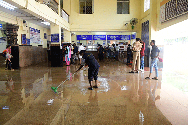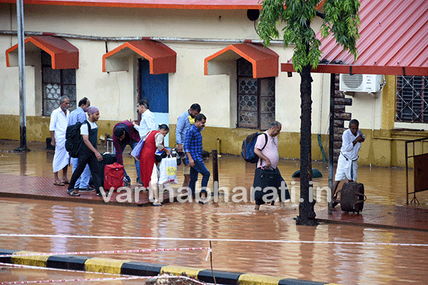ಮಂಗಳೂರಿನಲ್ಲಿರುವ ಕೇಂದ್ರ ರೈಲು ನಿಲ್ದಾಣದೊಳಗೆ ಮಳೆ ನೀರು ನುಗ್ಗಿದೆ. ಟಿಕೆಟ್ ಕೌಂಟರ್ ಹೊರಗಡೆ ನೀರು ನಿಂತಿದ್ದು, ಅದನ್ನು ಹೊರಹಾಕಲು ಸಿಬ್ಬಂದಿ ಶ್ರಮಿಸುತ್ತಿದ್ದಾರೆ.