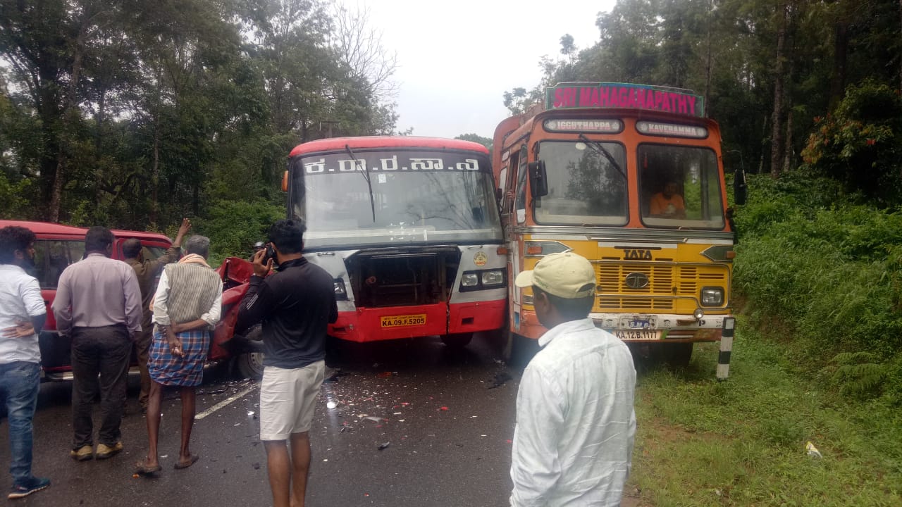 ಮಡಿಕೇರಿ, ಜು.24: ಲಾರಿ, ಬಸ್ ಮತ್ತು ಸ್ಕಾರ್ಫಿಯೋ ವಾಹನಗಳ ನಡುವೆ ಸರಣಿ ಅಪಘಾತ ನಡೆದ ಘಟನೆ ರಾಷ್ಟ್ರೀಯ ಹೆದ್ದಾರಿ 275ರ ಸ್ಯಾಂಡಲ್ಕಾಡು ಬಳಿ ಬುಧವಾರ ನಡೆದಿದೆ.
