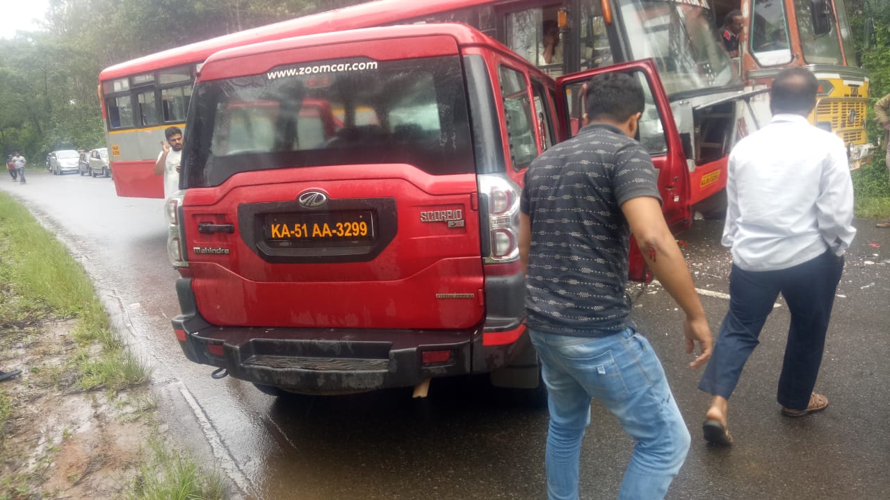 ಲಾರಿಯನ್ನು ಓವರ್ಟೇಕ್ ಮಾಡಲು ಯತ್ನಿಸಿದ ಕೆಎಸ್ಆರ್ಟಿಸಿ ಬಸ್ ಸ್ಕಾರ್ಫಿಯೋಗೆ ಢಿಕ್ಕಿಯಾಗಿದೆ ಎಂದು ಪ್ರತ್ಯಕ್ಷದರ್ಶಿಗಳು ತಿಳಿಸಿದ್ದಾರೆ. ಸ್ಕಾರ್ಫಿಯೋ ವಾಹನದಲ್ಲಿದ್ದ ಮಂಗಳೂರು ಮೂಲದ ನಾಲ್ವರು ಪ್ರವಾಸಿ ಯುವಕರು ಗಾಯಗೊಂಡಿದ್ದಾರೆ.