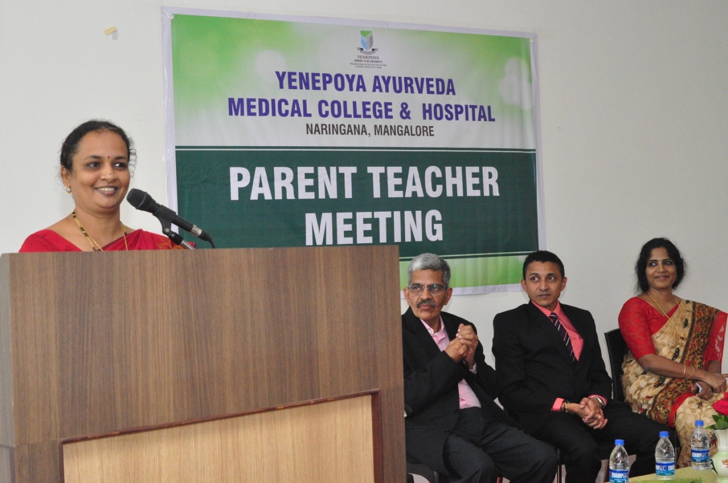 ಯೆನೆಪೊಯ ಆಯುರ್ವೇದ ಮೆಡಿಕಲ್ ಕಾಲೇಜಿನ ವಿದ್ಯಾರ್ಥಿ ಕಲ್ಯಾಣ ಅಧಿಕಾರಿ ಡಾ. ವಿದ್ಯಾ ಪ್ರಭಾ ಮಾತನಾಡಿ ಕಾಲೇಜಿನ ನೀತಿ, ನಿಯಮಗಳ ಕುರಿತಾಗಿ ಪೋಷಕರಿಗೆ ವಿವರಿಸಿದರು. ವಿದ್ಯಾರ್ಥಿಗಳ ಶೈಕ್ಷಣಿಕ ಹಾಗೂ ಪಠ್ಯೇತರ ಚಟುವಟಿಕೆಗಳಲ್ಲಿನ ಸಾಧನೆಗಳನ್ನು ತಿಳಿಸಿ ಶ್ಲಾಘಿಸಿದರು. ಉಪಪ್ರಾಂಶುಾಲೆ ಡಾ.ಶುಭದ ವಿ.ಐ. ವಂದಿಸಿದರು.