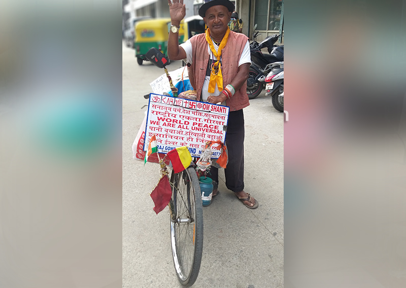 ಮುಂಬೈನಲ್ಲಿ ಸಿನಿಮಾಗಳಲ್ಲಿ ಪಾರ್ಟ್ ಟೈಂ ಆಗಿ ಕೆಲಸ ಮಾಡಿಕೊಂಡಿರುವ ಹಾಸನ ನಗರದ ನಿವಾಸಿ ನಾಗರಾಜ್ ದೇಶದ ಹಿತಕ್ಕಾಗಿ ಸೈಕಲ್ ಯಾತ್ರೆ ಶುರು ಮಾಡಿದ್ದಾರೆ. ಭಾರತೀಯರು ನಾವೆಲ್ಲ ಒಂದೇ. ಎಲ್ಲರೂ ಅಣ್ಣ ತಮ್ಮಂದಿರಂತೆ ಇರಬೇಕು. ಪರಸ್ಪರ ಸಹಾಯ, ಸಹಕಾರ ಮನೋಭಾವದಿಂದ ಬಾಳಬೇಕು. ದೇಶದ ಹಿತಕ್ಕಾಗಿ ನಾವೆಲ್ಲರೂ ಬದ್ಧರಾಗಿರಬೇಕು. ಕುಡಿಯುವ ನೀರು ಉಳಿಸಬೇಕು. ಗಿಡ ಮರಗಳನ್ನು ಬೆಳೆಸಬೇಕು. ಪರಿಸರ ಕಲುಷಿತ ಮಾಡಬಾರದು ಎಂಬ ಸಂದೇಶವನ್ನು ಅವರು ಸಾರುತ್ತಿದ್ದಾರೆ. ಯಾತ್ರೆಯುದ್ದಕ್ಕೂ ಜನರು ನೀಡುವ ದಾನವೇ ಅವರ ಹೊಟ್ಟೆ ತುಂಬಿಸುತ್ತಿದೆ. ಆಯಾ ನಗರ, ಪಟ್ಟಣಗಳಲ್ಲಿನ ಮಂದಿರ, ಆಶ್ರಮ, ಗುರುದ್ವಾರಾ, ಗಾಂಧಿ ಆಶ್ರಮ, ಇಸ್ಕಾನ್ ಸೇರಿದಂತೆ ವಿವಿಧೆಡೆ ಉಳಿದುಕೊಳ್ಳುತ್ತಿದ್ದಾರೆ. ಹೊಟ್ಟೆಗೆ ಊಟ, ವಿಶ್ರಾಂತಿಗೆ ಸ್ಥಳ ಸಿಕ್ಕರೆ ಸಾಕು ಅಲ್ಲಿ ರಾತ್ರಿ ಕಳೆದು ಮರುದಿನ ಮತ್ತೆ ಸೈಕಲ್ ಪ್ರಯಾಣ ಶುರು ಮಾಡುತ್ತಾರೆ. ಎಲ್ಲ ಧರ್ಮಗಳು ಶಾಂತಿ, ಸಹೋದರತೆಯನ್ನೆ ಸಾರುತ್ತವೆ. ಎಲ್ಲರೂ ಆಯಾ ಧರ್ಮಗಳಲ್ಲಿದ್ದರೂ ಅಣ್ಣ ತಮ್ಮಂದಿರಂತೆ ಬಾಳಬೇಕು ಎಂದು ಅವರು ಪ್ರತಿಪಾದಿಸುತ್ತಿದ್ದಾರೆ.