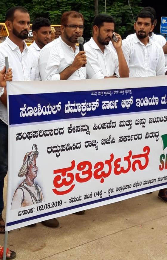 ಈ ಸಂದರ್ಭ ಎಸ್ಡಿಪಿಐ ದ.ಕ.ಜಿಲ್ಲಾಧ್ಯಕ್ಷ ಅಥಾವುಲ್ಲಾ ಜೋಕಟ್ಟೆ ಮಾತನಾಡಿ ಟಿಪ್ಪು ಜಯಂತಿ ಆಚರಿಸಬೇಕು ಎಂಬ ಬೇಡಿಕೆಯನ್ನು ಮುಸ್ಲಿಂ ಸಮುದಾಯ ಕೇಳಿರಲಿಲ್ಲ. ಆದರೆ ಕಾಂಗ್ರೆಸ್ ಸರಕಾರ ಟಿಪ್ಪು ಜಯಂತಿಯನ್ನು ಜಾರಿಗೊಳಿಸಿತು. ದ್ವೇಷದ ರಾಜಕಾರಣ ಮಾಡುವುದಿಲ್ಲ ಎಂದು ಅಧಿಕಾರಕ್ಕೇರಿದ ವೇಳೆ ಹೇಳಿಕೆ ನೀಡಿದ್ದ ಮುಖ್ಯಮಂತ್ರಿ ಯಡಿಯೂರಪ್ಪ ಇದೀಗ ದ್ವೇಷದ ರಾಜಕೀಯವನ್ನು ಕೊಡುಗೆಯಾಗಿ ನೀಡುತ್ತಿದ್ದಾರೆ. ಟಿಪ್ಪು ಜಯಂತಿಯನ್ನು ರದ್ದುಗೊಳಿಸುವ ಮೂಲಕ ಅವಿವೇಕಿತನ ಪ್ರದರ್ಶಿಸಿದ್ದಾರೆ. ಇದನ್ನು ಎಂದಿಗೂ ಸಹಿಸಲು ಸಾಧ್ಯವಿಲ್ಲ. ಇದರ ವಿರುದ್ಧ ಜನಾಂದೋಲನ ಮತ್ತು ಕಾನೂನು ಹೋರಾಟ ಮಾಡಲಾಗುವುದು ಎಂದು ಹೇಳಿದರು.