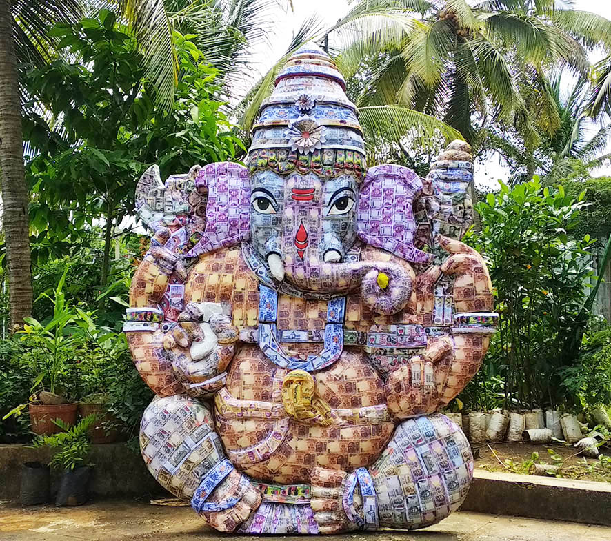 ಉಡುಪಿ: 21 ದೇಶಗಳ ನೋಟು ಬಳಸಿ 12 ಅಡಿ ಎತ್ತರದ ಗಣೇಶ ಕಲಾಕೃತಿ ರಚನೆ