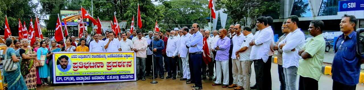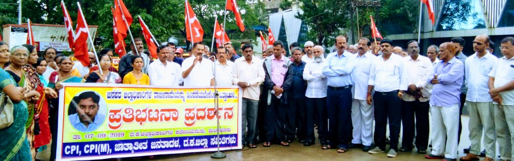ದ.ಕ.ಜಿಲ್ಲಾಧಿಕಾರಿ ಕಚೇರಿ ಎದುರು ಸಿಪಿಐ, ಸಿಪಿಎಂ ಹಾಗೂ ಜಾತ್ಯತೀತ ಜನತಾದಳ ಪಕ್ಷಗಳ ಜಂಟಿ ನೇತೃತ್ವದಲ್ಲಿ ಶನಿವಾರ ನಡೆದ ಪ್ರತಿಭಟನಾ ಪ್ರದರ್ಶನದಲ್ಲಿ ಮಾತನಾಡಿದ ಸಿಪಿಎಂ ಜಿಲ್ಲಾ ಕಾರ್ಯದರ್ಶಿ ವಸಂತ ಆಚಾರಿ, ದೇಶದ ಸಂವಿಧಾನದ ಮೇಲೆ ತೀವ್ರ ದಾಳಿ ನಡೆಯುತ್ತಿರುವಾಗ ಅಧಿಕಾರಿಗಳು ನಿಷ್ಠೆಯಿಂದ ಕೆಲಸ ಮಾಡಲು ಸಾಧ್ಯವಿಲ್ಲದ ವಾತಾವರಣ ದೇಶದಲ್ಲಿದೆ ಎಂದು ಕೇಂದ್ರ ಸರಕಾರದ ವಿರುದ್ಧ ವಾಗ್ದಾಳಿ ನಡೆಸಿದರು.