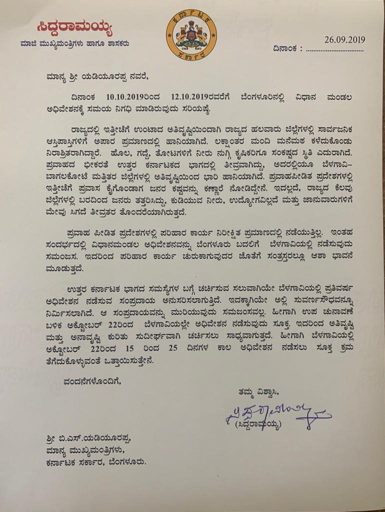 ಆದುದರಿಂದ, ಅಕ್ಟೋಬರ್ 10 ರಿಂದ 12ರವರೆಗೆ ಬೆಂಗಳೂರಿನಲ್ಲಿ ವಿಧಾನಮಂಡಲ ಅಧಿವೇಶನ ನಡೆಸುವ ಬದಲು, ಅಕ್ಟೋಬರ್ 22 ರಿಂದ (15 ರಿಂದ 25 ದಿನಗಳ ಕಾಲ) ಅಧಿವೇಶನ ನಡೆಸಲು ಸೂಕ್ತ ಕ್ರಮ ತೆಗೆದುಕೊಳ್ಳುವಂತೆ ಸಿದ್ದರಾಮಯ್ಯ ಪತ್ರದಲ್ಲಿ ಒತ್ತಾಯಿಸಿದ್ದಾರೆ.