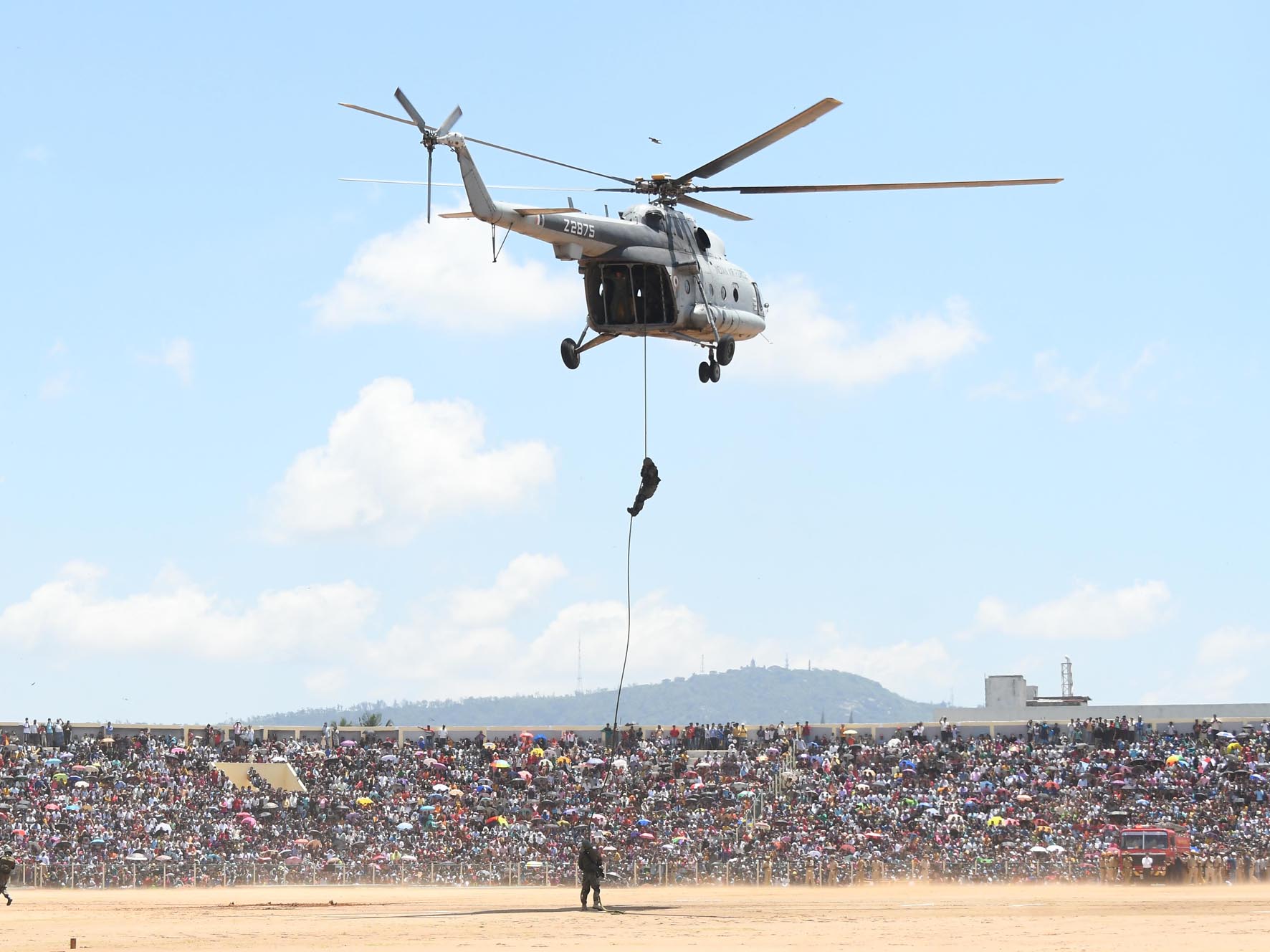 ಭಾರತೀಯ ವಾಯು ಪಡೆಯಿಂದ ನಡೆದ ಈ ಕಾರ್ಯಕ್ರಮದಲ್ಲಿ ಬುಧವಾರ ಮೊದಲಿಗೆ ಹೆಲಿಕ್ಯಾಪ್ಟರ್ ಮೂಲಕ ಗುಲಾಬಿ ಹೂಗಳನ್ನು ಮೈದಾನಕ್ಕೆ ಚೆಲ್ಲುತ್ತಾ ಮೈದಾನದ ಸುತ್ತಪ್ರದರ್ಶನ ಮಾಡುವ ಮೂಲಕ ಪೆಟಲ್ ರಾಪಿಂಗ್ ಮಾಡಲಾಯಿತು. ನಂತರ ಭಾರತೀಯ ಯುದ್ಧ ವಿಮಾನದ ಮೂಲಕ ಯುದ್ಧದ ಸಮಯದಲ್ಲಿ ವಾಯುಪಡೆ ಹೇಗೆ ಕಾರ್ಯಾಚರಣೆ ಮಾಡಲಿದೆ ಎಂಬುದನ್ನು ತೋರಿಸುವ ಸಲುವಾಗಿ ಆಪರೇಷನ್ ಕಾರ್ಯಾಚರಣೆ ಮಾಡಿ ಯುದ್ಧ ವಿಮಾನದಿಂದ 6 ಜನ ಯೋಧರು ಹಗ್ಗದ ಮೂಲಕ ಮೈದಾನಕ್ಕಿಳಿಯುವ ದೃಶ್ಯ ನೋಡುಗರ ಮೈನವಿರೇಳಿಸಿತು.