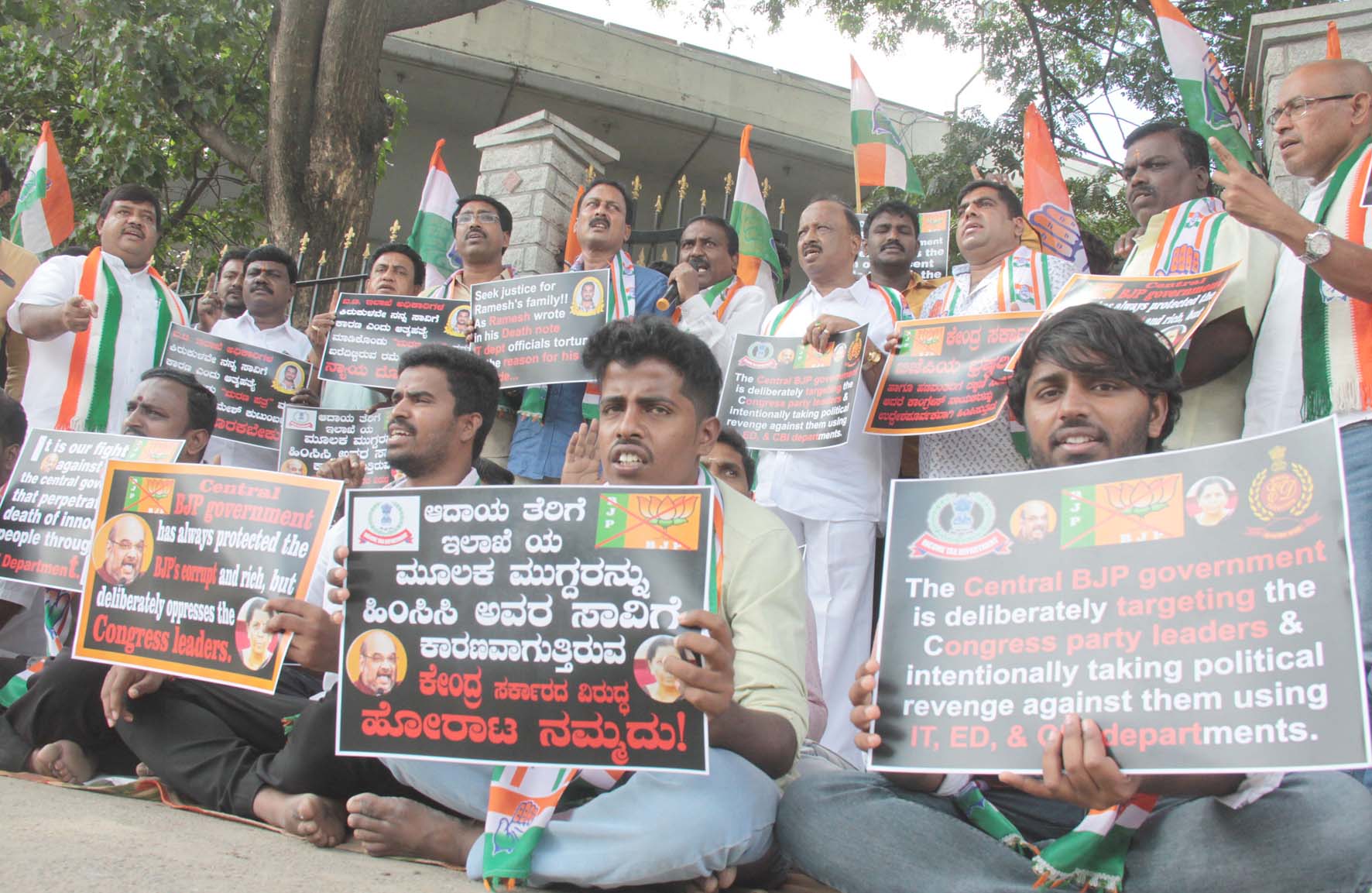 ರವಿವಾರ ನಗರದ ಮೌರ್ಯ ವೃತ್ತದಲ್ಲಿ ಕಾಂಗ್ರೆಸ್ ಮುಖಂಡ ಮನೋಹರ್ ನೇತೃತ್ವದಲ್ಲಿ ಪ್ರತಿಭಟನೆಯಲ್ಲಿ ಕೇಂದ್ರ ಸರಕಾರದ ವಿರುದ್ಧ ಕಾರ್ಯಕರ್ತರು ಆಕ್ರೋಶ ವ್ಯಕ್ತಪಡಿಸಿದರು. ರಮೇಶ್ ಸಾವಿಗೆ ಐಟಿ ಅಧಿಕಾರಿಗಳ ಕಿರುಕುಳವೇ ಕಾರಣ. ಐಟಿ ಇಲಾಖೆ ಕೇಂದ್ರ ಸರಕಾರದ ಕೈಗೊಂಬೆಯಾಗಿದೆ. ಮುಗ್ಧ ಅಮಾಯಕರು ಕಿರುಕುಳಕ್ಕೆ ಬಲಿಯಾಗುತ್ತಿದ್ದಾರೆ. ರಮೇಶ್ ಸಾವಿಗೆ ನ್ಯಾಯ ಸಿಗಬೇಕಿದೆ ಎಂದು ಆಗ್ರಹಿಸಿದರು.