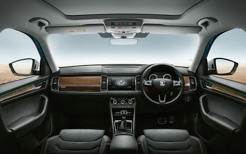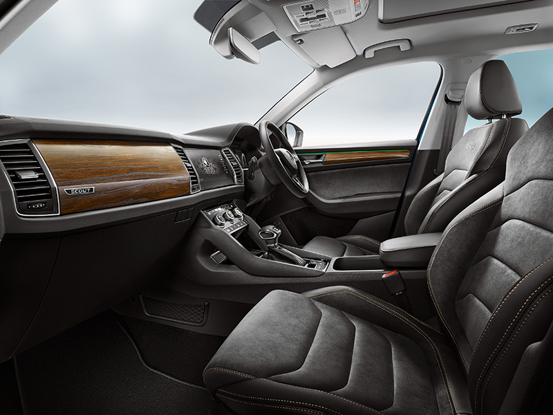 * ಪ್ರಿಮಿಯಂ ಕಪ್ಪು ಆಂತರಿಕ ವಿನ್ಯಾಸ ಹೊಂದಿದ್ದು, ಅಲ್ಕಾಂತರ ಚರ್ಮ ಹಾಗೂ ಮರದ ಅಲಂಕರಣ ಸ್ಕೋಡಾ ಕೋಡಿಯಾಕ್ ಸ್ಕೌಟ್ನ ಕ್ರಿಯಾಶೀಲ ನೋಟಕ್ಕೆ ಕಾರಣವಾಗಿದೆ.