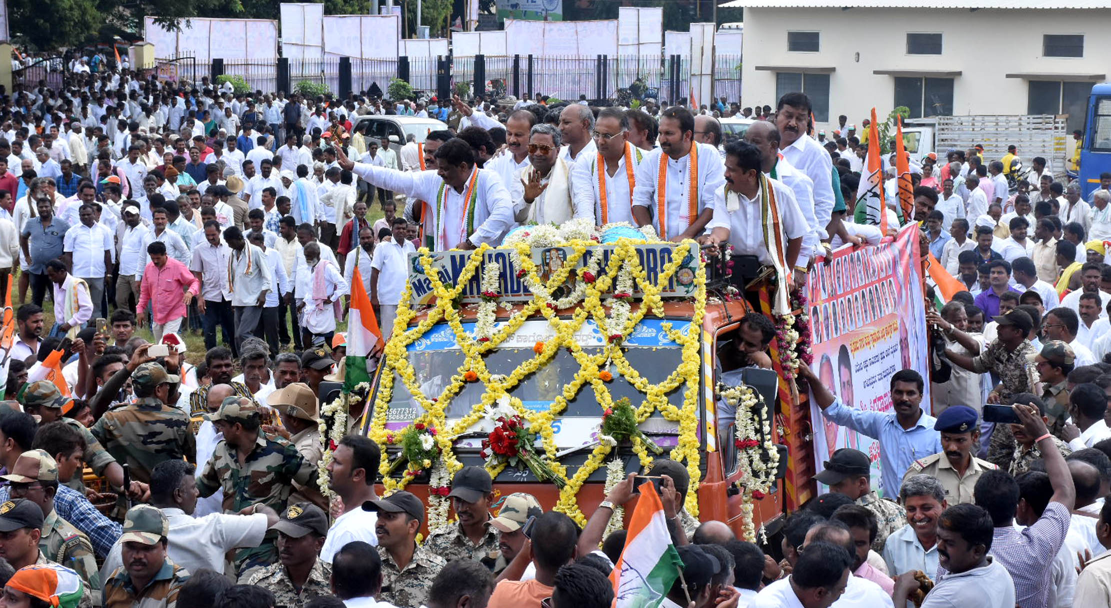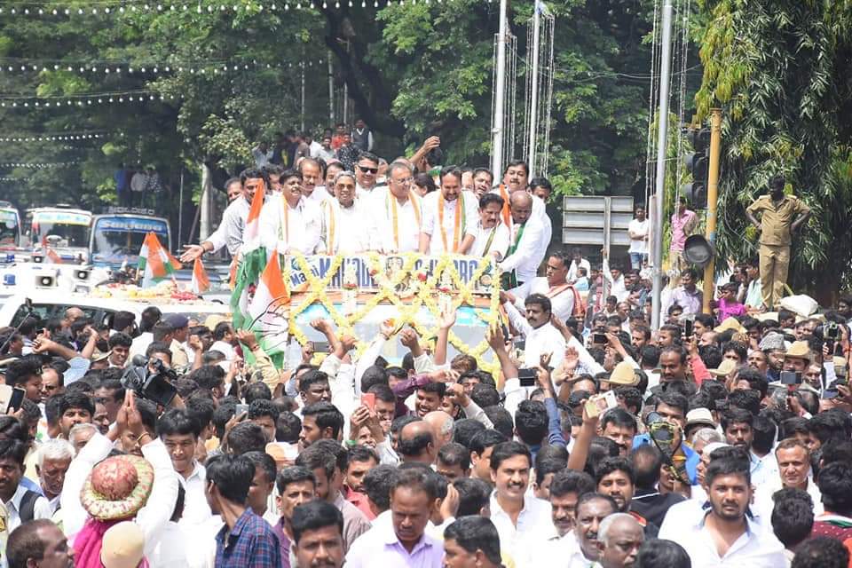 ಇದಕ್ಕೂ ಮೊದಲು ನಗರದ ಬಂಬೂ ಬಜಾರ್ ರಸ್ತೆಯಲ್ಲಿರುವ ಹಳೆ ಆರ್.ಎಂ.ಸಿ ಬಳಿ ಸಿದ್ದರಾಮಯ್ಯ ಅವರಿಗೆ ಅದ್ದೂರಿ ಸ್ವಾಗತ ನೀಡಲಾಯಿತು. ತೆರೆದ ವಾಹನದಲ್ಲಿ ಮೆರವಣಿಗೆ ಮೂಲಕ ಆಯುರ್ವೇದ ಆಸ್ಪತ್ರೆ ಸರ್ಕಲ್, ಕೆ.ಆರ್.ಆಸ್ಪತ್ರೆ ರಸ್ತೆ, ರೈಲ್ವೆ ನಿಲ್ದಾಣಗಳ ಮೂಲಕ ಕಾಂಗ್ರೆಸ್ ಕಚೇರಿಗೆ ಕರೆದುಕೊಂಡು ಬರಲಾಯಿತು. ಇದೇ ವೇಳೆ ಹಲವು ಕಲಾತಂಡಗಳು ಭಾಗವಹಿಸಿದ್ದವು. ಸಾವಿರಾರು ಸಂಖ್ಯೆಯಲ್ಲಿ ಕಾರ್ಯಕರ್ತರು ಅಭಿಮಾನಿಗಳು ಆಗಮಿಸಿ ತಮ್ಮ ನೆಚ್ಚಿನ ನಾಯಕನಿಗೆ ಜೈಕಾರ ಕೂಗಿದರು.