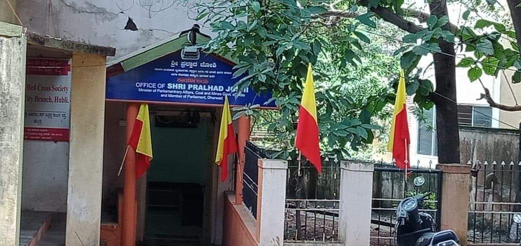 ಕೇಂದ್ರ ಸಚಿವ ಪ್ರಹ್ಲಾದ್ ಜೋಶಿ ಅವರು ಕನ್ನಡ ರಾಜ್ಯೋತ್ಸವದಲ್ಲಿ ಕನ್ನಡ ಬಾವುಟ ಹಾರಿಸಬೇಡಿ ಎಂದು ವಿವಾದಿತ ಹೇಳಿಕೆ ನೀಡಿದ್ದ ಹಿನ್ನೆಲೆ ಅವರ ಕಚೇರಿಯಲ್ಲಿಯೇ ಕನ್ನಡ ಬಾವುಟ ಹಾರಿಸಲಾಗಿದೆ ಎಂದು ಕಾರ್ಯಕರ್ತರು ಹೇಳಿದರು.