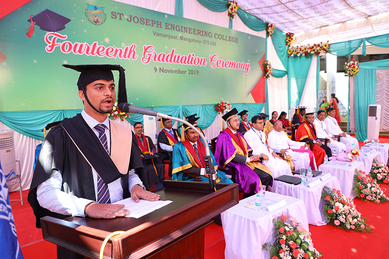ಪ್ರಾಂಶುಪಾಲರಾದ ಡಾ ರಿಯೊ ಡಿ'ಸೋಜಾ ಪದವಿ ಪ್ರಮಾಣವಚನ ನೀಡಿದರು. ಕಂಪ್ಯೂಟರ್ ಸೈನ್ಸ್ ಮತ್ತು ಎಂಜಿನಿಯರಿಂಗ್ ವಿಭಾಗದ ಪದವೀಧರರಾದ ರೊಯ್ಡೆನ್ ರೇಗೊ ಮತ್ತು ಎಂಬಿಎ ವಿಭಾಗದ ಪದವೀಧರರಾದ ರೀನಾ ಸಿಕ್ವೇರಾ ಅವರು 2019ರ ಸಾಲಿನ ಪದವೀಧರರ ಪರವಾಗಿ ಮಾತನಾಡಿದರು.