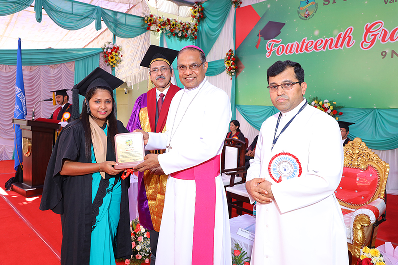 ಶೈಕ್ಷಣಿಕ ಸಾಧಕರು ಮತ್ತು ಕ್ರೀಡಾ ಸಾಧಕರನ್ನು ಮಂಗಳೂರಿನ ಬಿಷಪ್ ಮತ್ತು ಎಸ್ಜೆಇಸಿ ಅಧ್ಯಕ್ಷ ಅತಿ ವಂ ಡಾ. ಪೀಟರ್ ಪಾಲ್ ಸಲ್ಡಾನ್ಹಾ ಅವರು ಸನ್ಮಾನಿಸಿದರು. ತಮ್ಮ ಅಧ್ಯಕ್ಷೀಯ ಭಾಷಣದಲ್ಲಿ ಬಿಷಪ್, ಪದವೀಧರರು ಕಾಲೇಜಿನ ಹೆಮ್ಮೆ ಮತ್ತು ಆಸ್ತಿ ಎಂದು ಉಲ್ಲೇಖಿಸಿದರು. ಪದವೀಧರರನ್ನು ಅಭಿನಂದಿಸುತ್ತಾ ಮಾತನಾಡಿದ ಅವರು ಕೆಲಸದ ಸ್ಥಳಗಳಲ್ಲಿ ಪರಸ್ಪರ ಅವಲಂಬಿತವಾಗಿರುವ ಕೌಶಲ್ಯಗಳನ್ನು ಕಲಿಯುವಂತೆ ಹೇಳಿದರು. ಯಂತ್ರಗಳಿಗಿಂತ ಮನುಷ್ಯರು ಮುಖ್ಯ ಎಂದು ಹೇಳುತ್ತಾ ಮಾನವೀಯ ಮೌಲ್ಯಗಳನ್ನು ಅಳವಡಿಸಿಕೊಳ್ಳುವಂತೆ ಪದವೀಧರರಿಗೆ ಕರೆಯಿತ್ತರು.