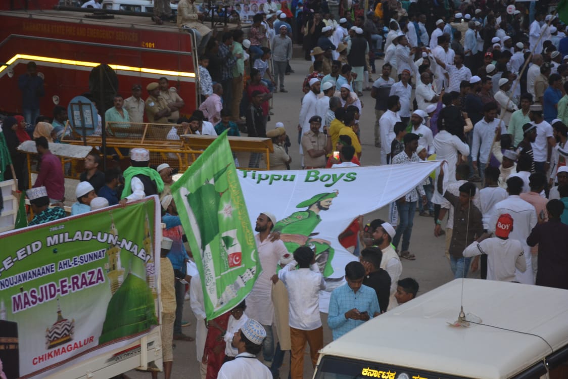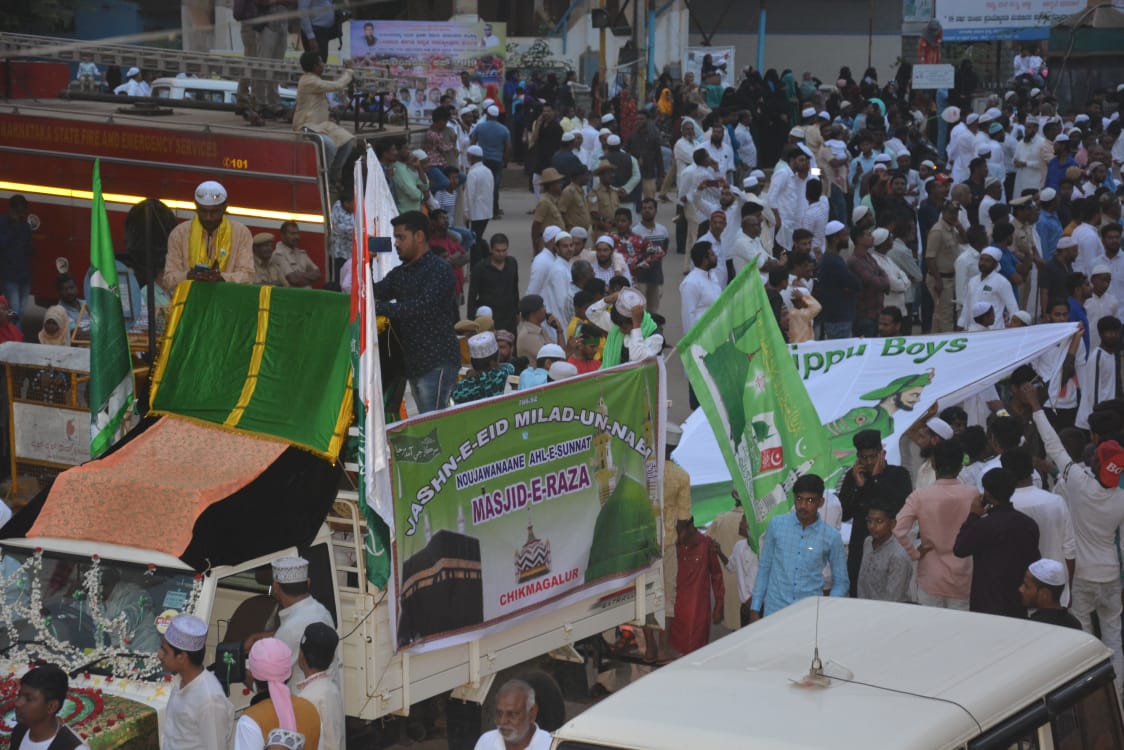ಚಿಕ್ಕಮಗಳೂರು, ನ.10: ಜಿಲ್ಲಾದ್ಯಂತ ಮೀಲಾದುನ್ನಬಿಯನ್ನು ಮುಸ್ಲಿಮರು ಸಂಭ್ರಮ ಸಡಗರದಿಂದ ಆಚರಿಸಿದ್ದು, ರವಿವಾರ ನಗರದಲ್ಲಿ ಸಾವಿರಾರು ಮಂದಿ ಅದ್ದೂರಿ ಮೆರವಣಿಗೆ ನಡೆಸುವ ಮೂಲಕ ಹಬ್ಬವನ್ನು ಶ್ರದ್ಧಾ ಭಕ್ತಿಯಿಂದ ಆಚರಿಸಿದರು.