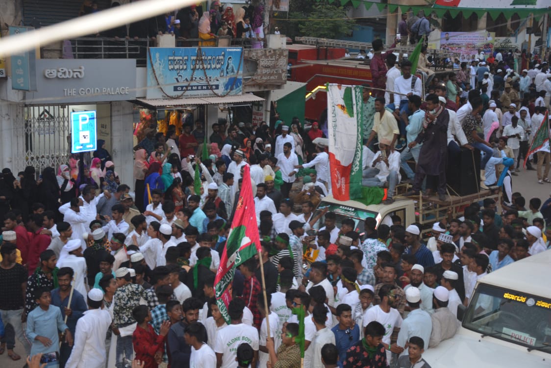 ಮಧ್ಯಾಹ್ನದ ನಂತರ ಅಂಡೆಛತ್ರದ ಮಸೀದಿಯಿಂದ ಮೀಲಾದುನ್ನಬಿ ಮೆರವಣಿಗೆ ಹೊರಡಲು ಸಿದ್ಧತೆ ಕೈಗೊಂಡಿದ್ದರಿಂದ ಜಿಲ್ಲಾಡಳಿತ ನಗರದ ಎಂ.ಜಿ ರಸ್ತೆ, ಐಜಿ ರಸ್ತೆ, ಹನುಮಂತಪ್ಪ ಸರ್ಕಲ್, ತೊಗರಿಹಂಕಲ್ ಸರ್ಕಲ್ ಮತ್ತಿತರ ರಸ್ತೆಗಳಲ್ಲಿ ಮಧ್ಯಾಹ್ನ 12ರಿಂದ ರಾತ್ರಿ 7ರವರೆಗೆ ವಾಹನ ಸಂಚಾರ ಹಾಗೂ ವಾಹನಗಳ ಪಾರ್ಕಿಂಗ್ ನಿಷೇಧಿಸಿತ್ತು. ಮಧ್ಯಾಹ್ನದ ನಗರದ ಅಂಡೆಛತ್ರದಿಂದ ಹೊರಟ ಮೀಲಾದುನ್ನಬಿ ಮೆರವಣಿಗೆ ಐಜಿ ರಸ್ತೆ, ಎಂಜಿ ರಸ್ತೆ ಮಾರ್ಗವಾಗಿ, ಬಸವನಹಳ್ಳಿ ರಸ್ತೆ, ಹನುಮಂತಪ್ಪ ಸರ್ಕಲ್ನಲ್ಲಿ ಅದ್ದೂರಿಯಾಗಿ ಸಾಗಿತು. ಮೆರವಣಿಗೆಯಲ್ಲಿ ನಗರದ ಸಾವಿರಾರು ಮುಸ್ಲಿಮರು ಭಾಗವಹಿಸುವ ಮೂಲಕ ಹಬ್ಬವನ್ನು ಸಂಭ್ರಮಿಸಿದರು.