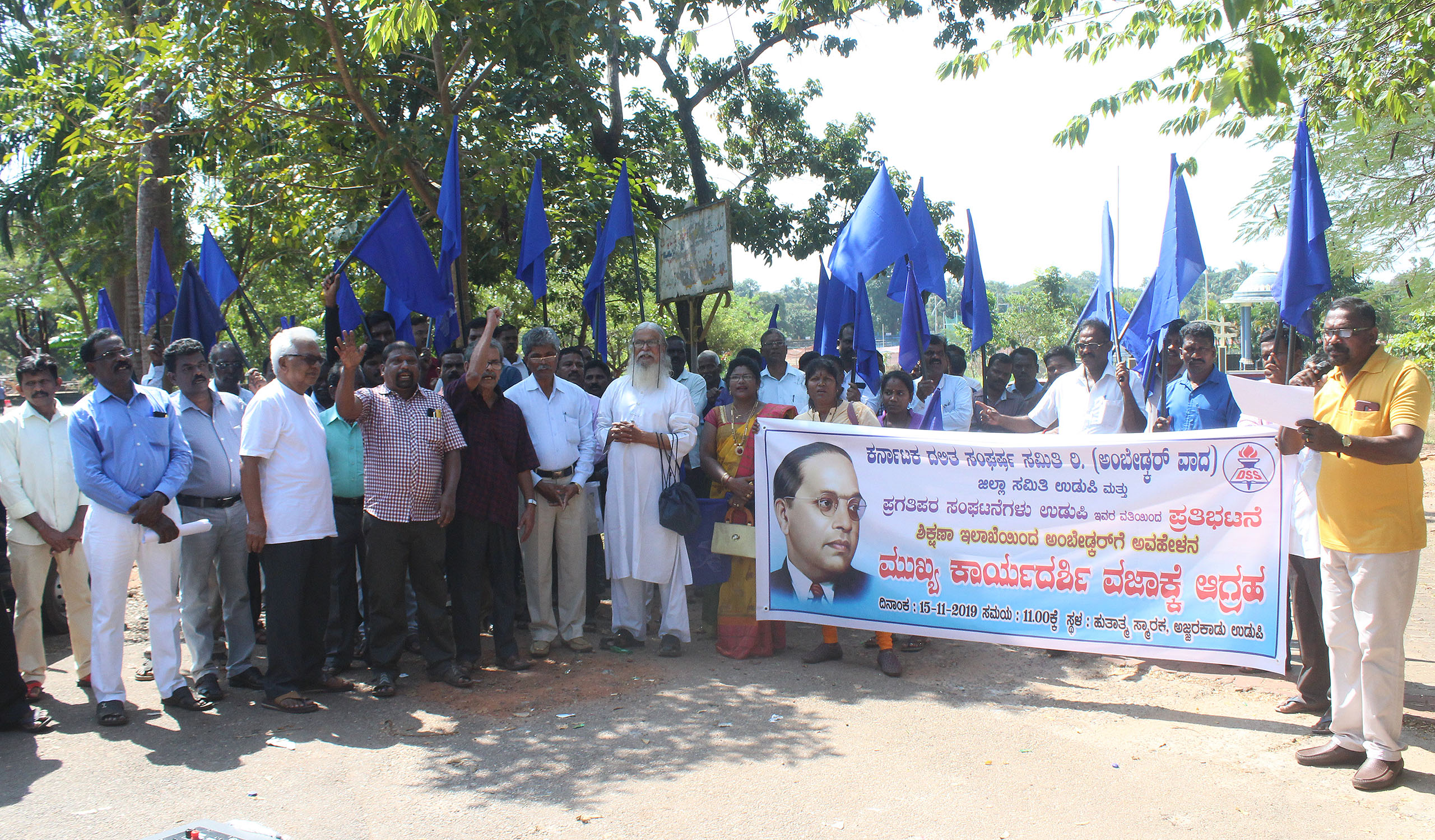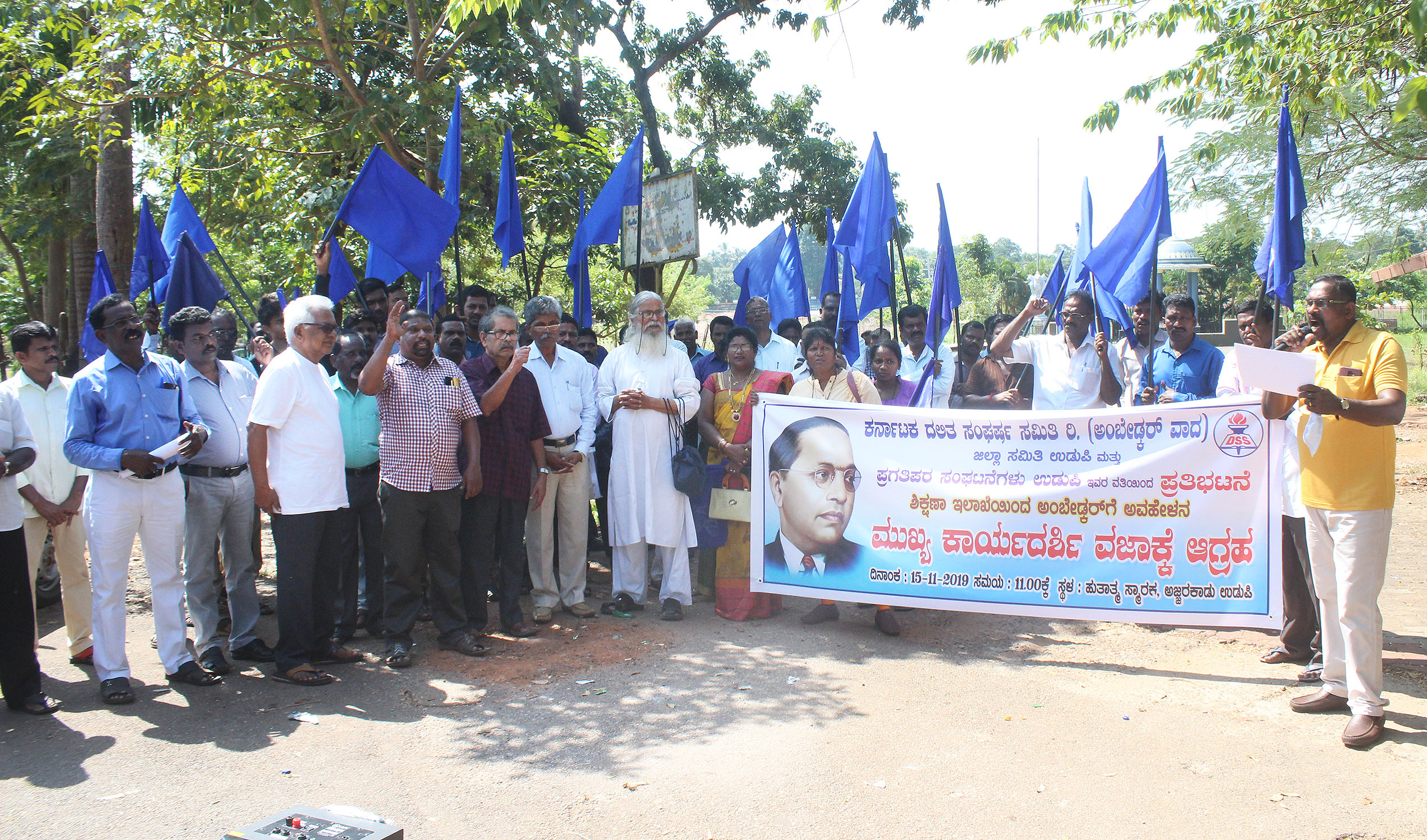 ಶಿಕ್ಷಣ ಇಲಾಖೆಯಿಂದ ಅಂಬೇಡ್ಕರ್ ಅವಹೇಳನ ಮಾಡಿರುವ ಮುಖ್ಯ ಕಾರ್ಯದರ್ಶಿಯ ವಜಾಕ್ಕೆ ಆಗ್ರಹಿಸಿ ಕರ್ನಾಟಕ ದಲಿತ ಸಂಘರ್ಷ ಸಮಿತಿ (ಅಂಬೇಡ್ಕರ್ ವಾದ) ಉಡುಪಿ ಜಿಲ್ಲಾ ಸಮಿತಿ ಮತ್ತು ಉಡುಪಿಯ ವಿವಿಧ ಪ್ರಗತಿಪರ ಸಂಘಟನೆಗಳ ವತಿಯಿಂದ ಅಜ್ಜರಕಾಡು ಹುತಾತ್ಮ ಸ್ಮಾರಕದ ಎದುರು ಶುಕ್ರವಾರ ಹಮ್ಮಿಕೊಳ್ಳಲಾದ ಧರಣಿಯನ್ನುದೆ್ದೀಶಿಸಿ ಅವರು ಮಾತ ನಾಡುತಿದ್ದರು.