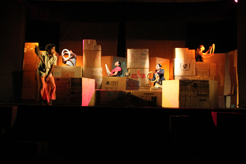 ನಾಟಕದಲ್ಲಿ ನಲುವತ್ತಕ್ಕೂ ಹೆಚ್ಚು ದೊಡ್ಡ ದೊಡ್ಡ ಗಾತ್ರದ ರಟ್ಟಿನ ಪೆಟ್ಟಿಗೆಗಳು ಪರಿಕರಗಳಾಗಿ ಬಳಕೆಯಾಗಿವೆ. ಆ ಪೆಟ್ಟಿಗೆಗಳ ಒಳಗೇನಿದೆ? ಖಾಲಿಯೋ ಅಥವಾ ತುಂಬಿದೆಯೋ, ಪೂರ್ತಿ ತುಂಬಿದೆಯೋ? ಇತ್ಯಾದಿ ಪ್ರಶ್ನೆಗಳು ಮೂಡುತ್ತಿರುವ ಸಂದರ್ಭದಲ್ಲಿಯೇ ಬೇರೆ ಬೇರೆ ಕೋನಗಳಿಂದ ಹಾದು ಬರುವ ಬೇರೆ ಬೇರೆ ಬಣ್ಣದ ಬೆಳಕು ರಟ್ಟಿನ ಪೆಟ್ಟಿಗೆಗಳನ್ನು ಬೇರೆಯೇ ಲೋಕಕ್ಕೆ ಕೊಂಡೊಯ್ಯುತ್ತದೆ. ರಟ್ಟಿನ ಗುಟ್ಟು ರಟ್ಟಾಗುವುದು ಆಗಲೇ. ತ್ಯಾಜ್ಯ ಎಂದು ಪರಿಗಣಿಸುವ ರಟ್ಟು ಬೇರೆ ಬೇರೆ ಆಕಾರದಿಂದ ಮನೆಗಳಾಗಿ, ಬಹುಮಹಡಿ ಕಟ್ಟಡಗಳಾಗಿ, ಮಾರ್ಗ, ಬಾವಿ, ಗೂಡಂಗಡಿ, ಆಫೀಸು ಕಚೇರಿಗಳಾಗಿ, ಕಾರು, ಟ್ರಾಲಿ, ವಿಮಾನ ಇಳಿಗಟ್ಟೆಯಾಗಿ, ಭ್ರಮಾಲೋಕ ಸೃಷ್ಟಿಸುವ ಮಾಯಾ ಸರ್ಕಸ್ ಆಗಿ, ಒಟ್ಟಿನಲ್ಲಿ ಏನೇನೆಲ್ಲಾ ಆಗಬಾರದೋ ಅದು ಆಗಿ, ಪ್ರೇಕ್ಷಕರ ಮೆದುಳನ್ನು ಸ್ಪರ್ಷಿಸುತ್ತ, ತಿವಿಯುತ್ತ, ರಟ್ಟು-ರಟ್ಟಾಗದೆ ಬೇರೇನೋ ಆಗುವ ರಂಗ ಕ್ರಿಯೆಯಾಗಿ ಬದಲಾವಣೆಯಾಗುತ್ತದೆ. ನಾಟಕದಲ್ಲಿನ ದಾಮು ಪಾತ್ರಧಾರಿ ಬಳಕೆ ಮಾಡುವ ‘ತಂಗೀಸ್ ಚೀಲ’ ನಾಟಕದ ಬೇರೆ ಬೇರೆ ಸಂದರ್ಭದಲ್ಲಿ ‘ಪ್ರತಿಮೆ’ಯಾಗಿ ಕಾಣಿಸಿಕೊಳ್ಳುತ್ತದೆ. ತಂಗೀಸ್ ಚೀಲವನ್ನು ಬಿಟ್ಟಿರಲು ಸಾಧ್ಯವೇ ಇಲ್ಲದ ಸಹೋದರಿಯ ವಾತ್ಸಲ್ಯದ ನಂಟು ನಾಟಕಕ್ಕೆ ಬೇರೆಯೇ ಆಯಾಮವನ್ನು ನೀಡುತ್ತದೆ.