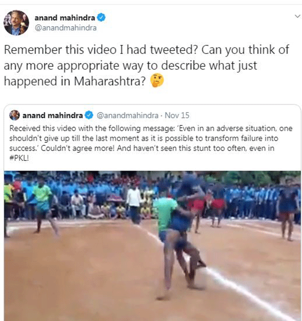 ಹಿಂದೆ ಟ್ವೀಟ್ ಮಾಡಿದ್ದ ತಮ್ಮ ವೀಡಿಯೊವನ್ನು ಮರುಟ್ವೀಟ್ ಮಾಡಿದ ಮಹೀಂದ್ರಾ, "ನಾನು ಟ್ವೀಟ್ ಮಾಡಿದ ಈ ವೀಡಿಯೊ ನೆನಪಿದೆಯೇ? ಮಹಾರಾಷ್ಟ್ರದಲ್ಲಿ ಇದೀಗ ನಡೆದದ್ದನ್ನು ಬಣ್ಣಿಸಲು ಇದಕ್ಕಿಂತ ಸೂಕ್ತ ಮಾರ್ಗ ಇದೆ ಎಂದು ನಿಮಗೆ ಅನಿಸುತ್ತದೆಯೇ?" ಎಂದು ಪ್ರಶ್ನಿಸಿದ್ದಾರೆ. ಆರ್ಪಿಜಿ ಸಮೂಹದ ಮುಖ್ಯಸ್ಥ, ಉದ್ಯಮಿ ಹರ್ಷ ಗೋಯೆಂಕಾ ಕೂಡಾ ಘಟನೆ ಬಗ್ಗೆ ಟ್ವೀಟ್ ಮಾಡಿದ್ದಾರೆ.