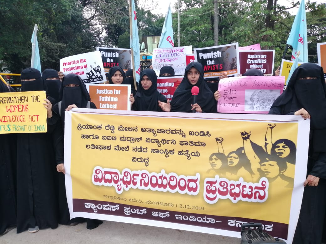 ಮಂಗಳೂರು, ಡಿ. 2: ಪ್ರಿಯಾಂಕ ರೆಡ್ಡಿ ಮೇಲಿನ ಅತ್ಯಾಚಾರವನ್ನು ಖಂಡಿಸಿ ಹಾಗೂ ಐಐಟಿ ಮದ್ರಾಸ್ ವಿದ್ಯಾರ್ಥಿನಿ ಫಾತಿಮಾ ಲತೀಫಾಳ ಹತ್ಯೆಯ ವಿರುದ್ಧ ದ.ಕ.ಜಿಲ್ಲಾಧಿಕಾರಿ ಕಚೇರಿ ಮುಂದೆ ಕ್ಯಾಂಪಸ್ ಫ್ರಂಟ್ ಆಫ್ ಇಂಡಿಯಾದ ವಿದ್ಯಾರ್ಥಿನಿಯರು ಸೋಮವಾರ ಪ್ರತಿಭಟನೆ ನಡೆಸಿತು.